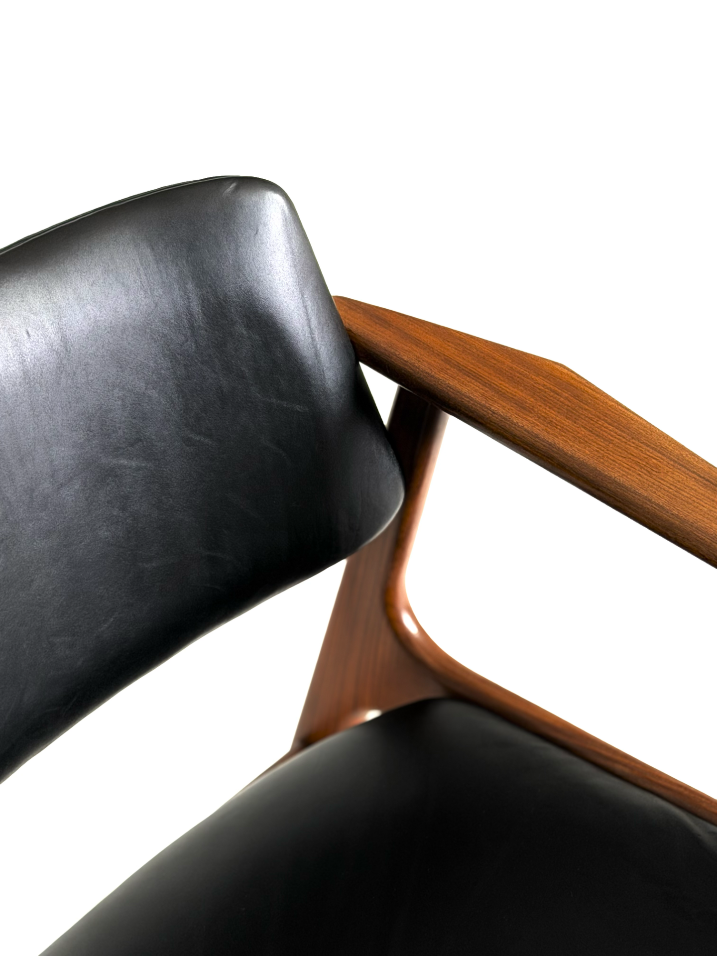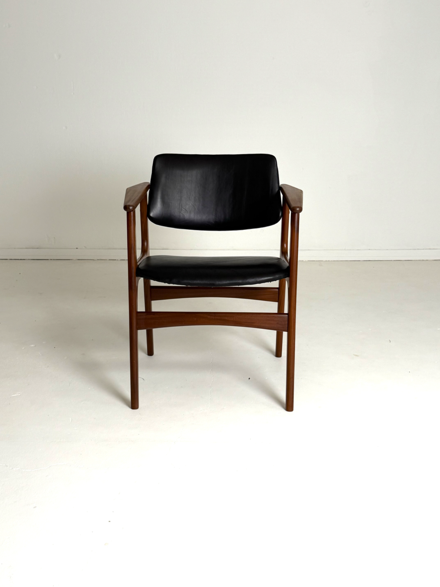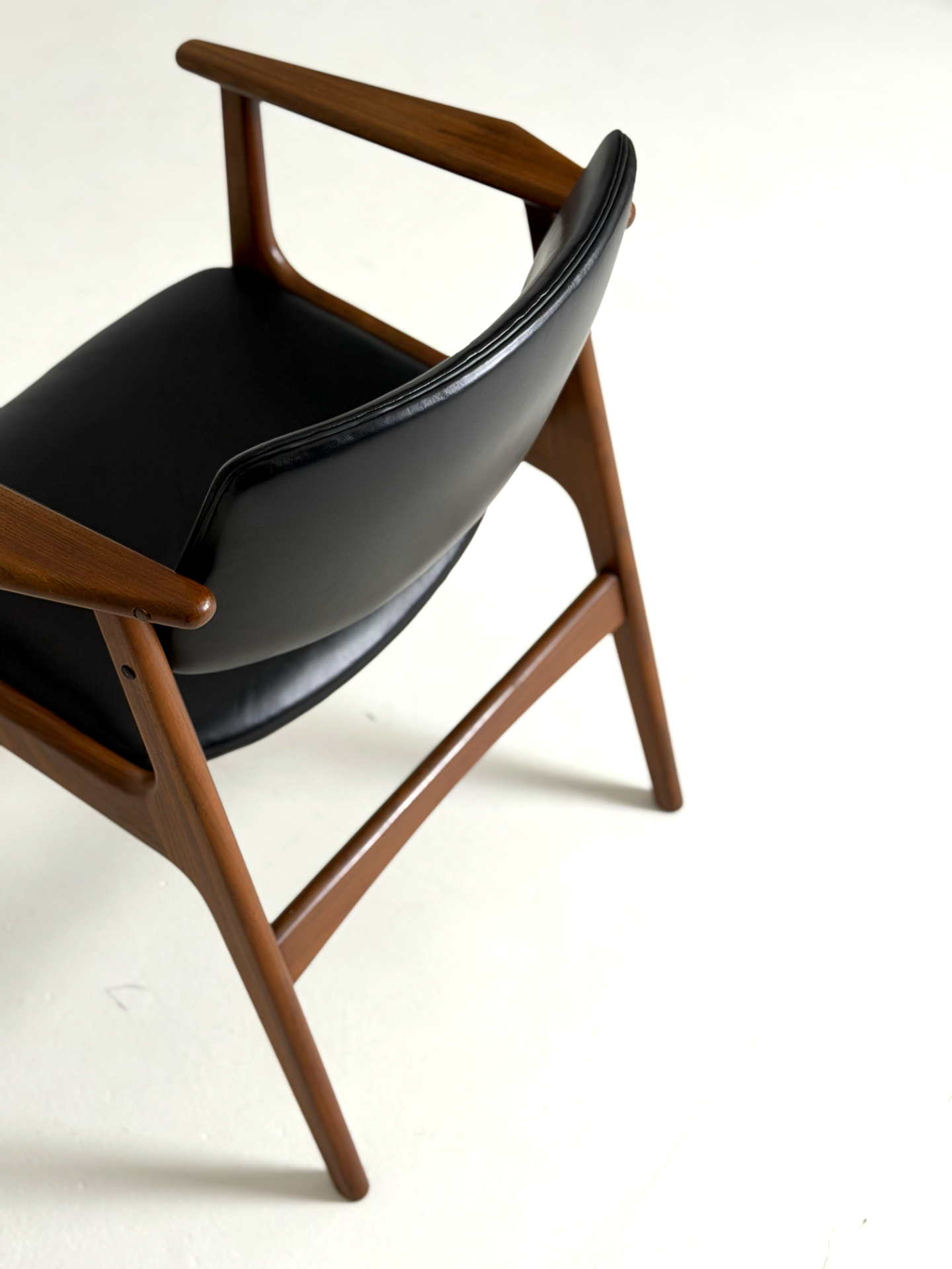 Arne Vodderin suunnittelema elegantti "Lene"-tuoli 1960-luvun Tanskasta. Valmistajana toimi Vamo Møbelfabrik. Tuolin runko on kauniisti muotoiltua tiikkiä, ja istuin sekä selkänoja on verhoiltu uudelleen mustalla kierrätysnahalla. Täydellinen yhdistelmä muotoilua, laatua ja kestävyyttä – ikoninen valinta työtuoliksi, ruokapöydän ääreen tai yksittäiseksi statement-huonekaluksi.