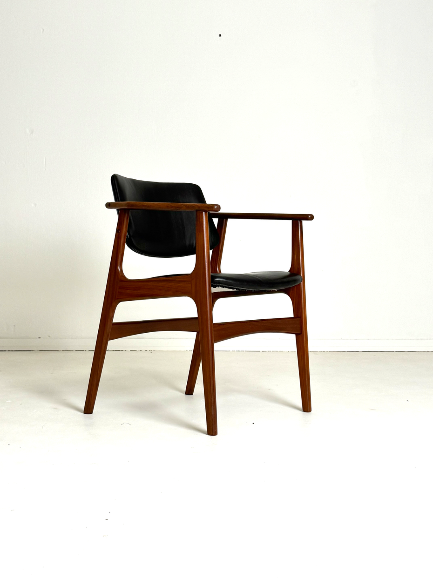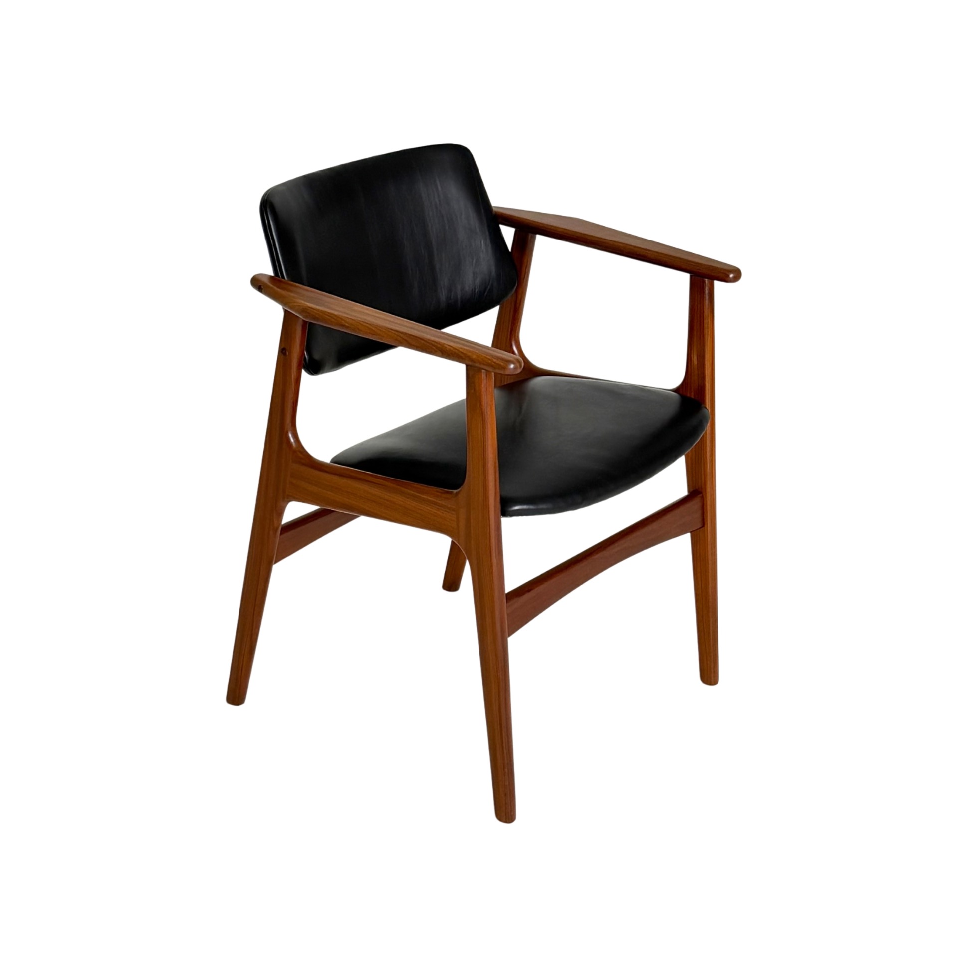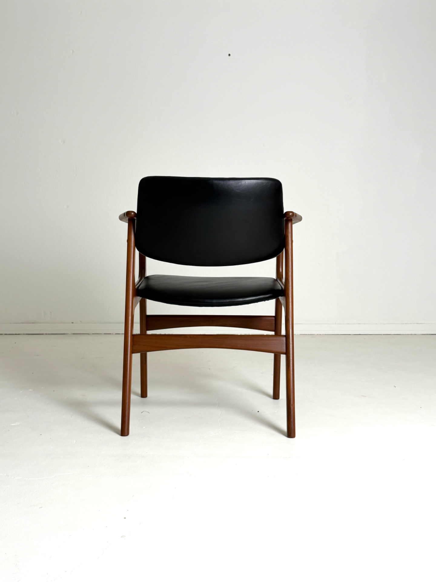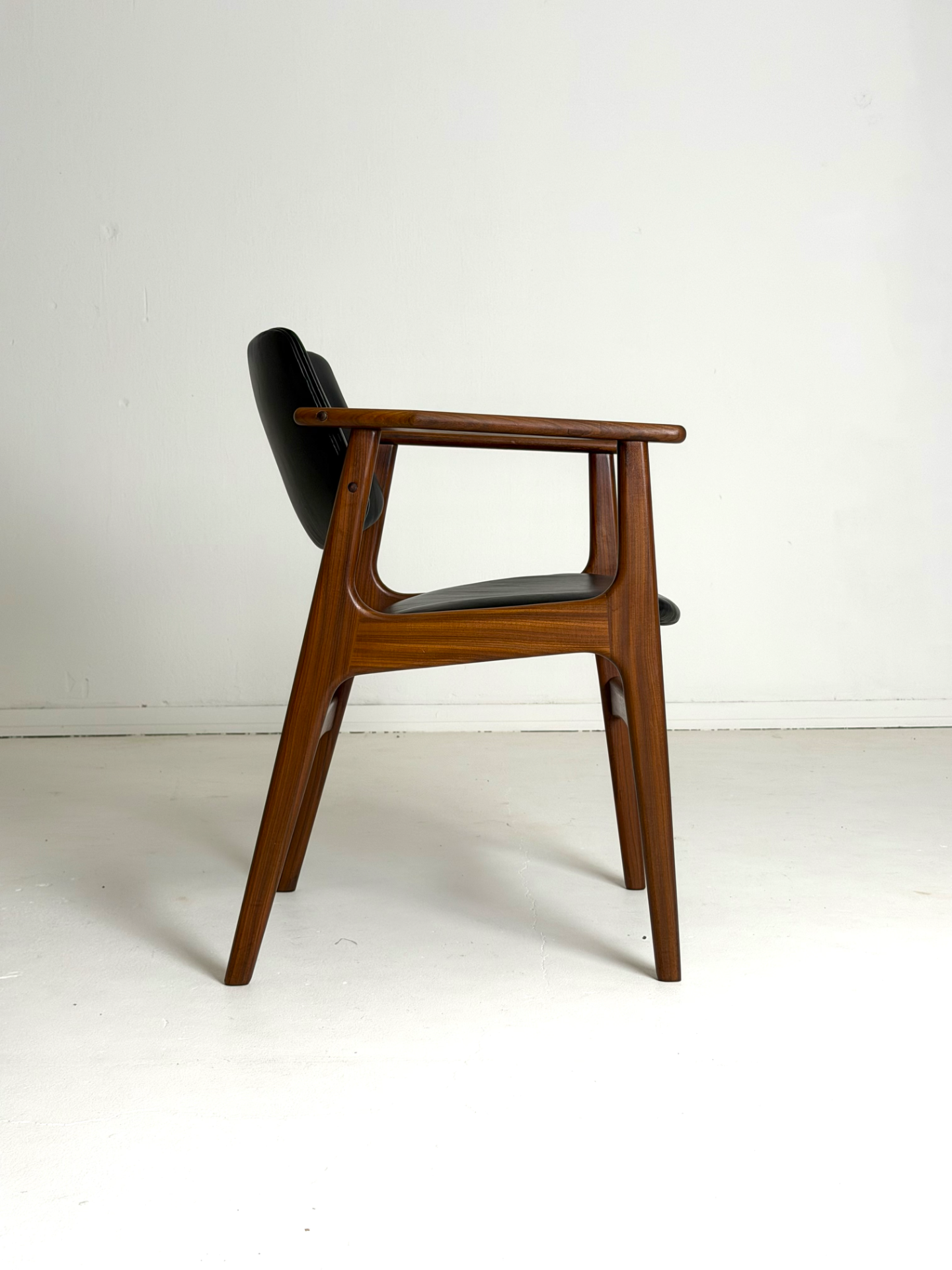 Arne Vodderin suunnittelema elegantti "Lene"-tuoli 1960-luvun Tanskasta. Valmistajana toimi Vamo Møbelfabrik. Tuolin runko on kauniisti muotoiltua tiikkiä, ja istuin sekä selkänoja on verhoiltu uudelleen mustalla kierrätysnahalla. Täydellinen yhdistelmä muotoilua, laatua ja kestävyyttä – ikoninen valinta työtuoliksi, ruokapöydän ääreen tai yksittäiseksi statement-huonekaluksi.