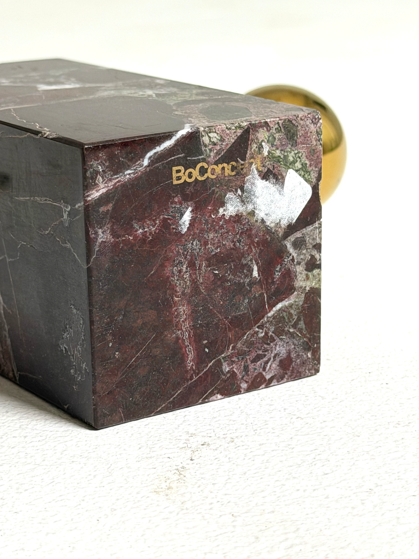 Moderni ja veistoksellinen BoConceptin kynttilänjalka, jossa yhdistyvät näyttävä tummasävyinen marmori ja kiiltävä messinki. Tanskalainen design 2010-luvulta tuo sisustukseen eleganttia kontrastia ja nykyaikaista ilmettä.
