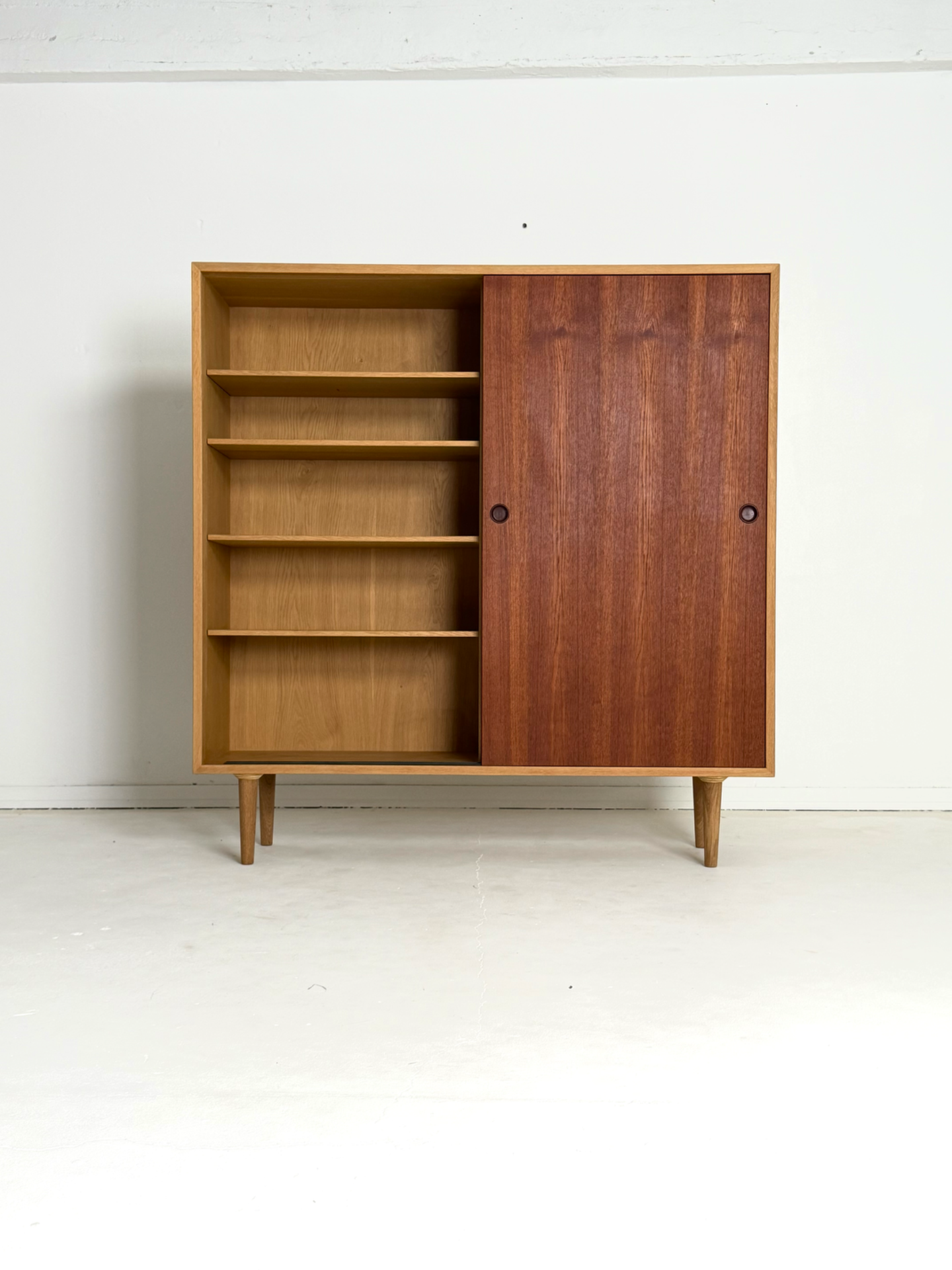Suuri Öresund-sarjan vintage-kaappi, suunnittelija Børge Mogensen. Valmistaja ruotsalainen Karl Andersson & Söner. Kaapin runko on kauniisti patinoitunutta saippuoitua tammea ja ovet tiikkiä. Liukuovet ja sirot, kartiomaiset jalat korostavat skandinaavista keveyttä ja ajattomuutta. Sisäpuolella käytännölliset hyllyt ja yksi säilytyslaatikko. Elegantti ja arvostettu designklassikko 1950–60-luvulta.