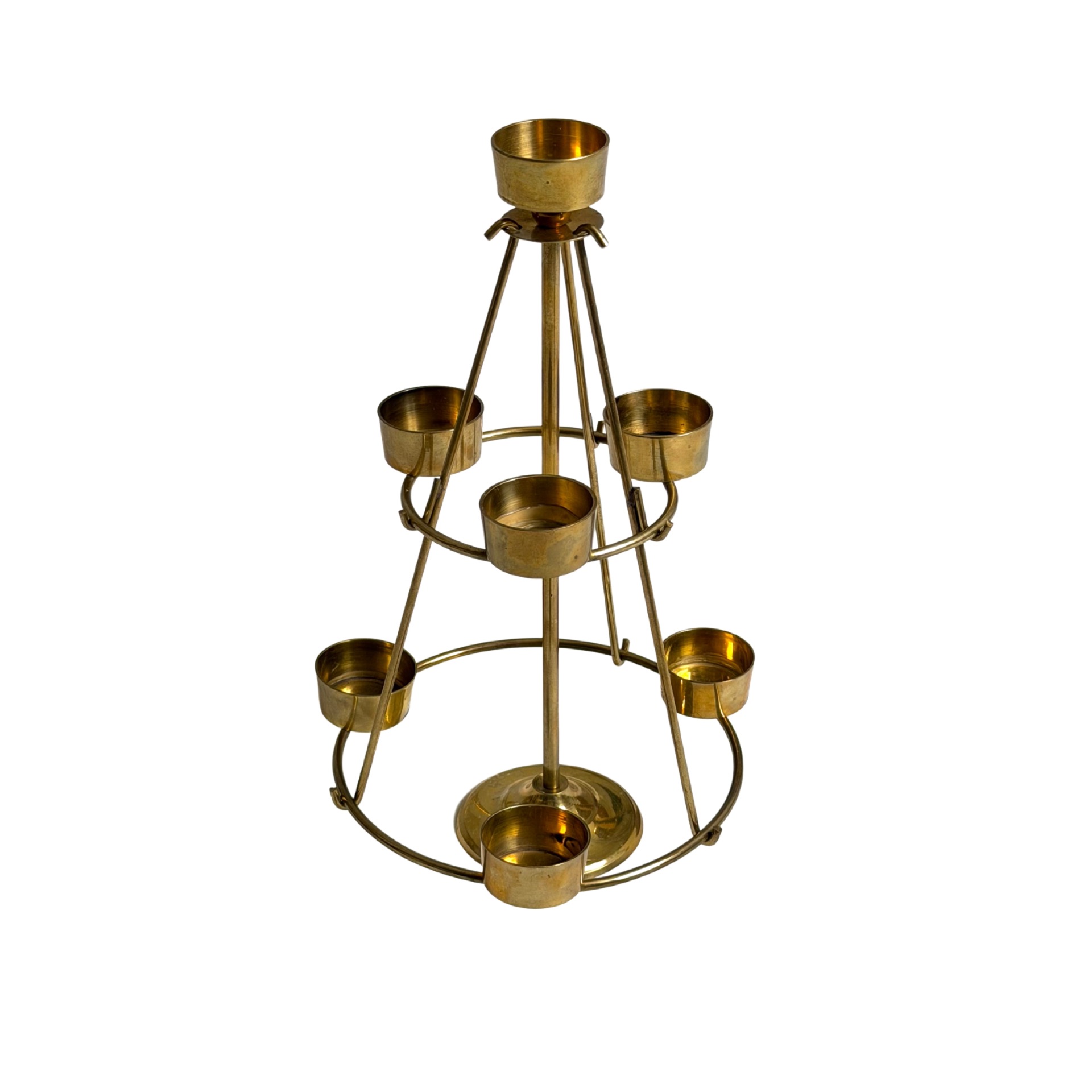 This brass candelabra in the shape of a Christmas tree is a beautiful and atmospheric addition to your holiday decor. Designed to hold seven tealights, its airy and sculptural form brings warmth and light to any space. Made in Denmark in the mid-20th century. In vintage condition.