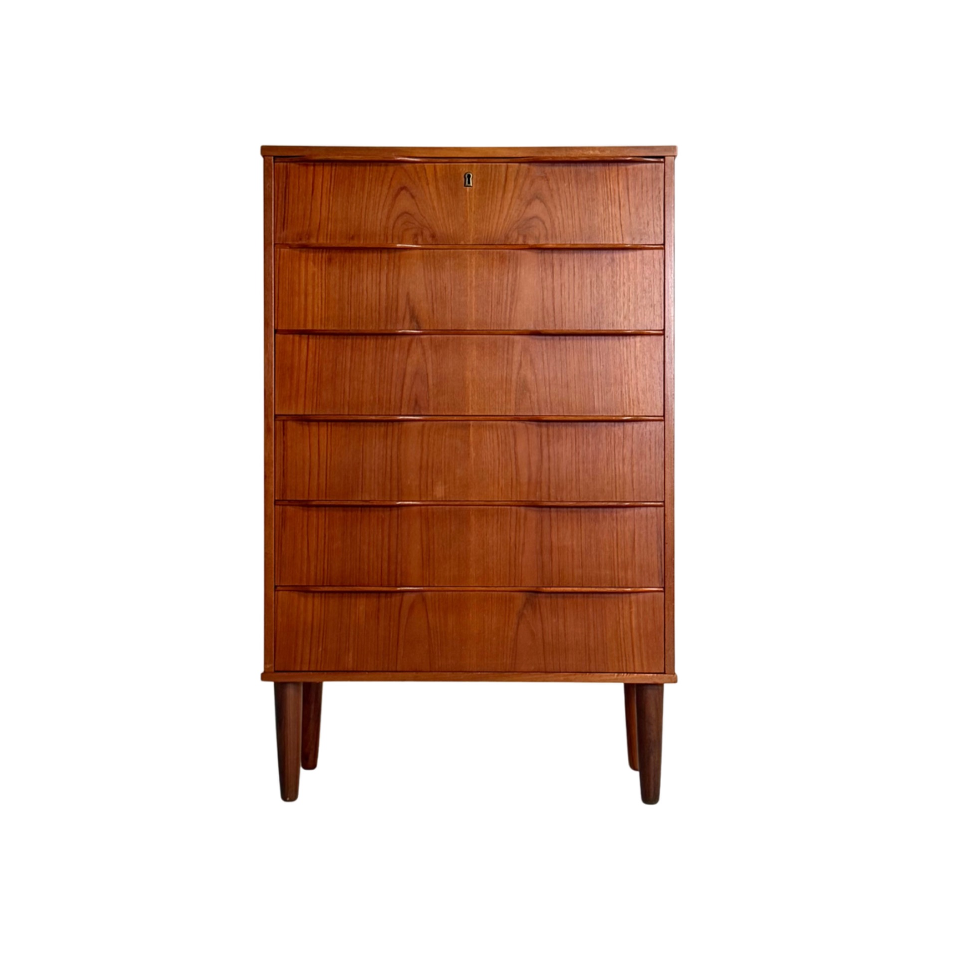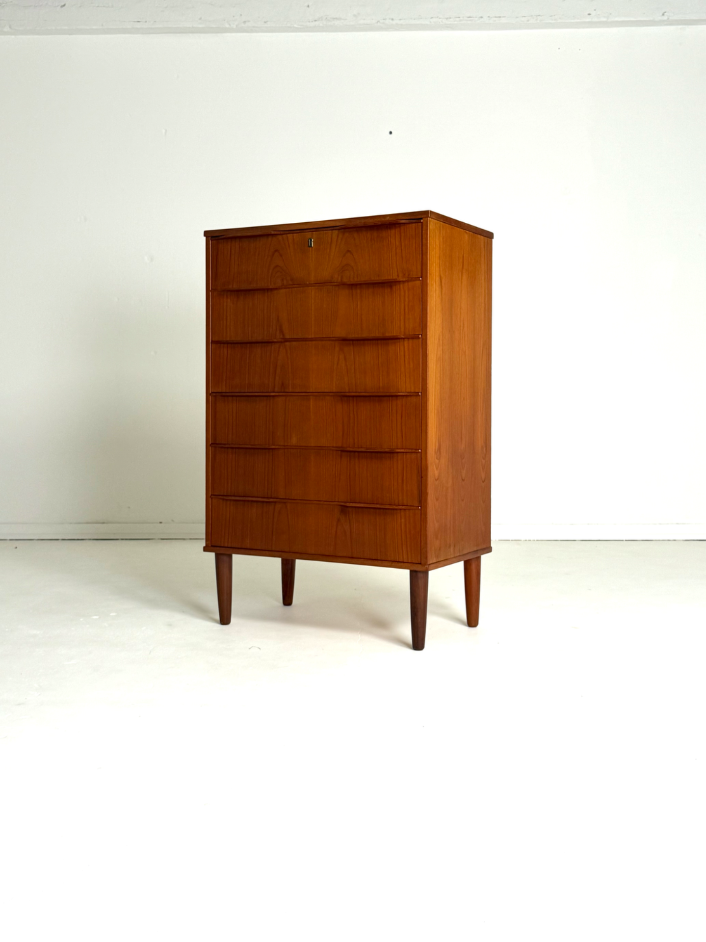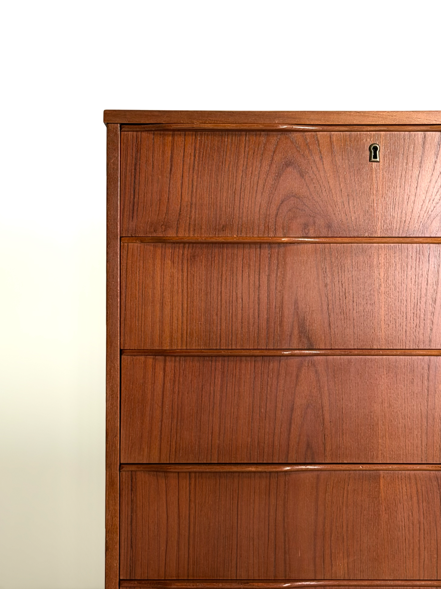 Elegant Danish vintage chest of drawers from the 1960s, made by SI Bomi Møbler. The piece features six drawers with integrated curved handles that highlight the rich teak grain. A minimalist and functional storage solution for the bedroom or hallway.