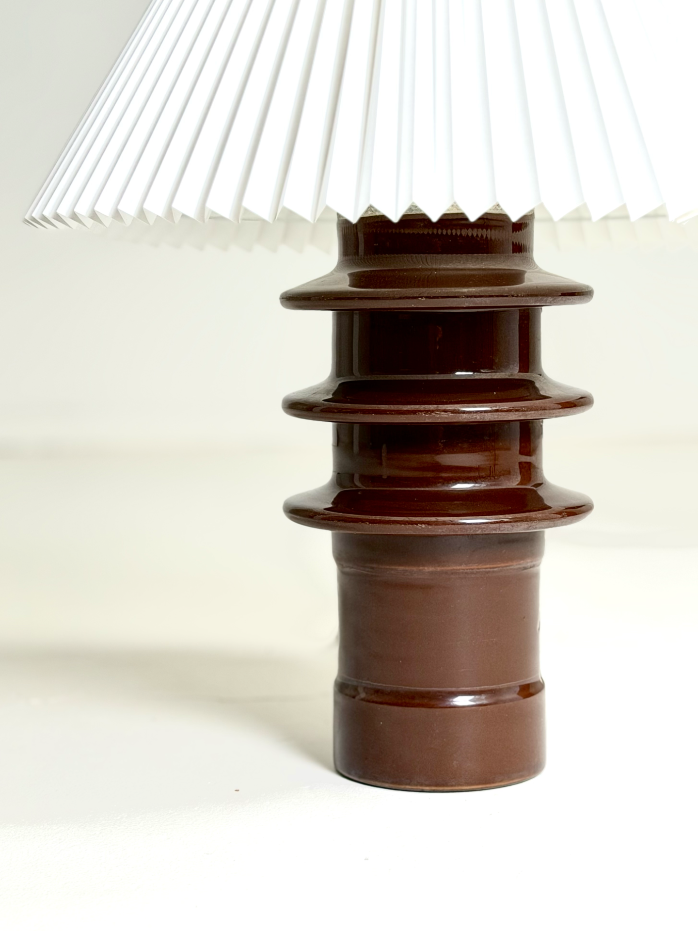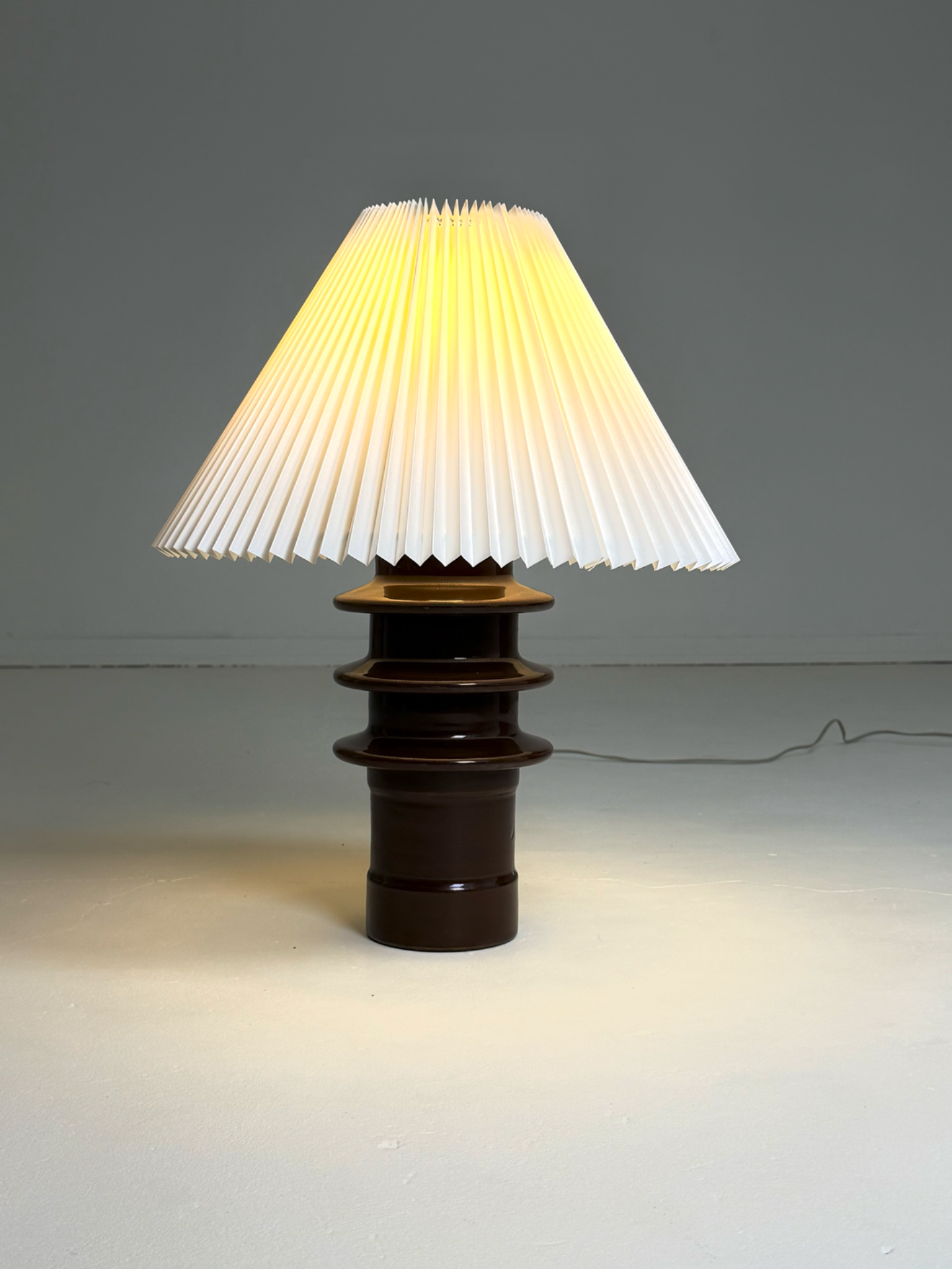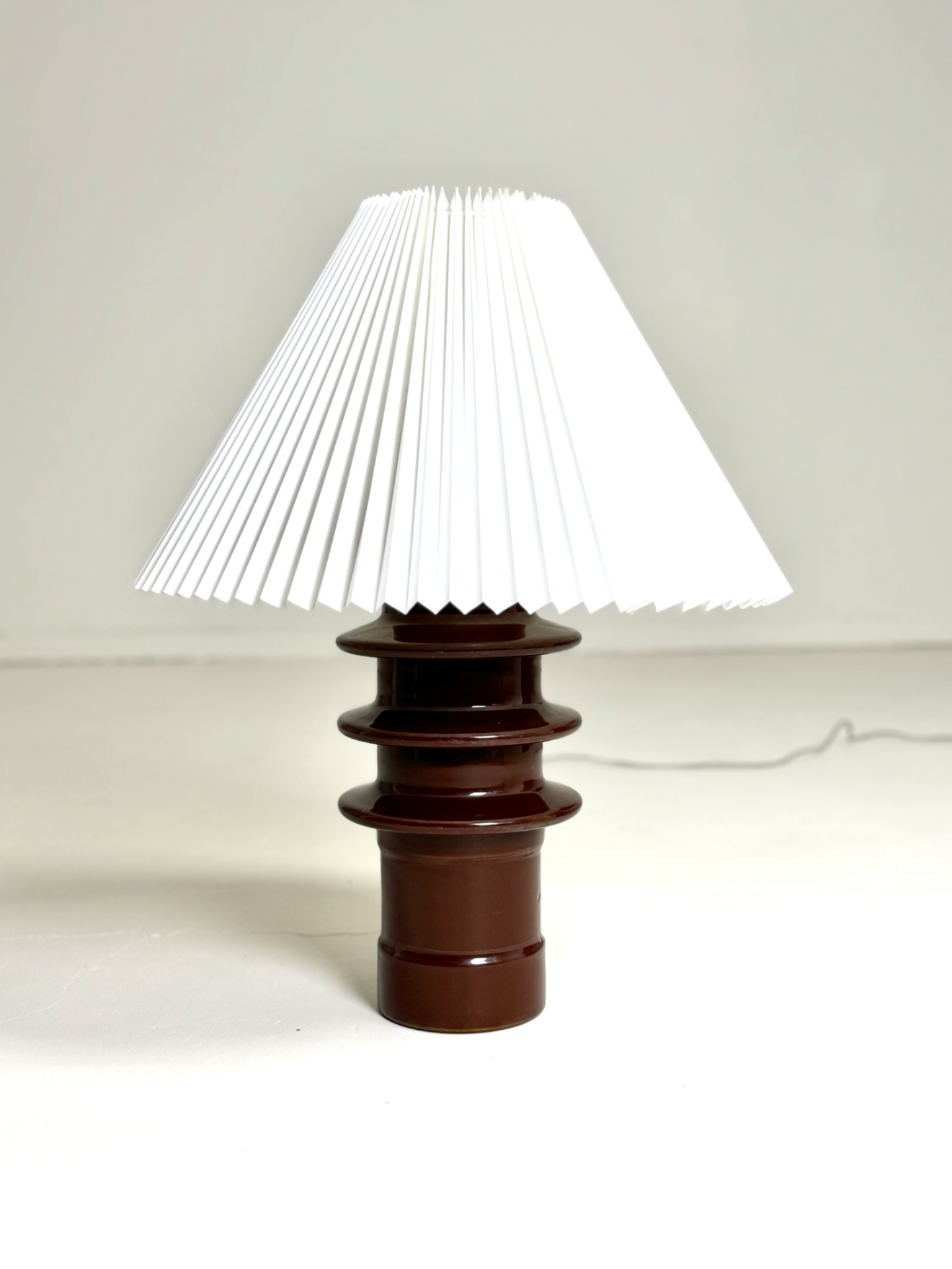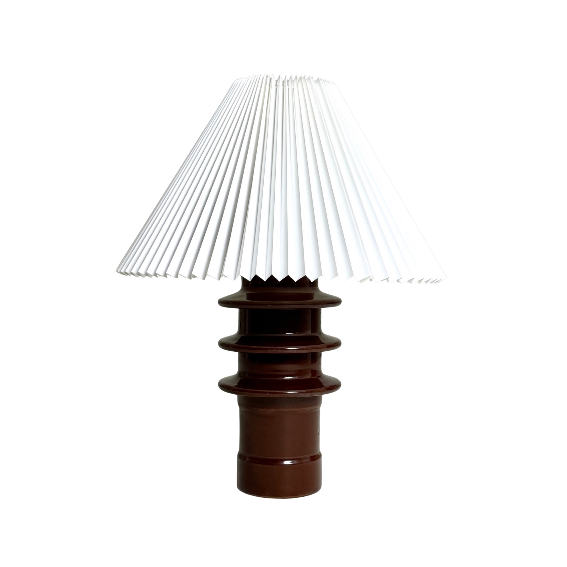 A striking Danish vintage table lamp from the 1960s–70s with a tall, sculptural brown ceramic base and a classic pleated white lampshade. The lamp combines retro character with soft lighting, making it a stylish addition to any interior.