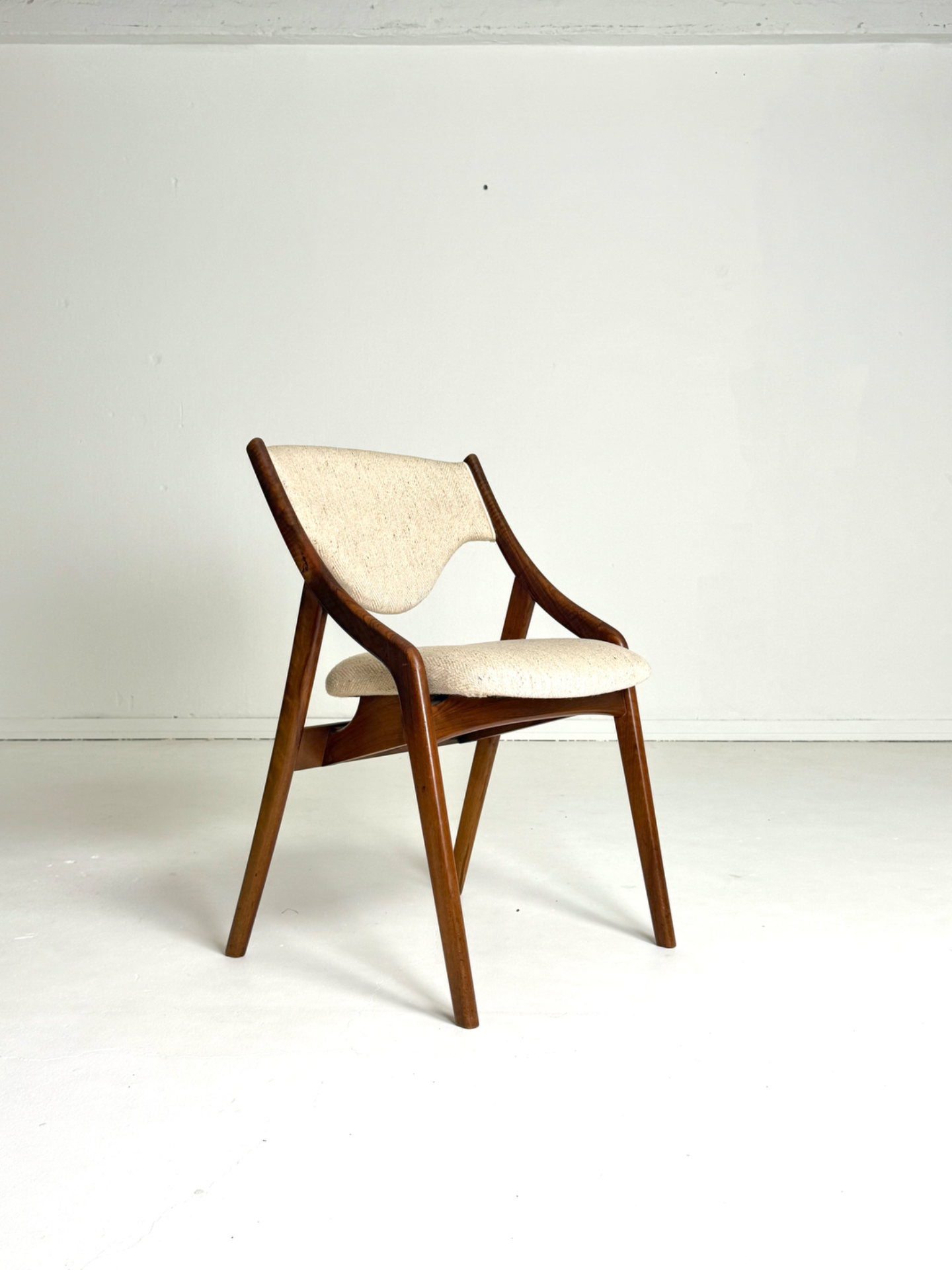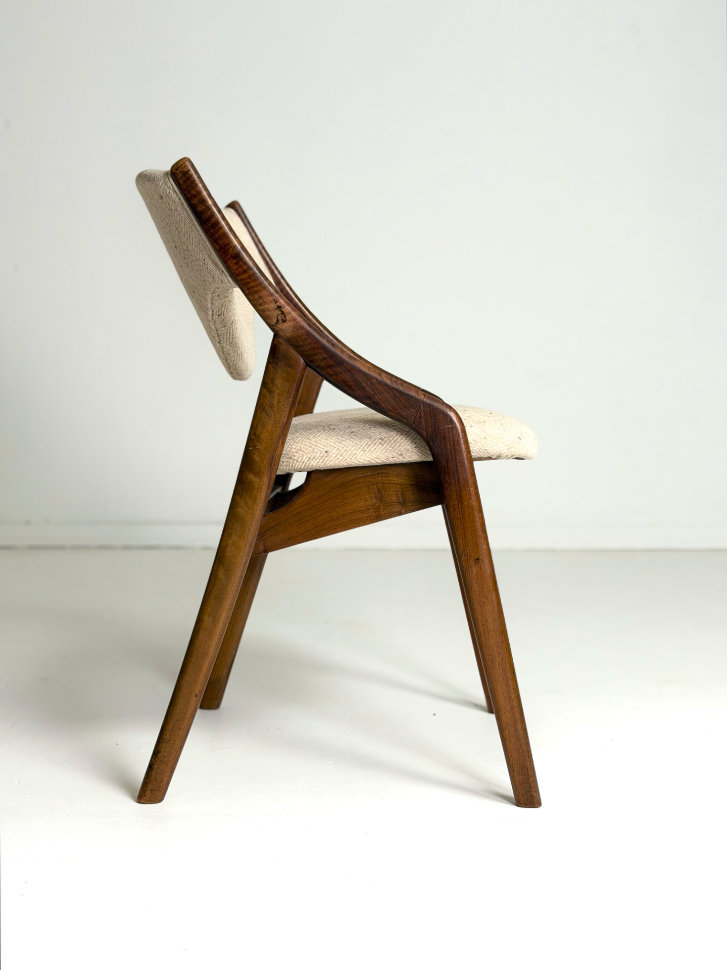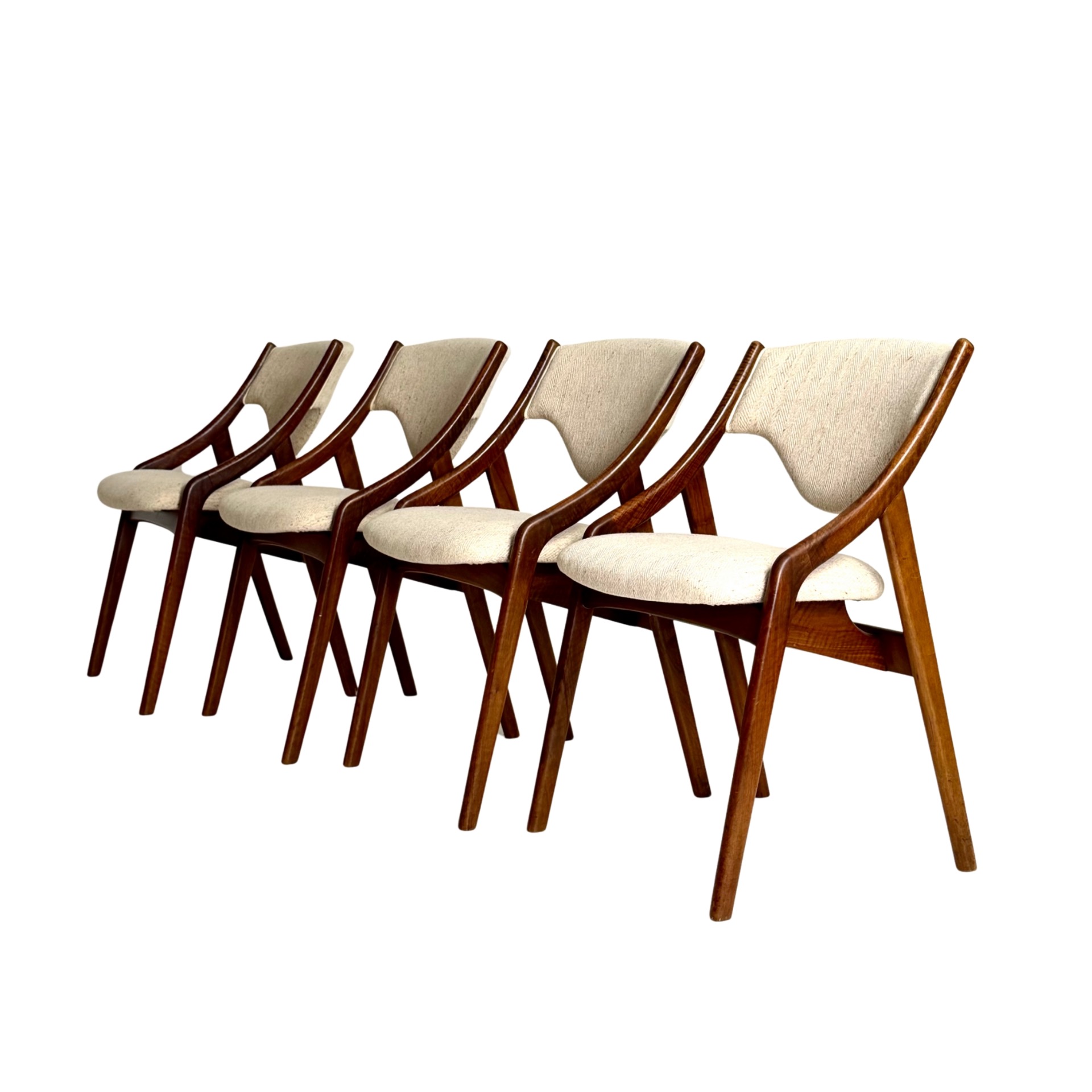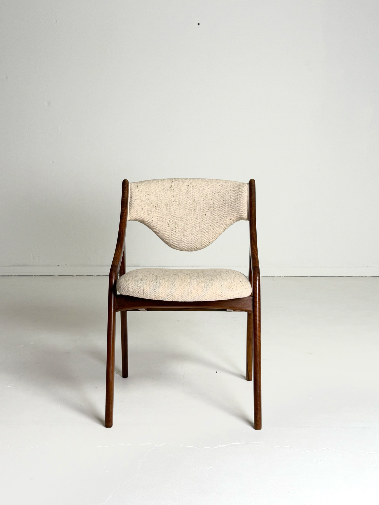 A beautiful set of four Danish teak dining chairs from the 1960s. Featuring an elegant and sculptural design with curved armrests and excellent seating comfort. The chairs have been reupholstered in a high-quality light wool fabric, giving them a refined and timeless look. A perfect addition to any dining space with a touch of mid-century charm.