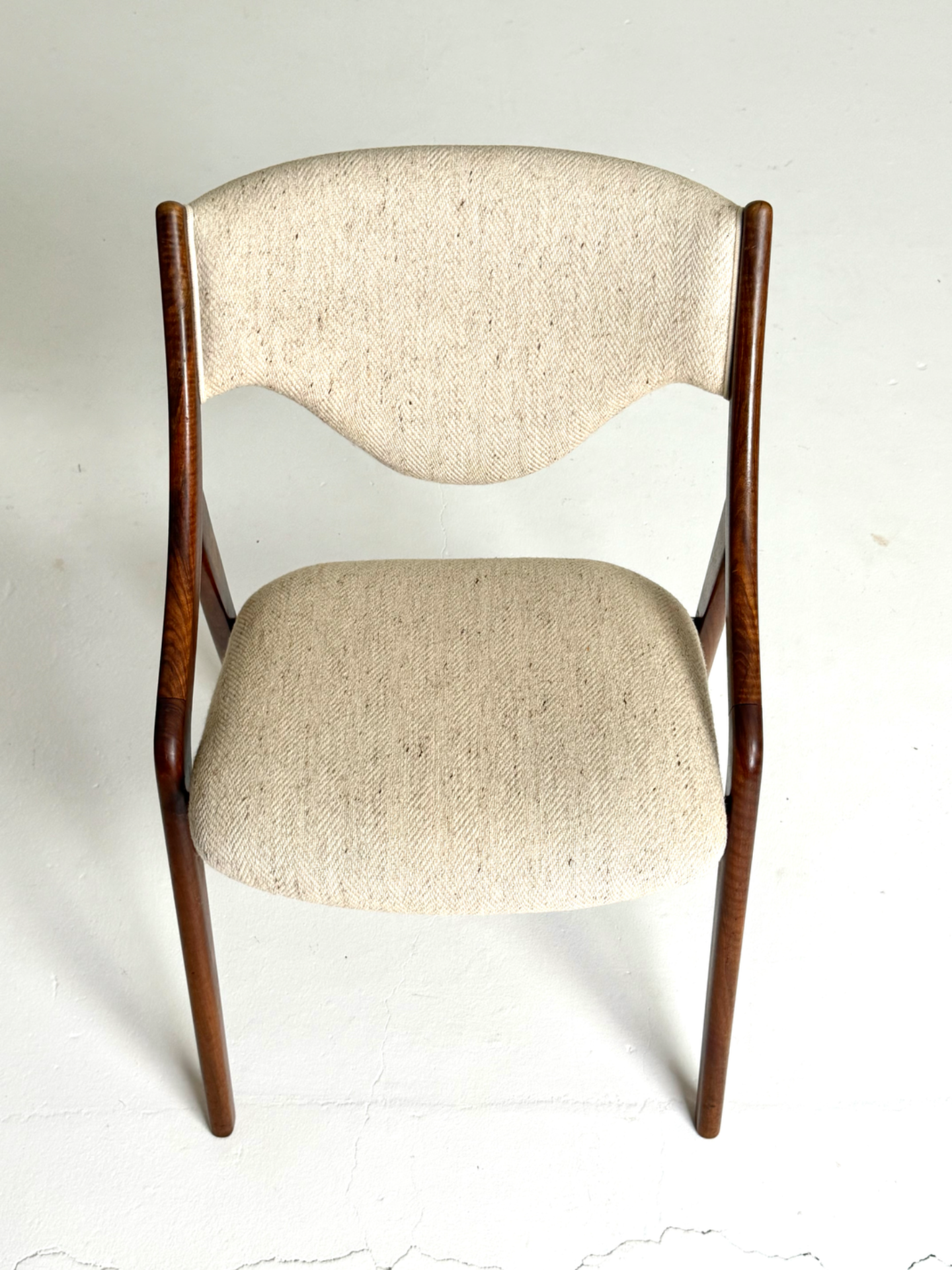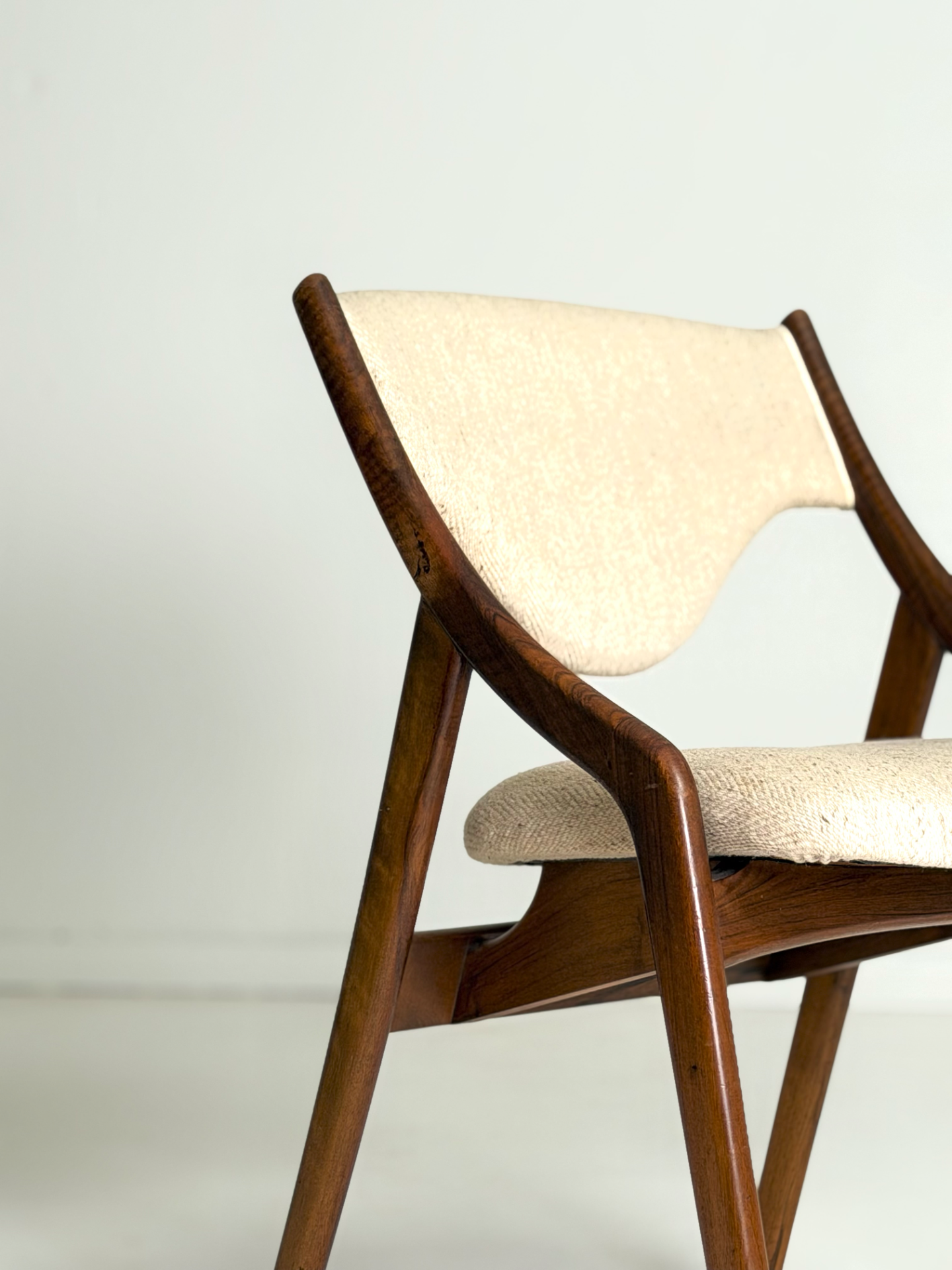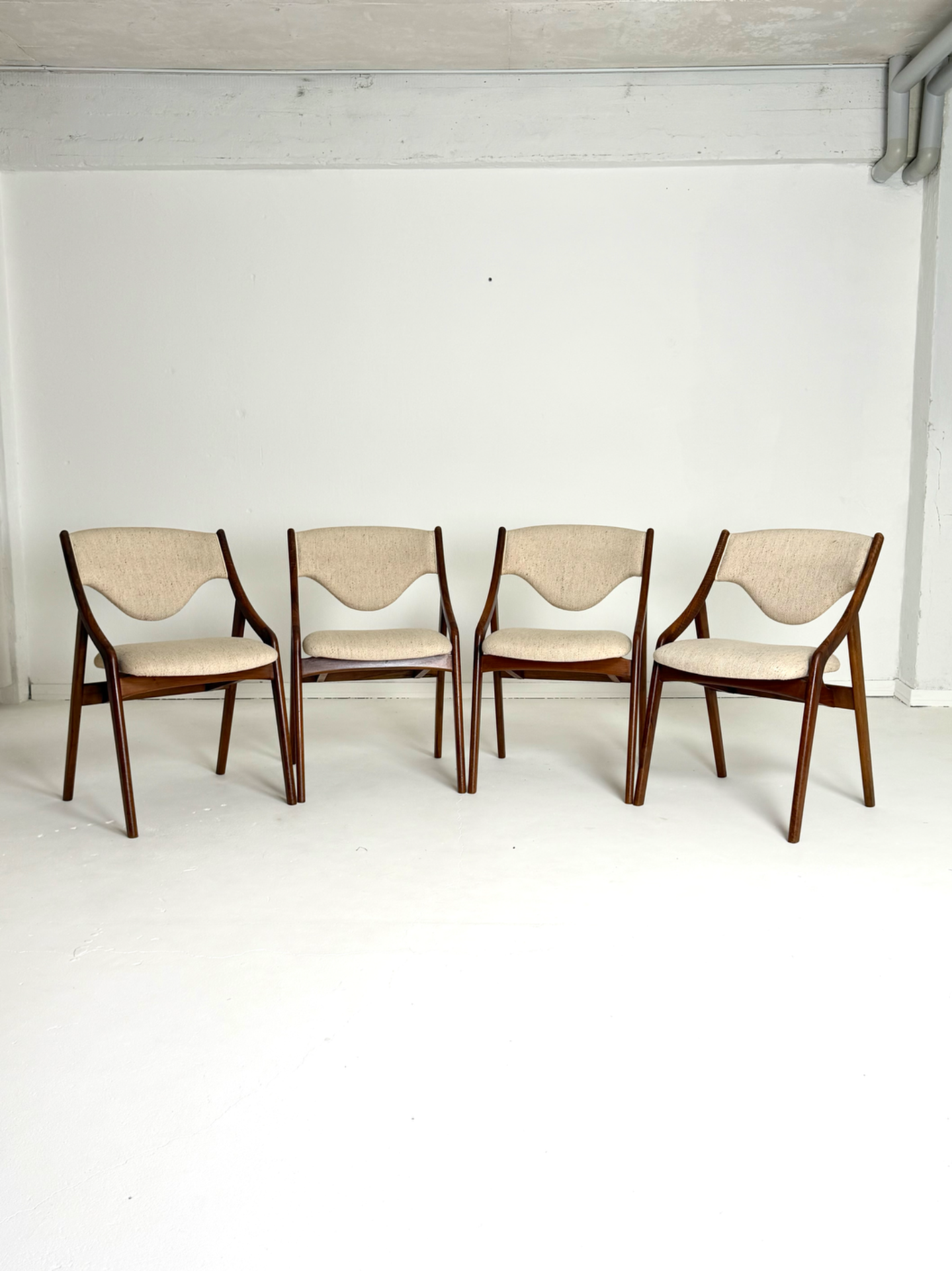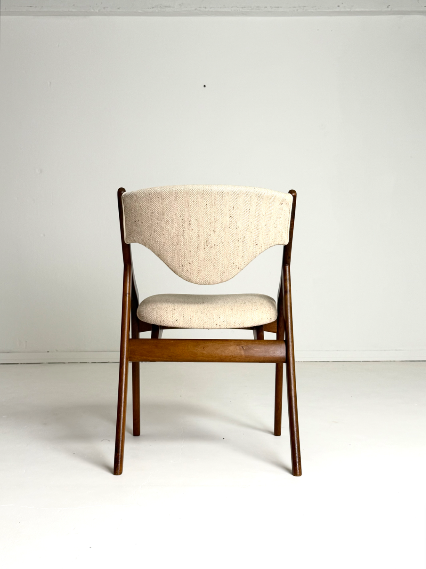 A beautiful set of four Danish teak dining chairs from the 1960s. Featuring an elegant and sculptural design with curved armrests and excellent seating comfort. The chairs have been reupholstered in a high-quality light wool fabric, giving them a refined and timeless look. A perfect addition to any dining space with a touch of mid-century charm.