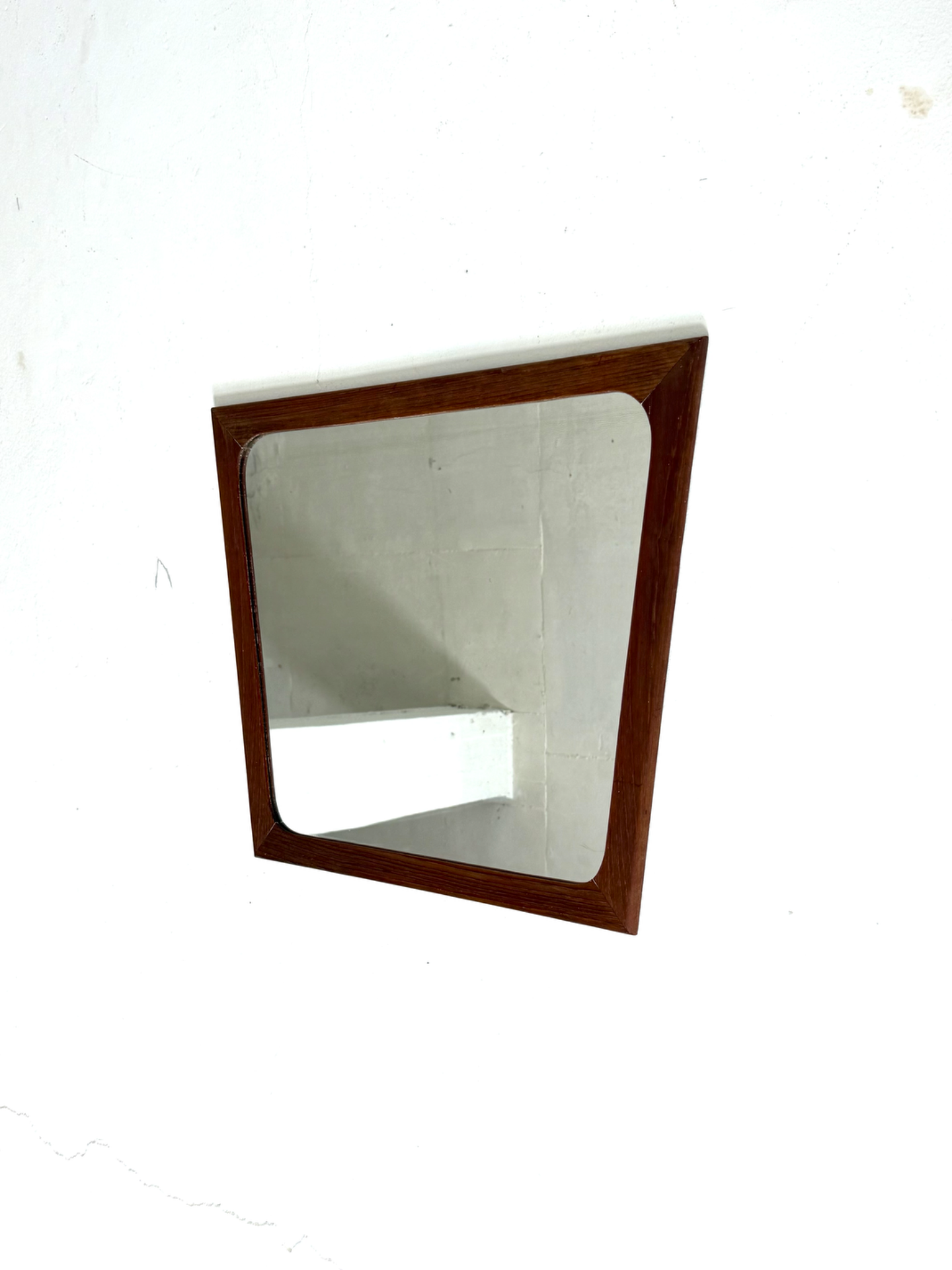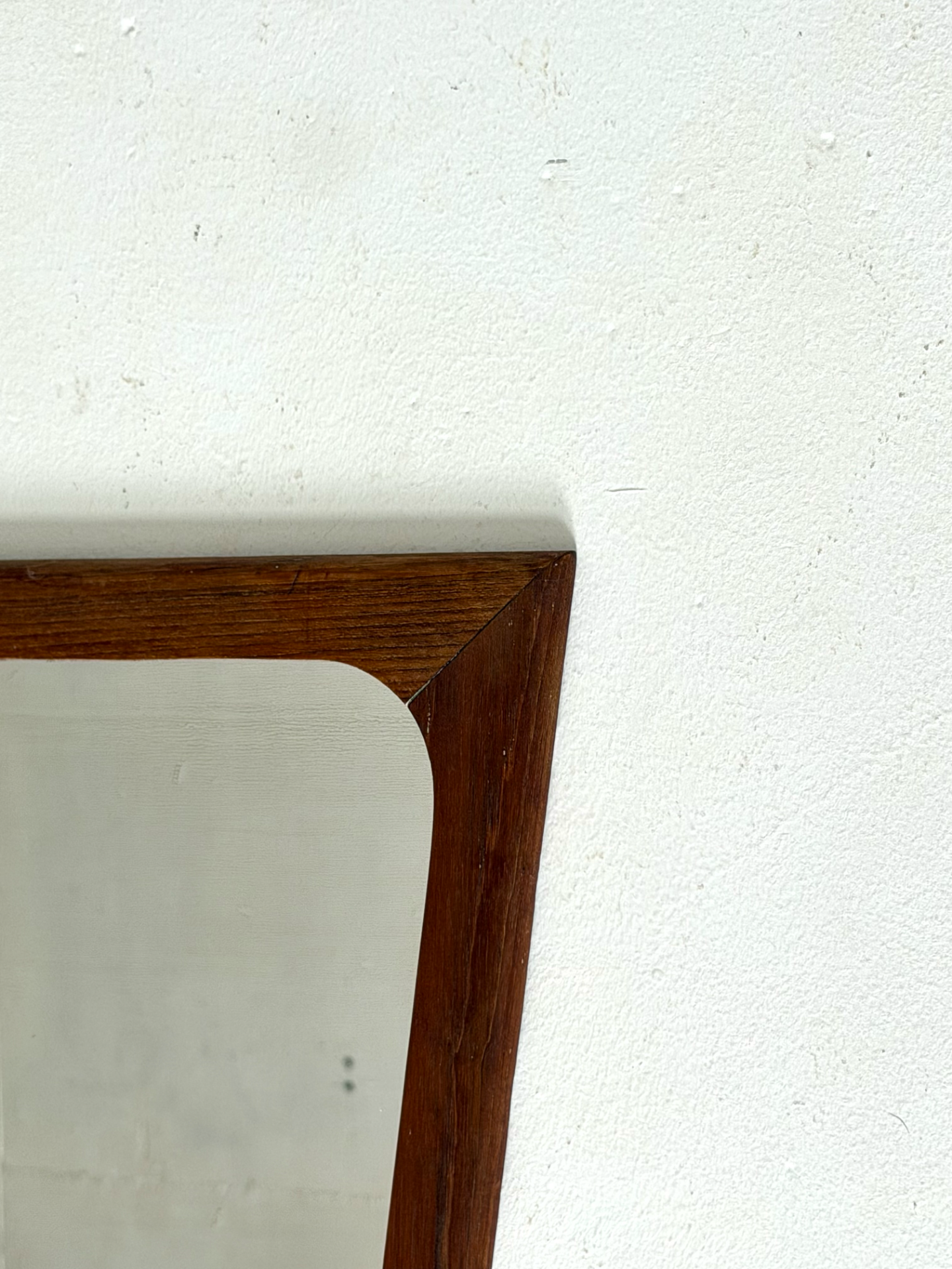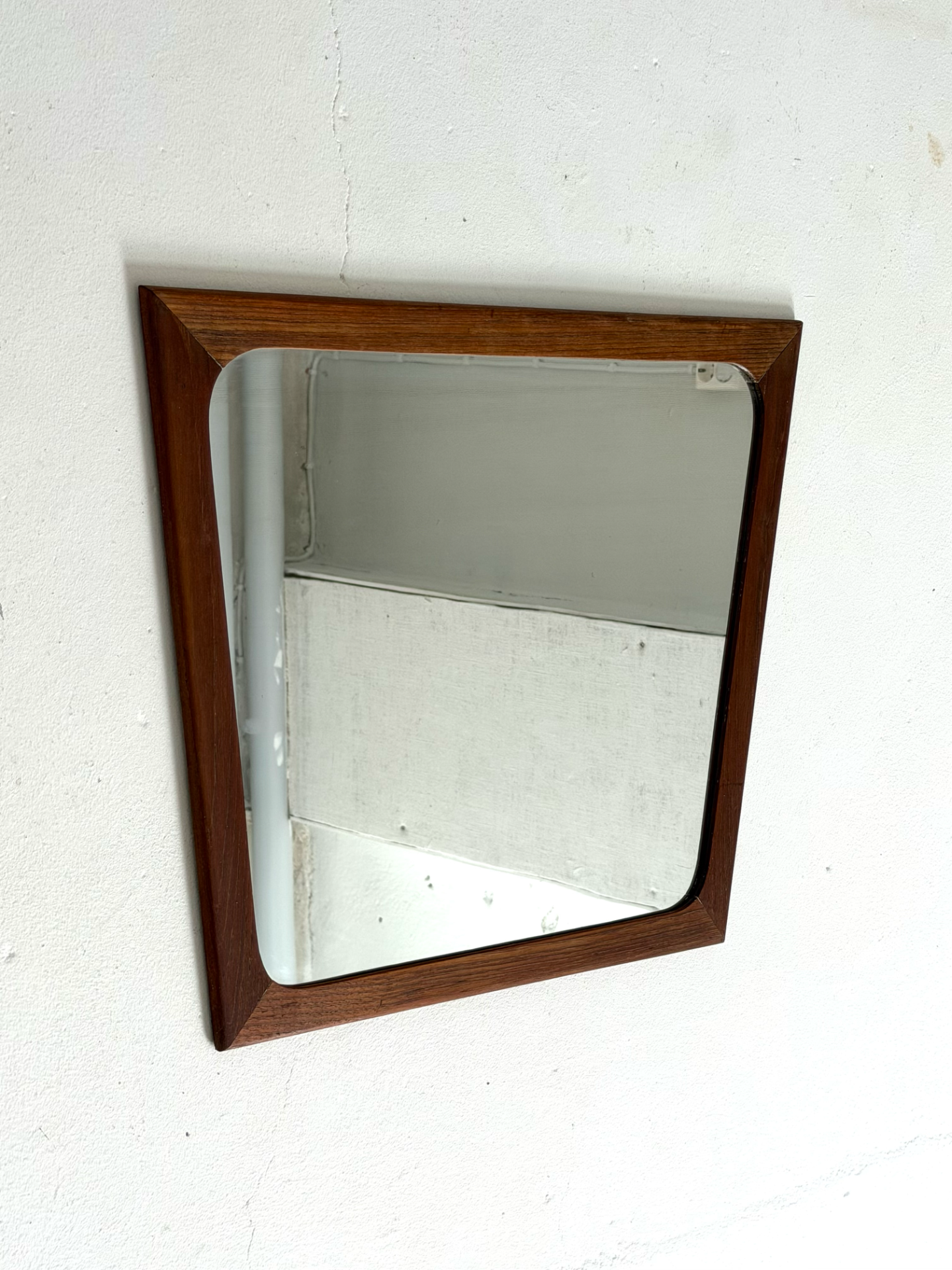 A stylish Danish wall mirror from the 1960s, featuring a beautifully shaped teak frame with soft, organic lines. The gently curved sides and precisely finished corners reflect the timeless elegance of Scandinavian design.