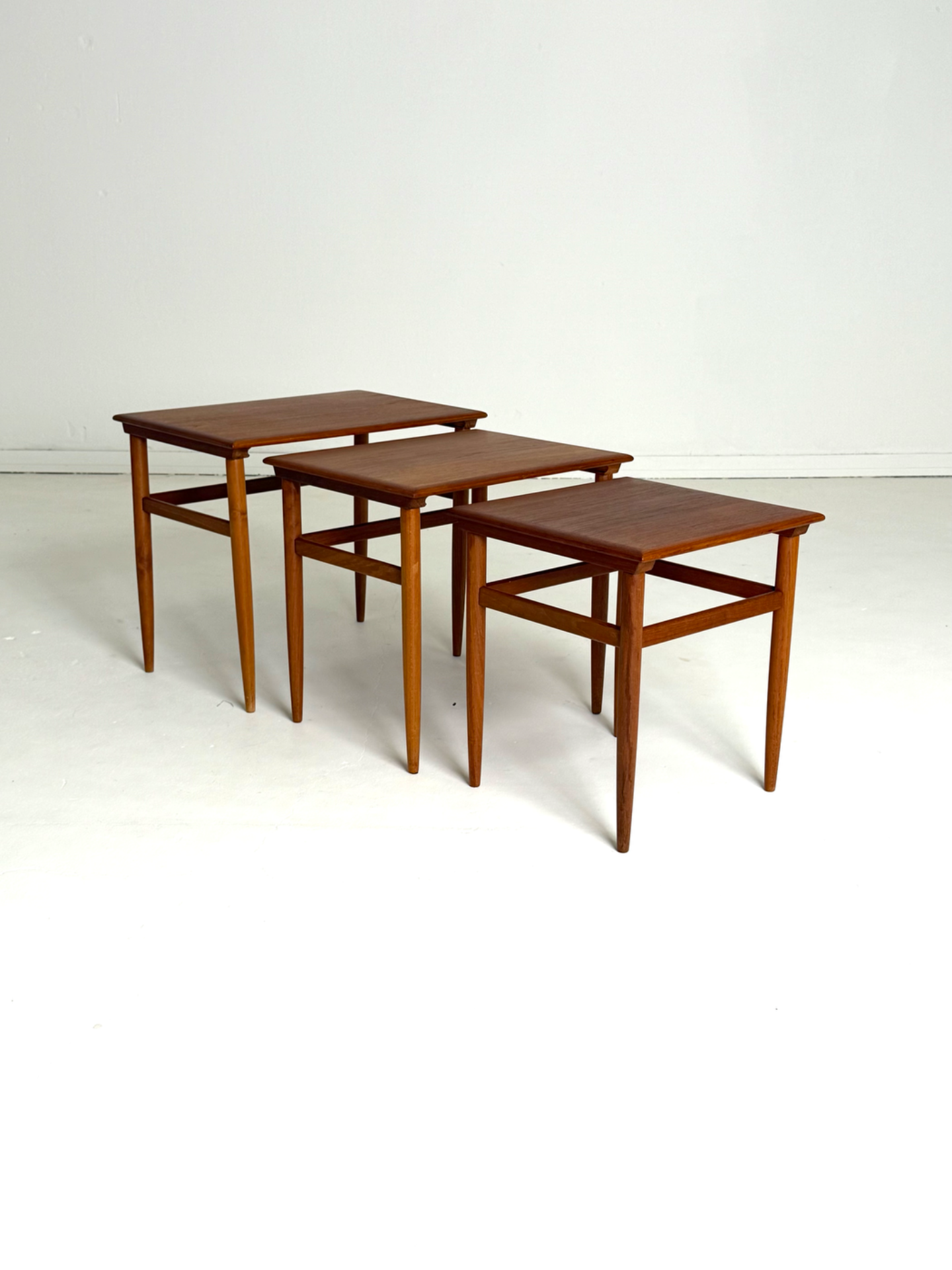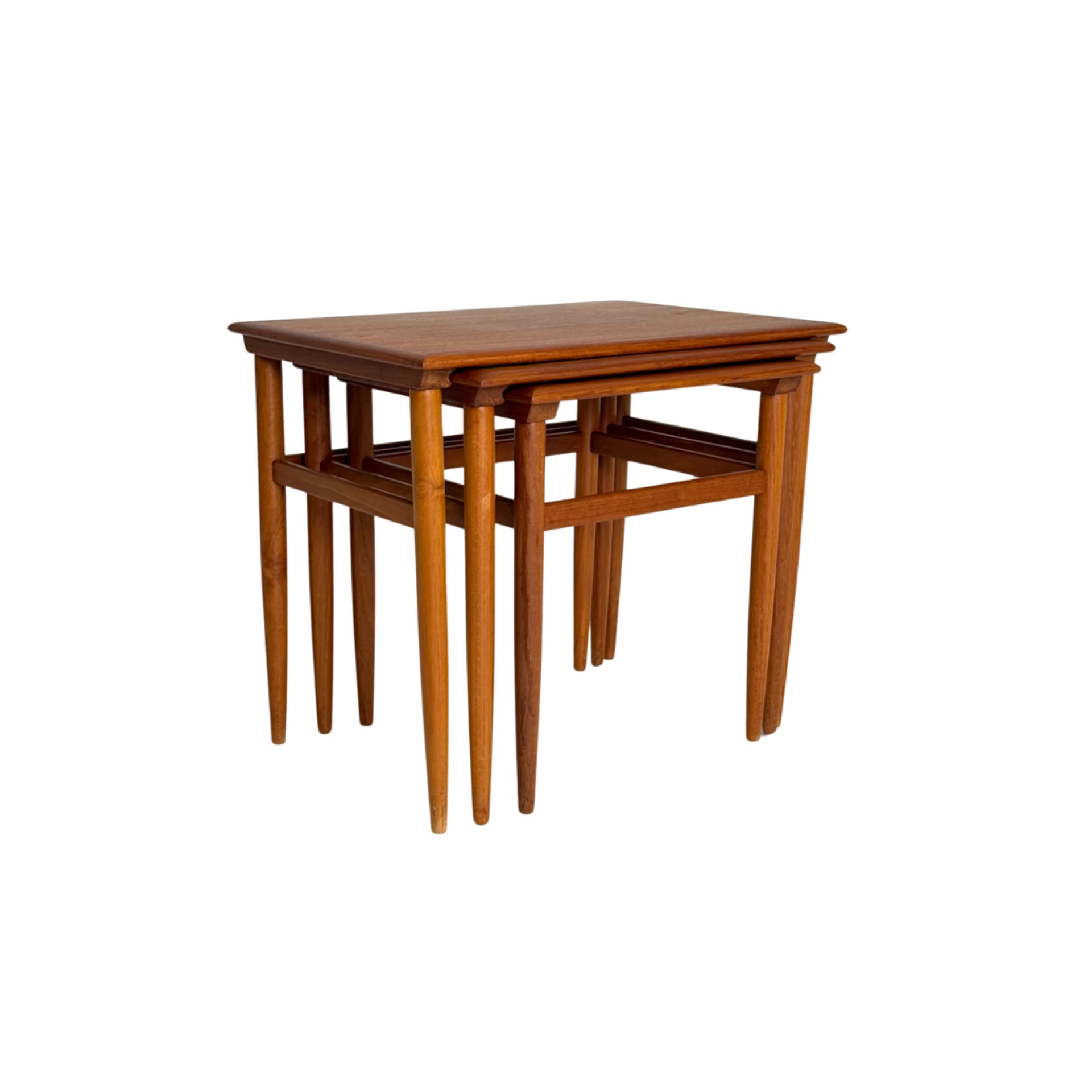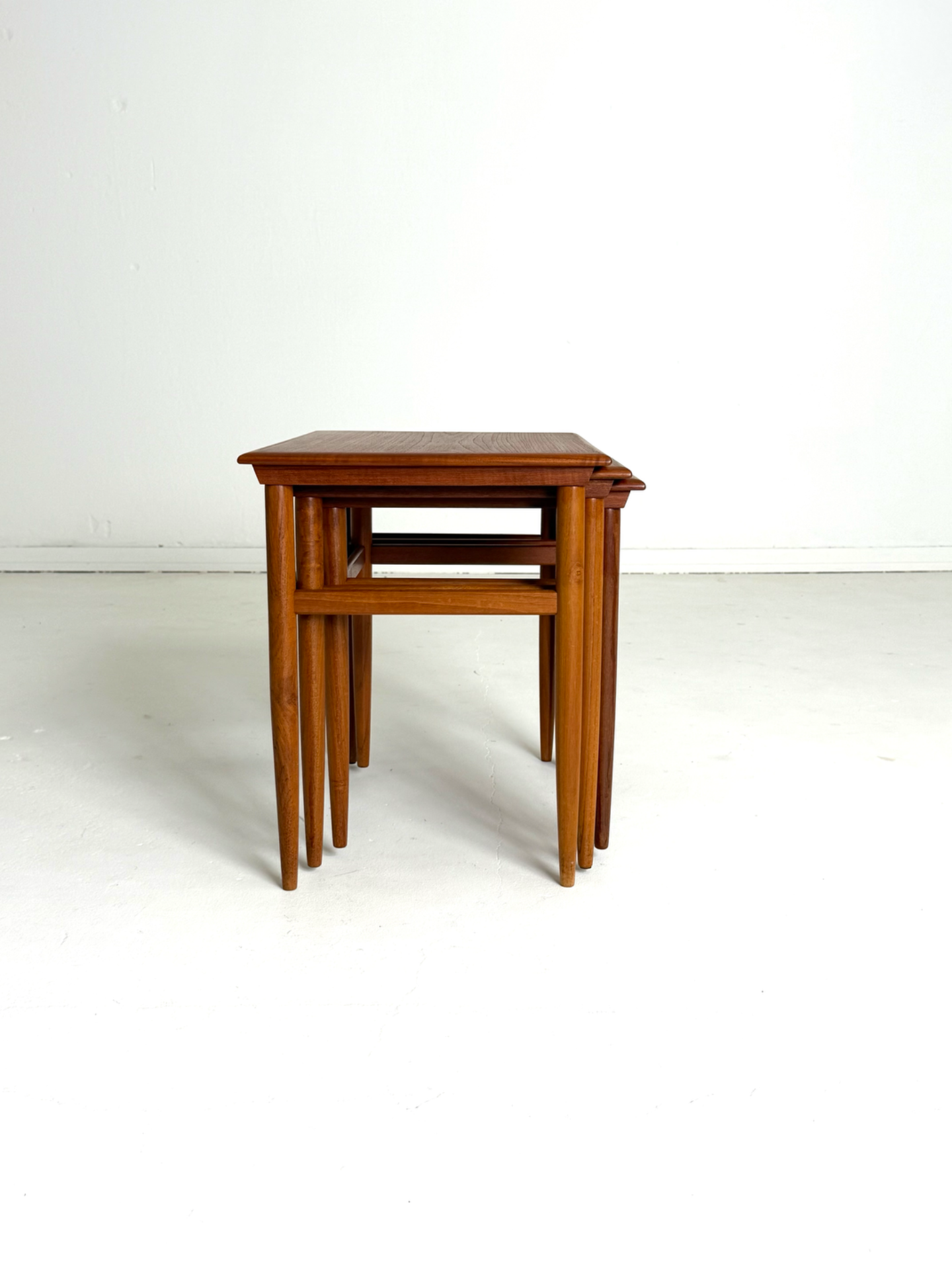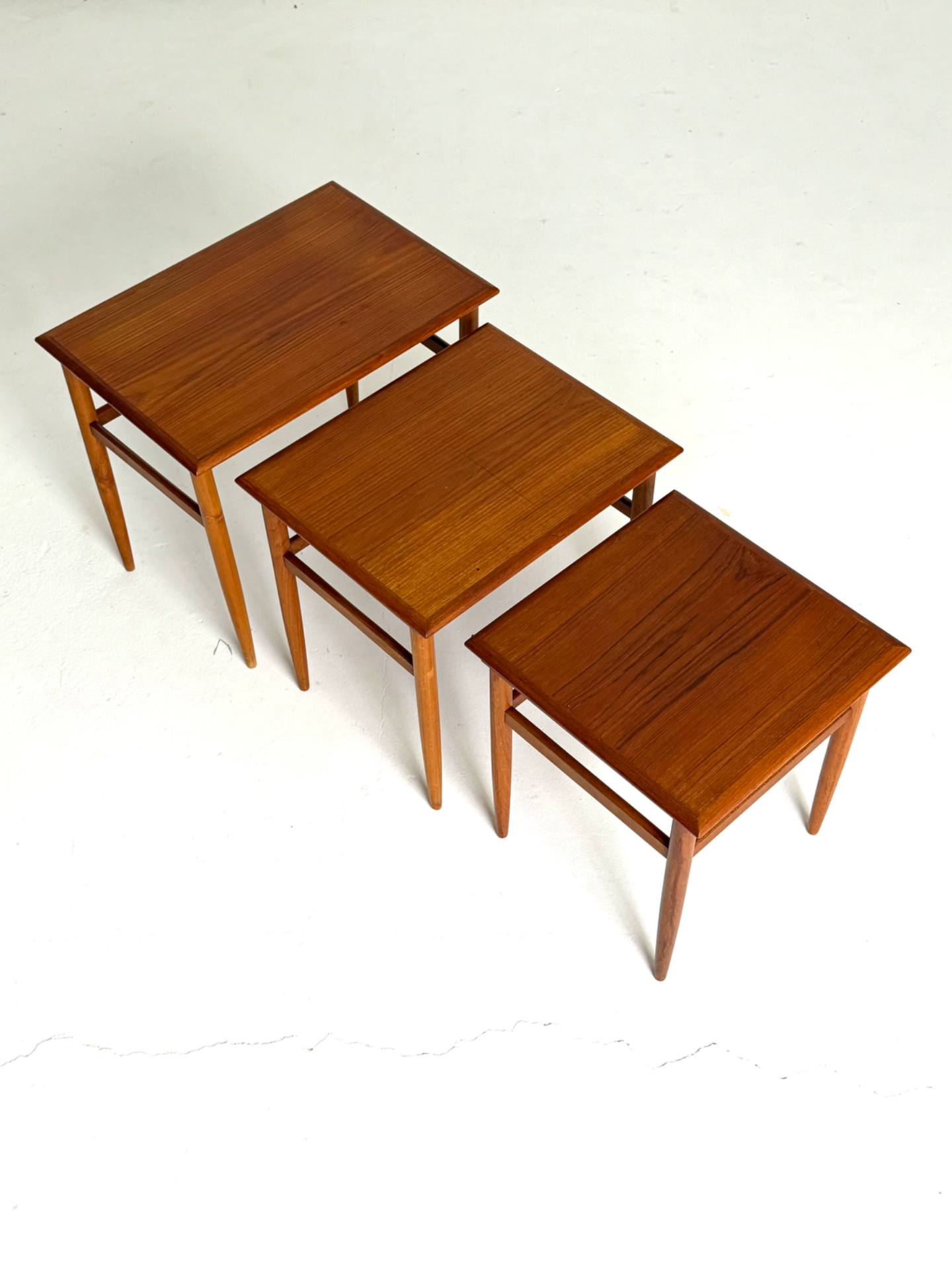 A timeless set of Danish teak nesting tables from the 1960s. Crafted from warm-toned teak wood with refined details and tapered legs, this set includes three tables that slide smoothly under each other. A classic example of mid-century Scandinavian design—both functional and beautiful. Ideal as side tables or for versatile everyday use.