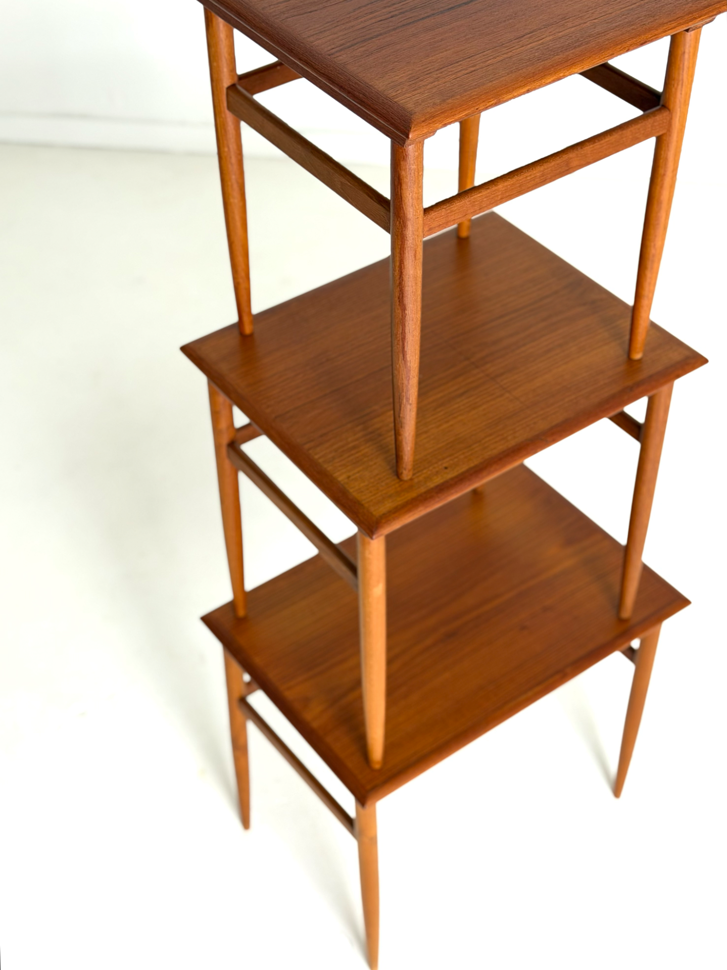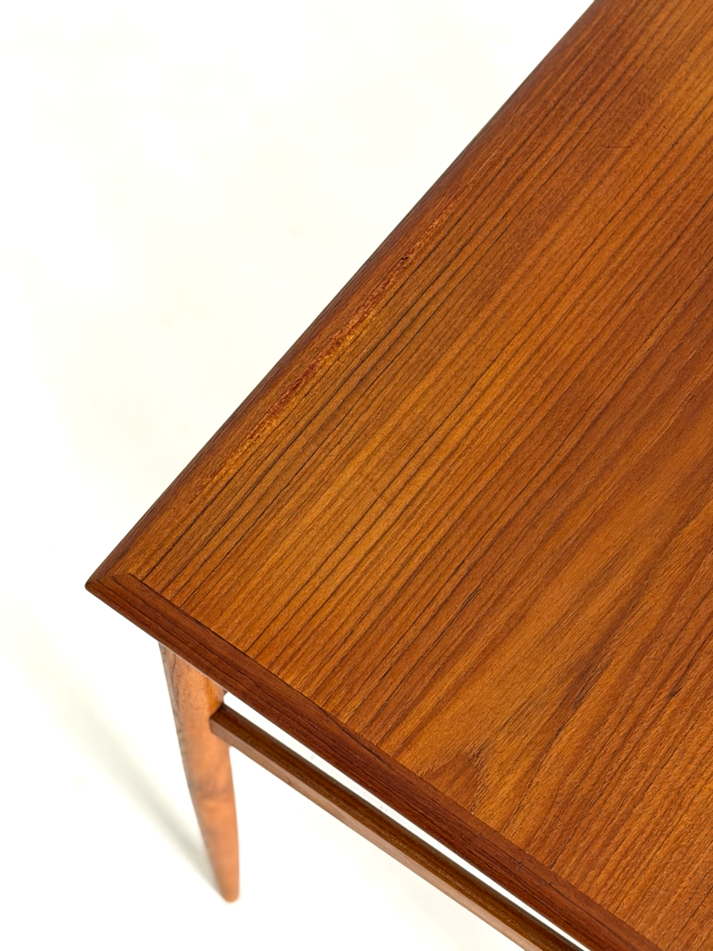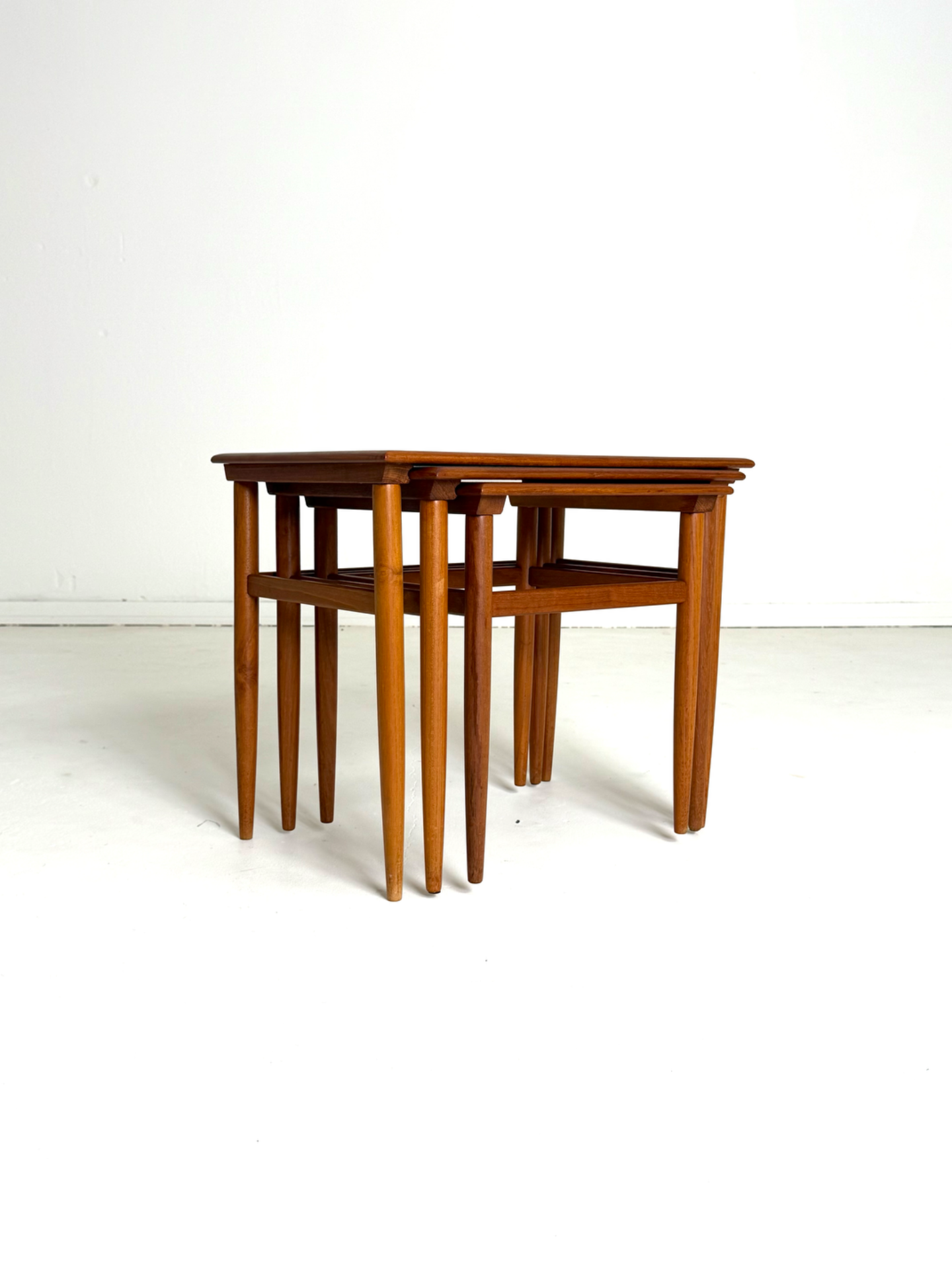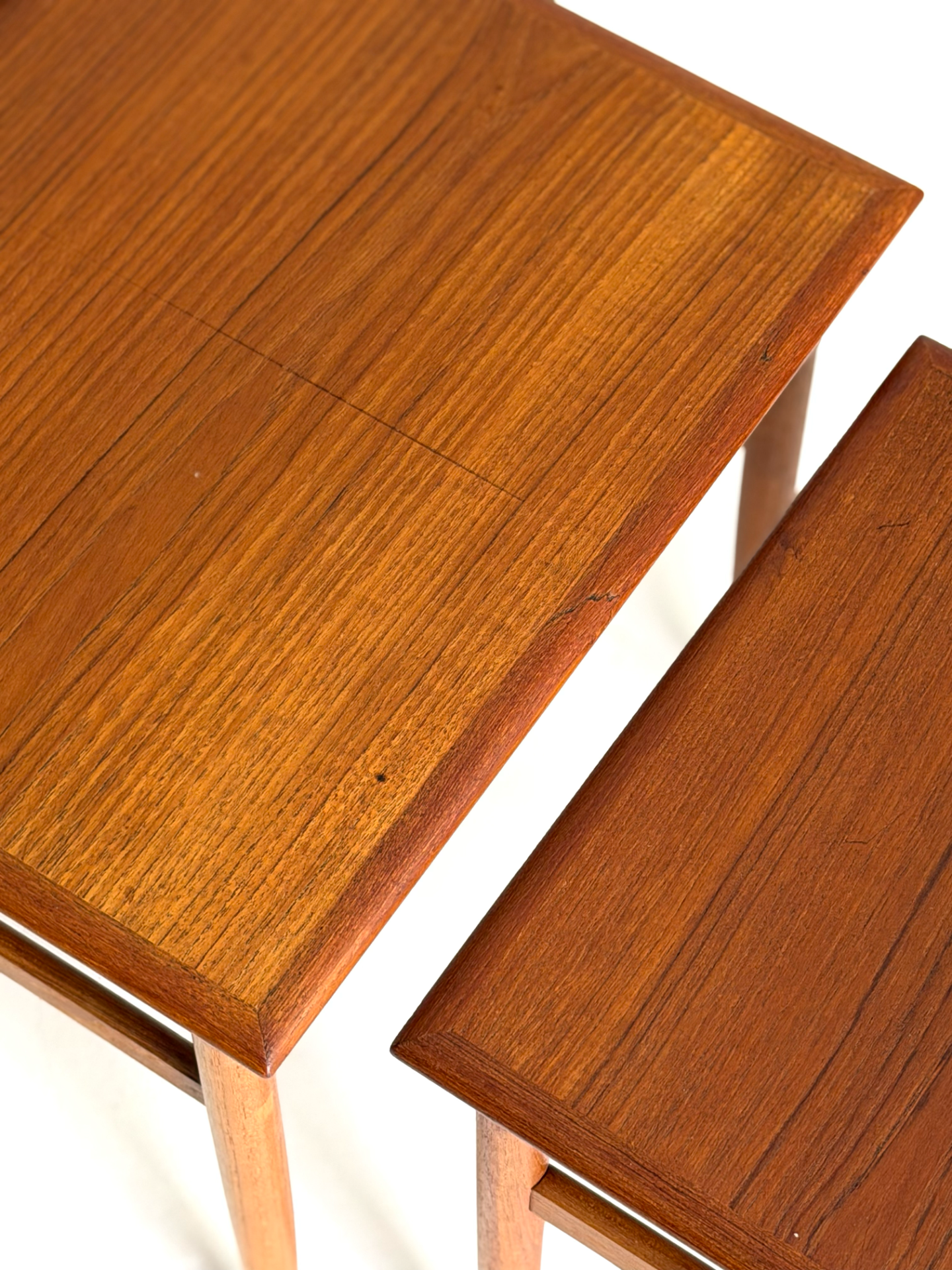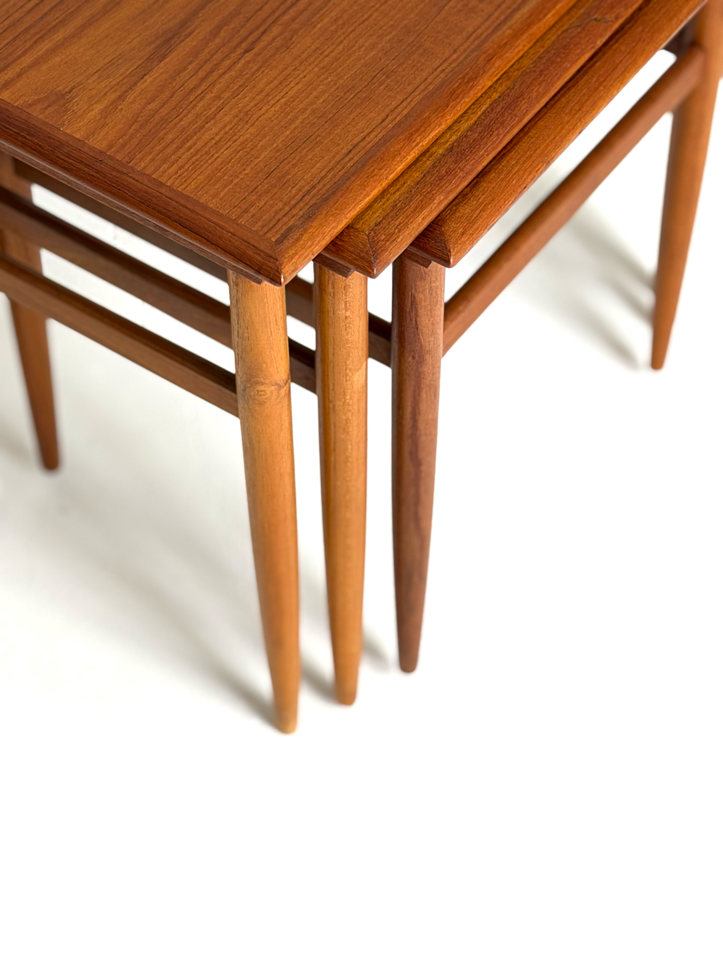 A timeless set of Danish teak nesting tables from the 1960s. Crafted from warm-toned teak wood with refined details and tapered legs, this set includes three tables that slide smoothly under each other. A classic example of mid-century Scandinavian design—both functional and beautiful. Ideal as side tables or for versatile everyday use.