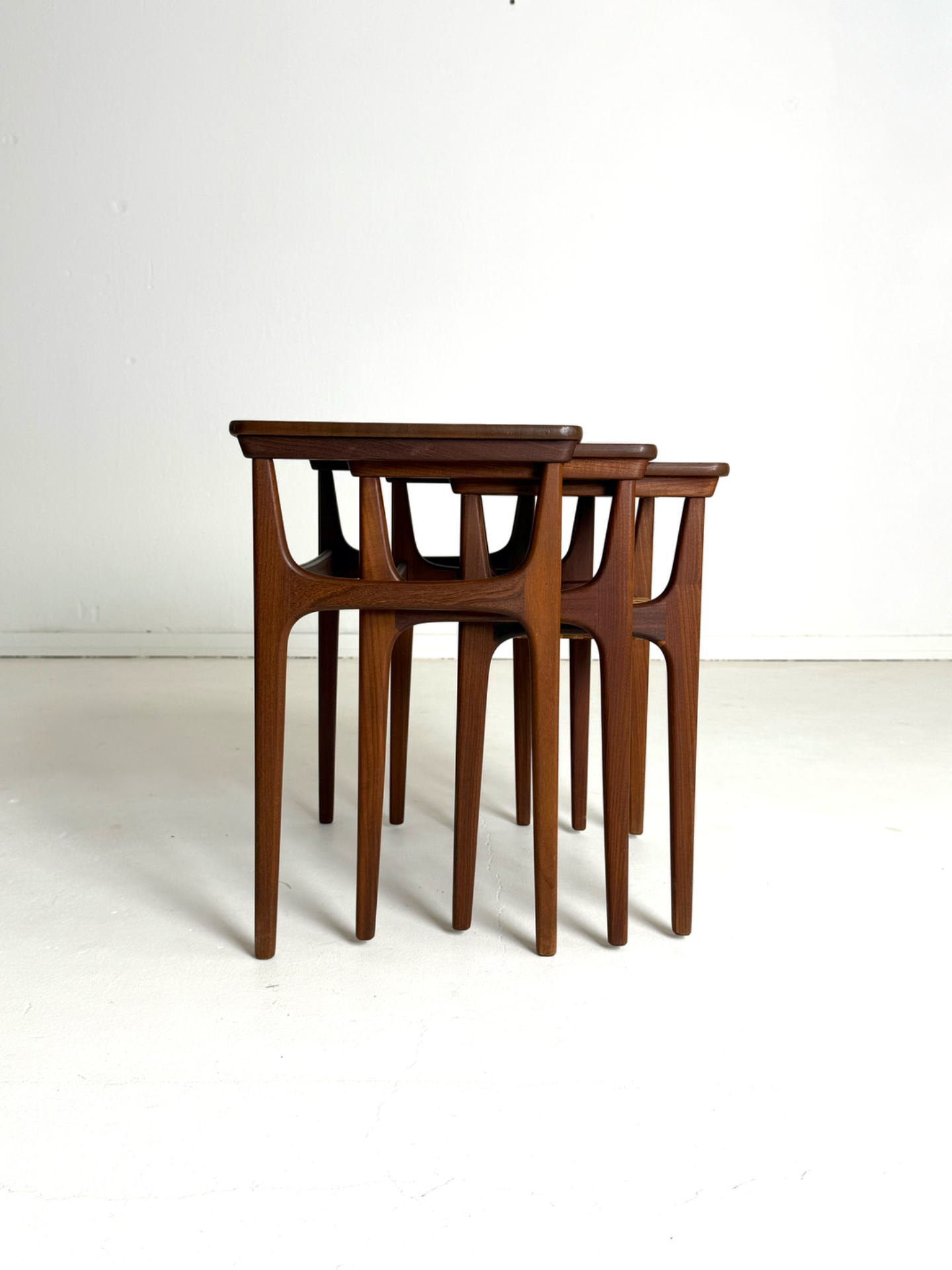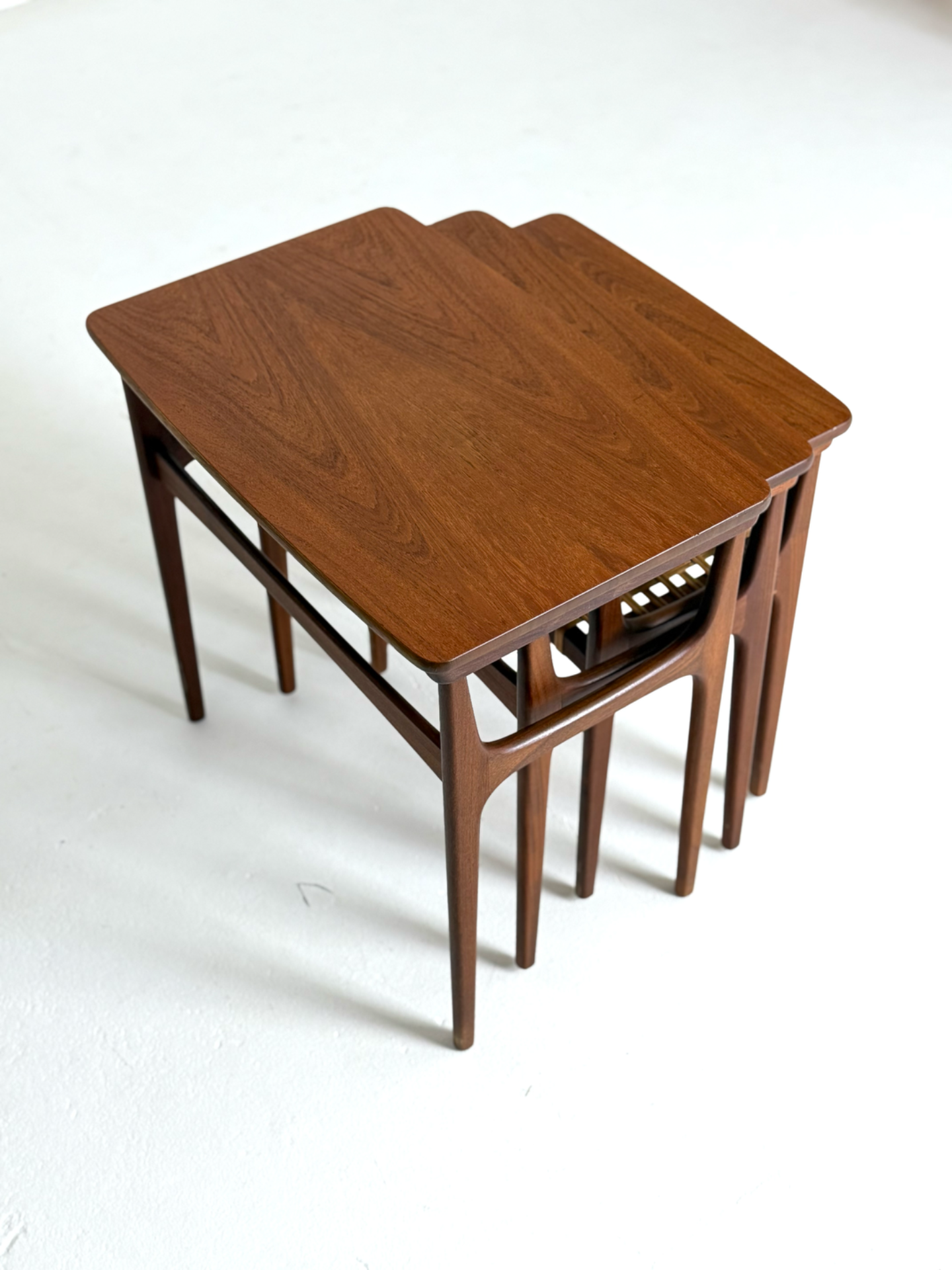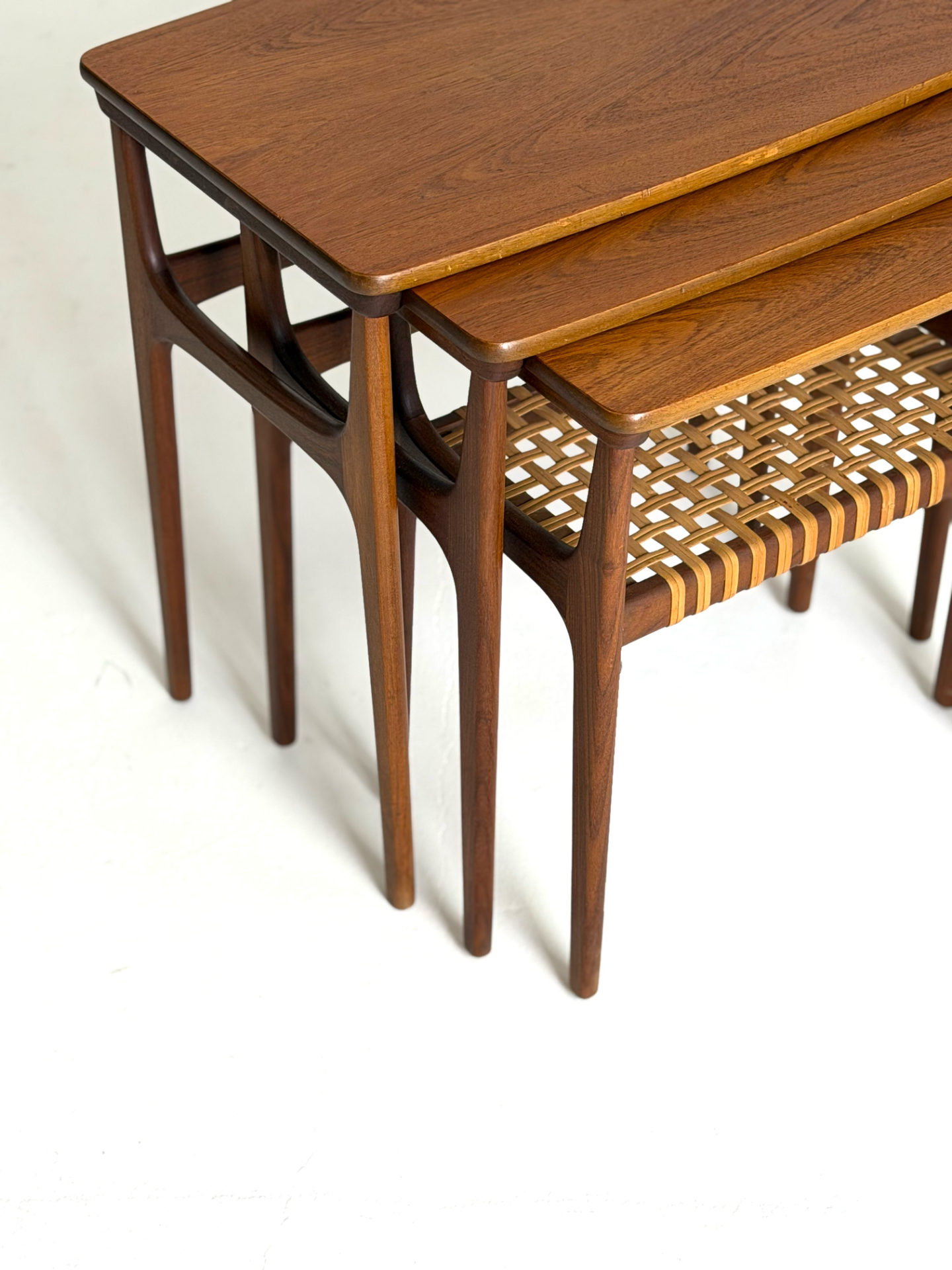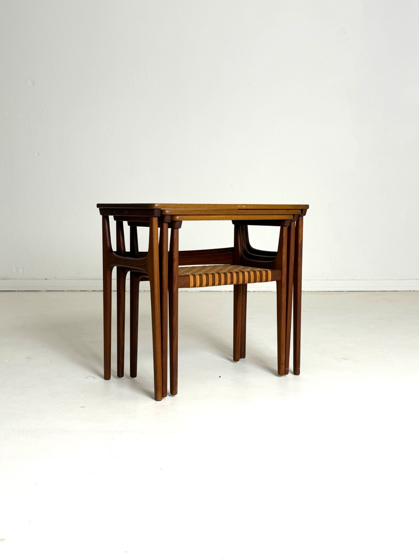 Elegantti ja näyttävä kolmen tiikkipöydän sarja, suunnittelija Erlig Torvits. Sarjan alin pöytä erottuu kauniilla rottinkipunoksella, joka tuo ilmeeseen pehmeyttä ja käsityön tuntua. Pöydät liukuvat sulavasti sisäkkäin ja tarjoavat käytännöllisyyttä ilman kompromisseja estetiikasta. Valmistaja tanskalainen Heltborg Møbler. Täydellinen esimerkki 1960-luvun tanskalaista muotoilua, jossa yhdistyvät toimivuus ja ajaton kauneus.