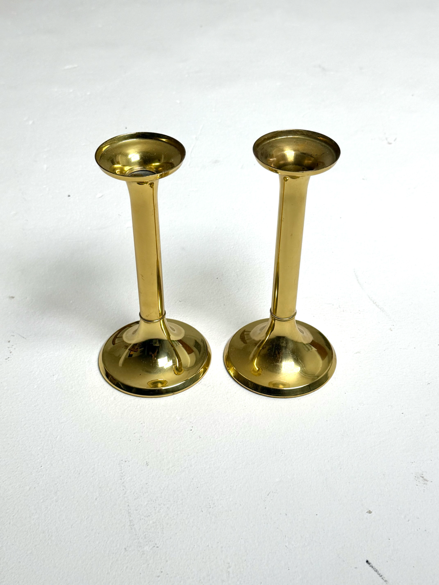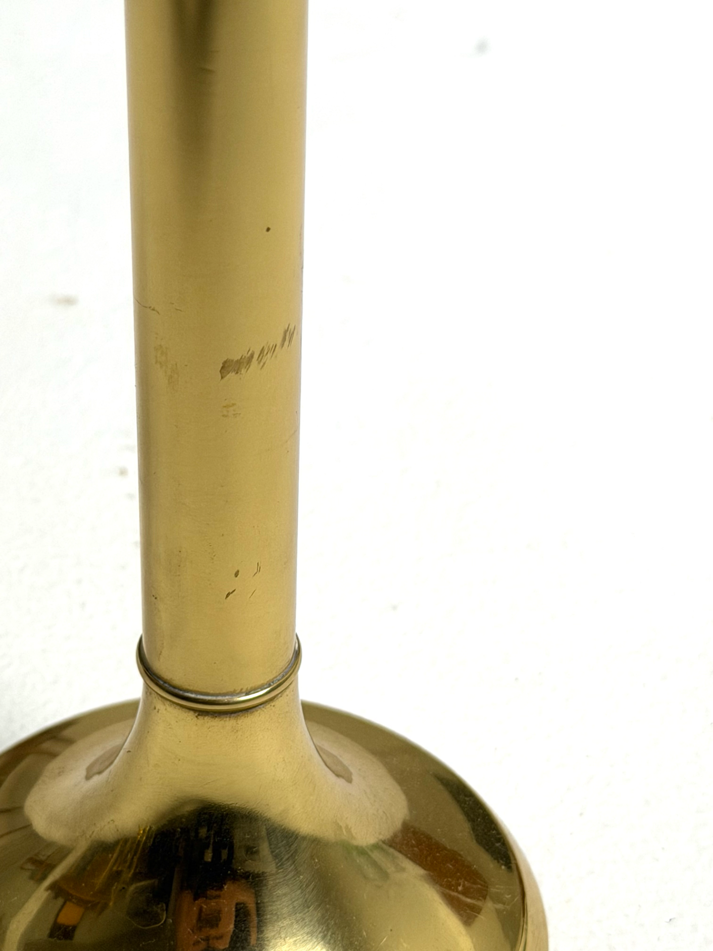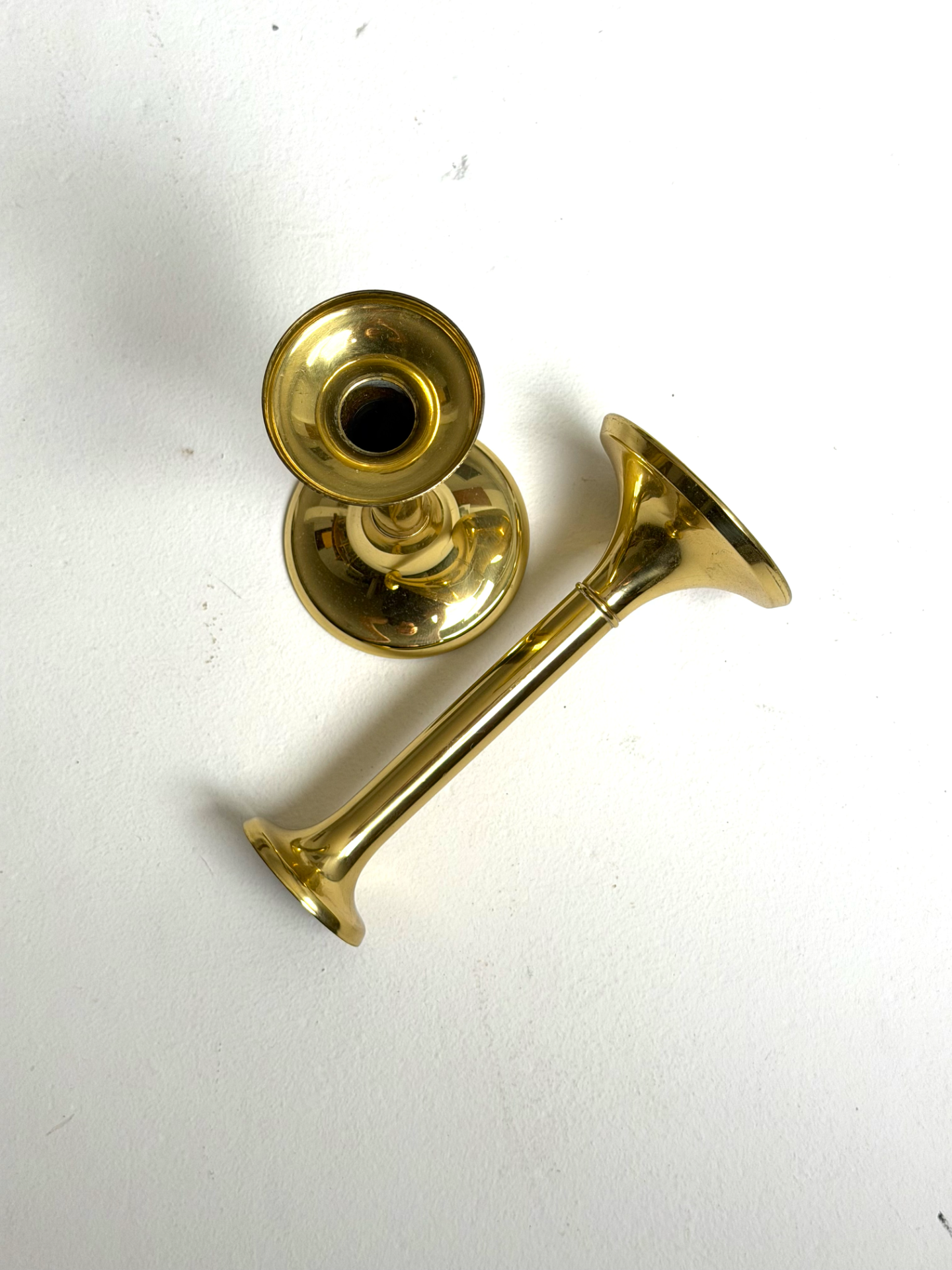 A sculptural brass candlestick by G. V. Harnisch in the 1970s–80s. The trumpet-like shape adds a bold and expressive touch to this elegant piece. Beautiful as a standalone object or part of a set – a perfect accent for any Nordic interior.