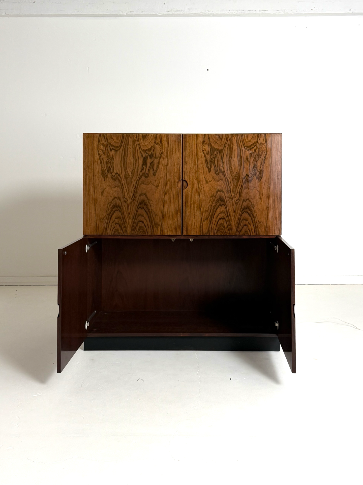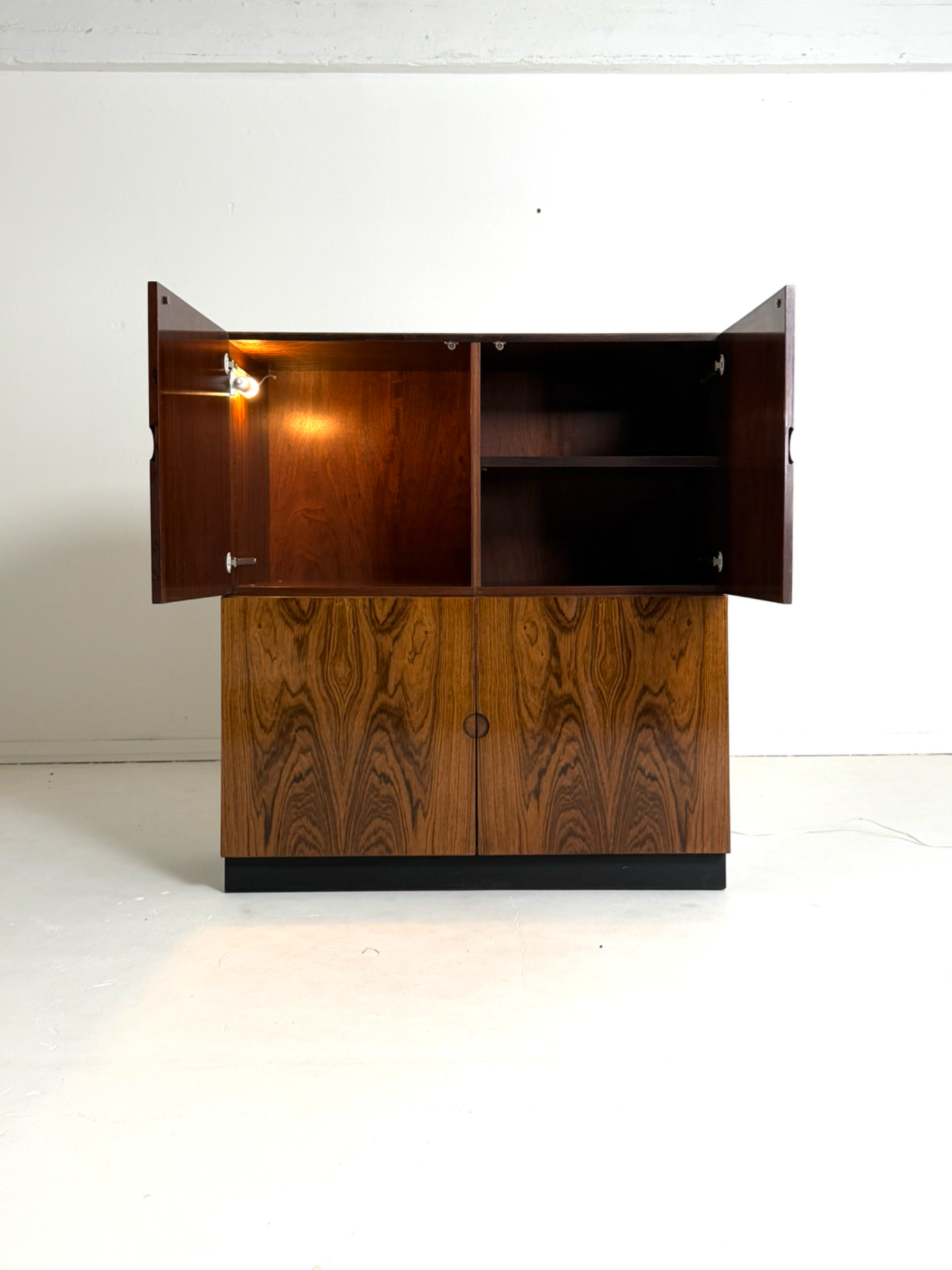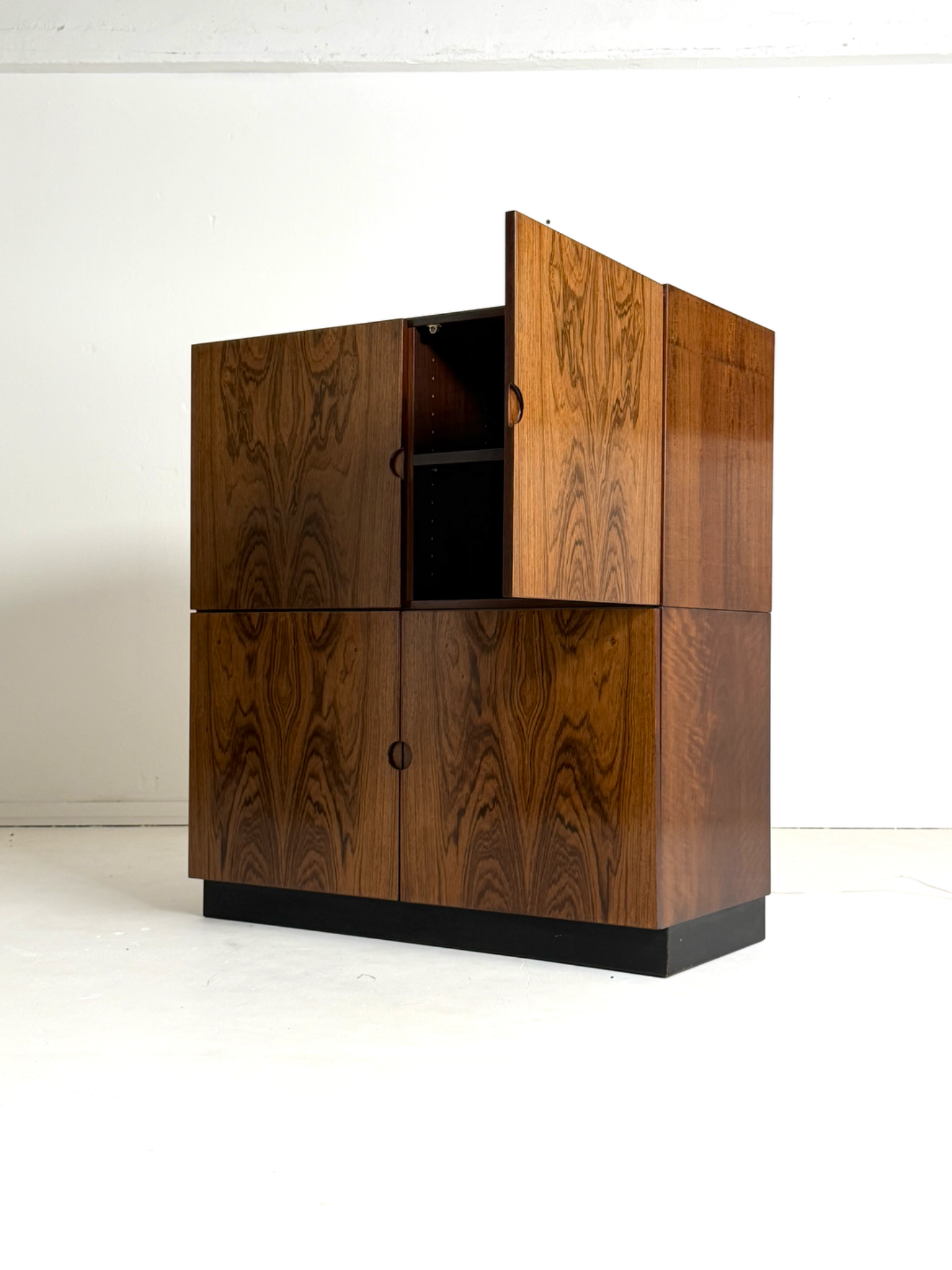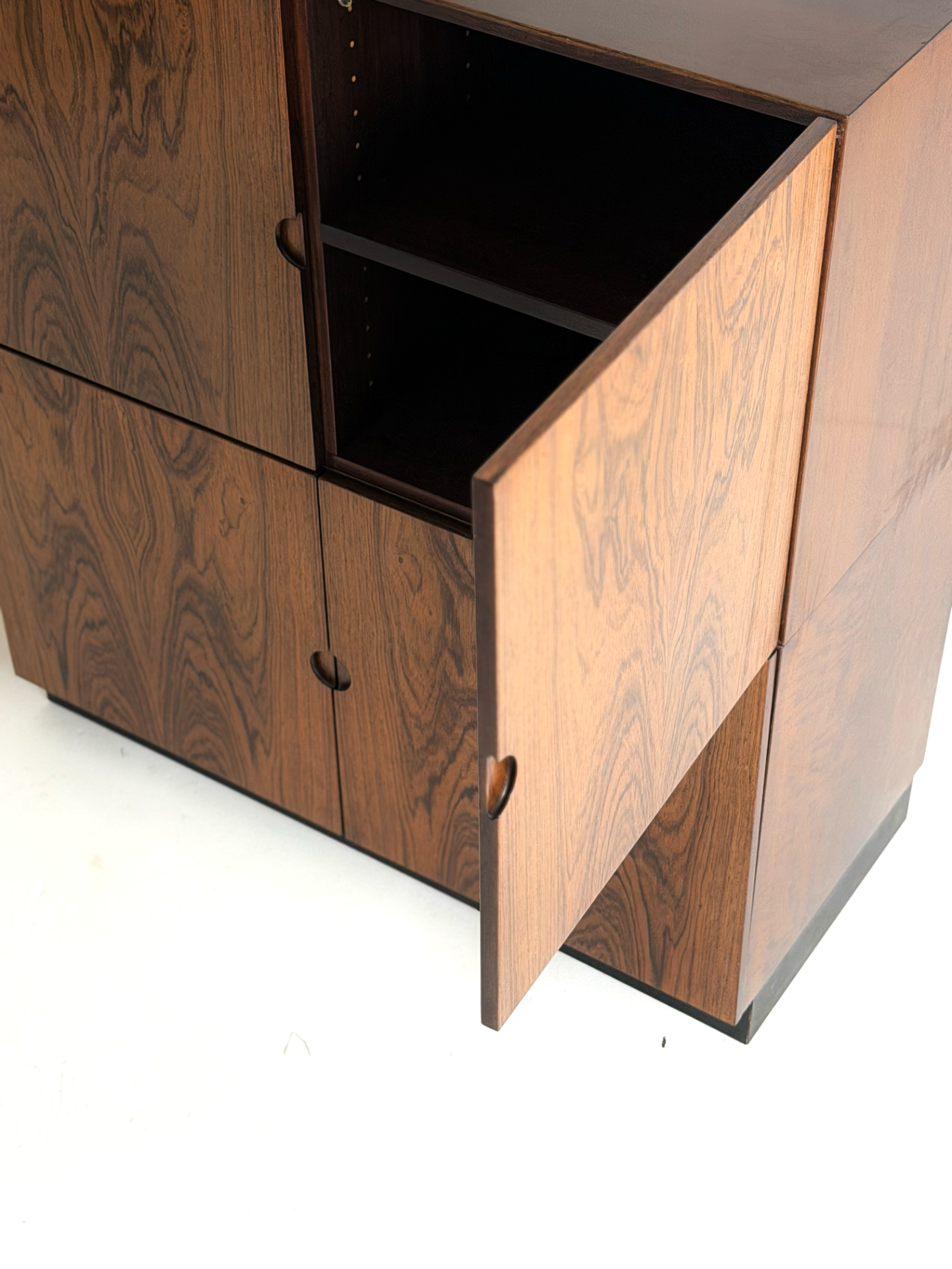 A rare and beautifully preserved two-part cabinet from the 1960s, designed by the esteemed H.W. Klein and produced by Danish manufacturer Bramin Møbelfabrik. Crafted from striking rosewood with vivid grain patterns, the cabinet is a timeless piece that blends classic design with exceptional craftsmanship.
