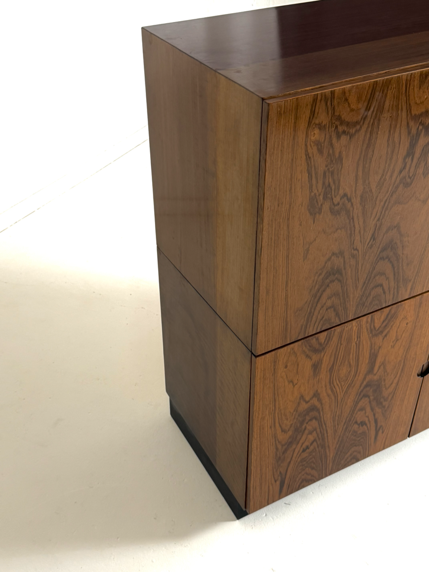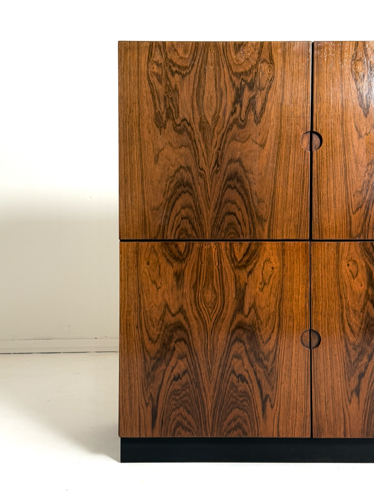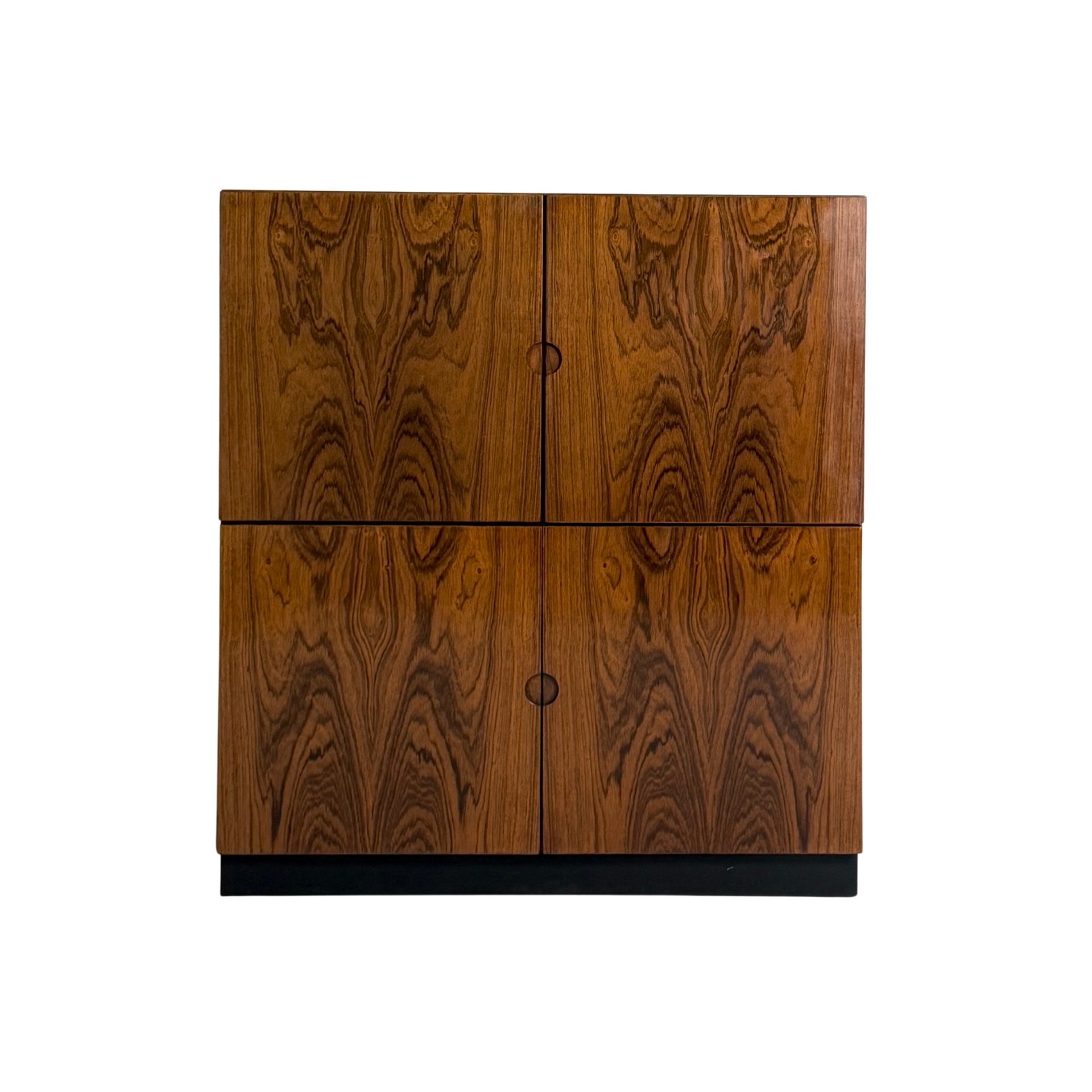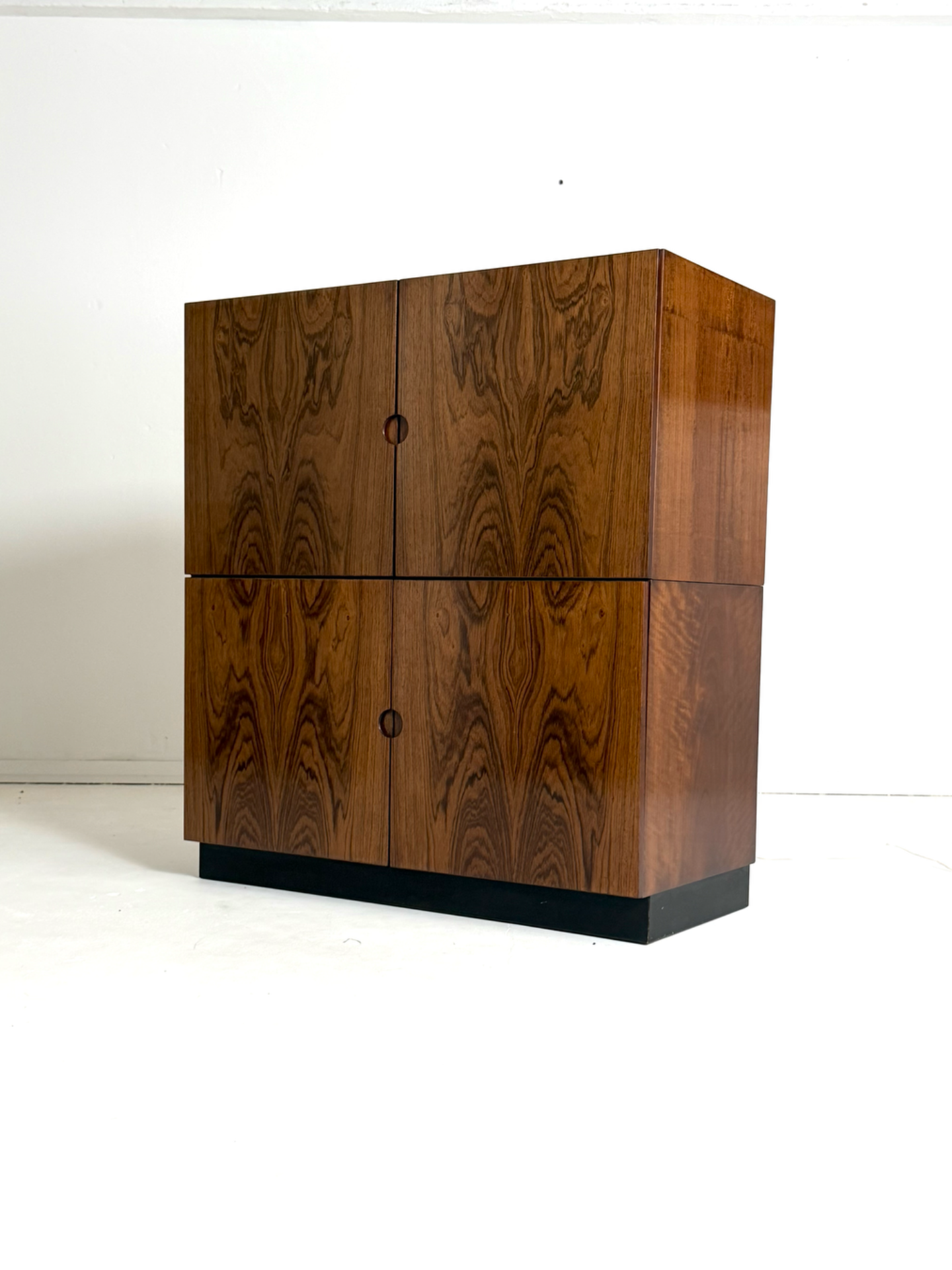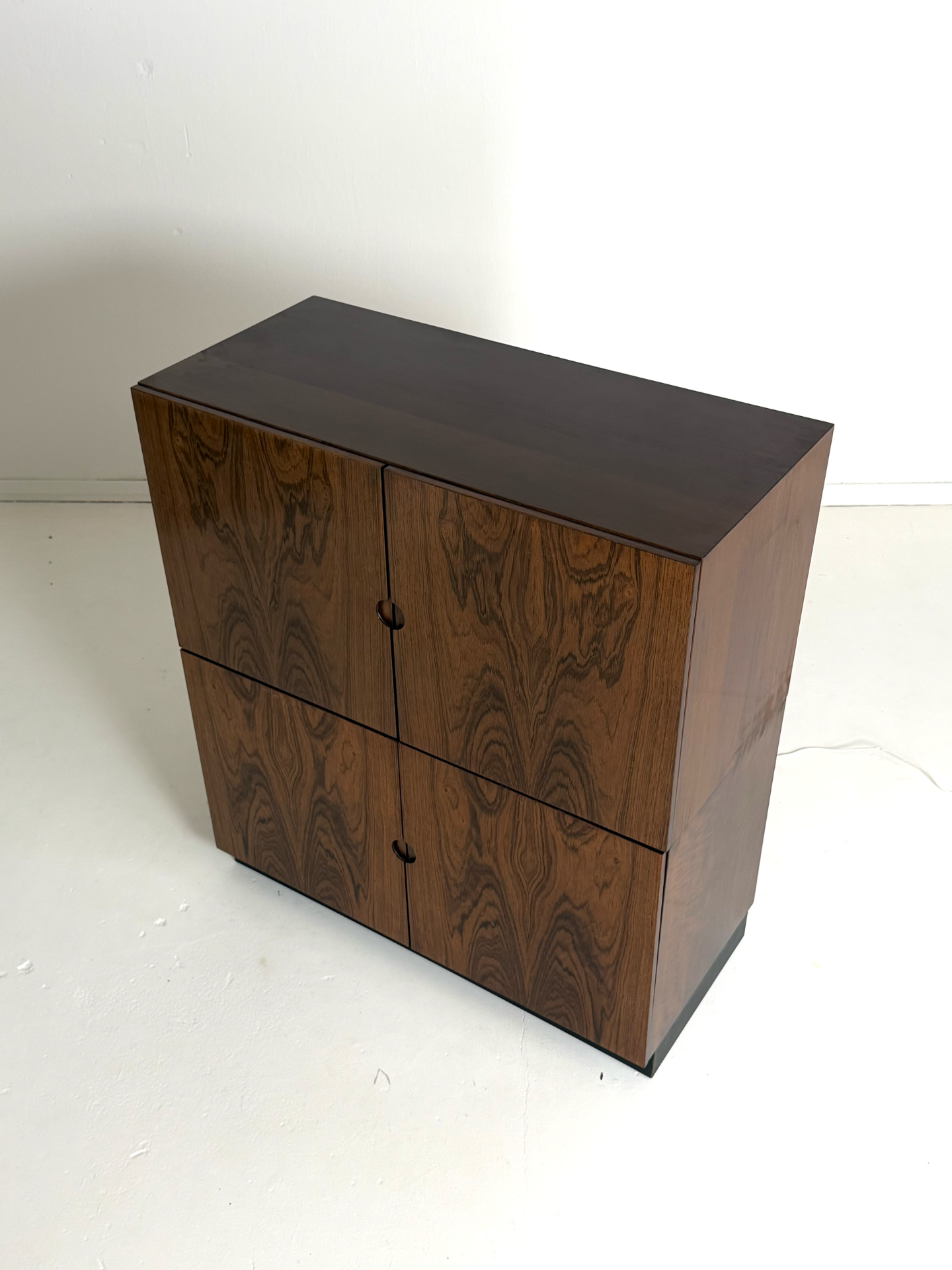 A rare and beautifully preserved two-part cabinet from the 1960s, designed by the esteemed H.W. Klein and produced by Danish manufacturer Bramin Møbelfabrik. Crafted from striking rosewood with vivid grain patterns, the cabinet is a timeless piece that blends classic design with exceptional craftsmanship.