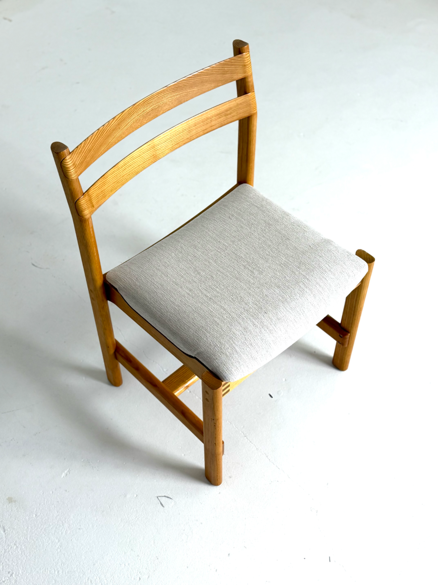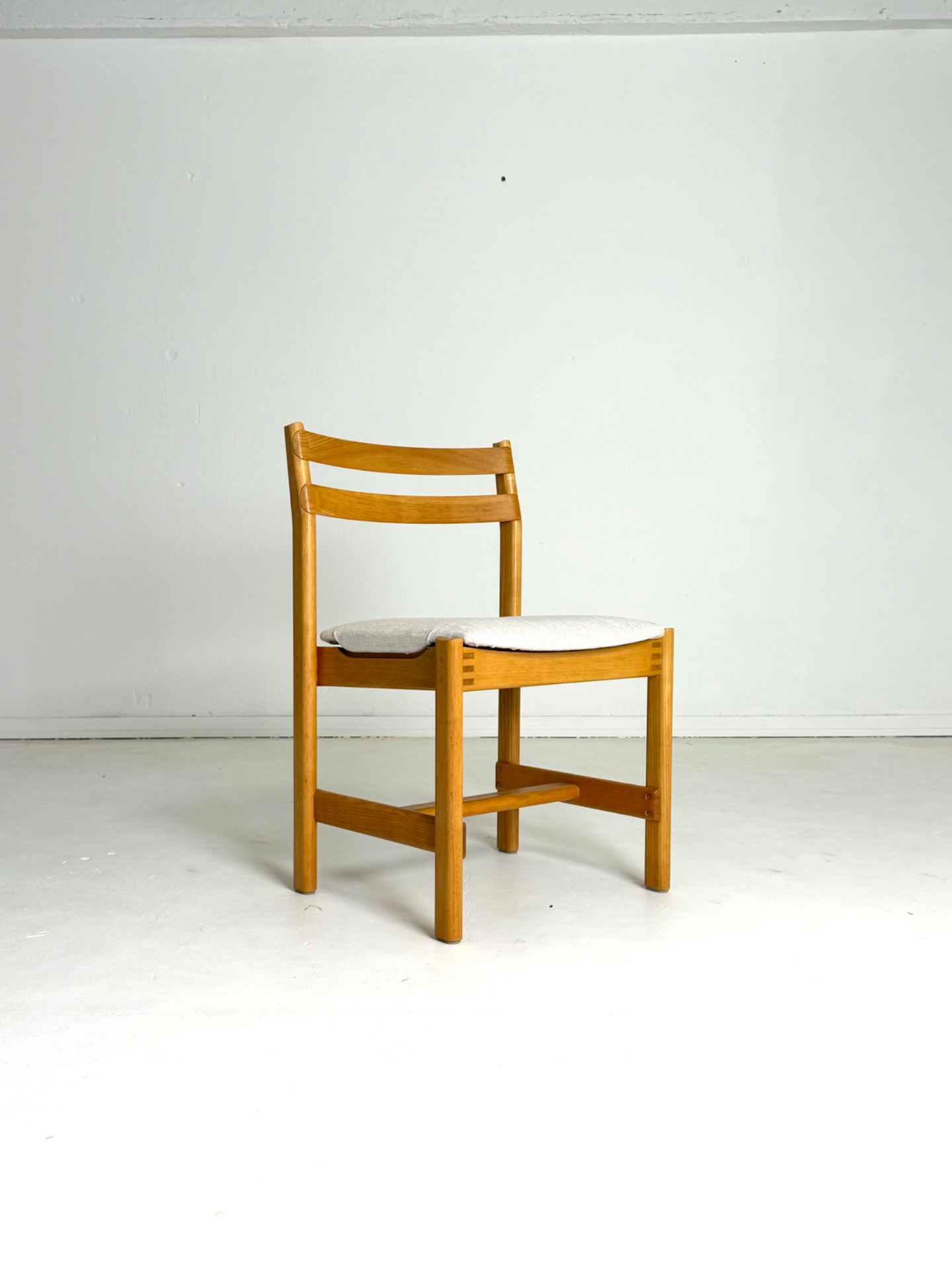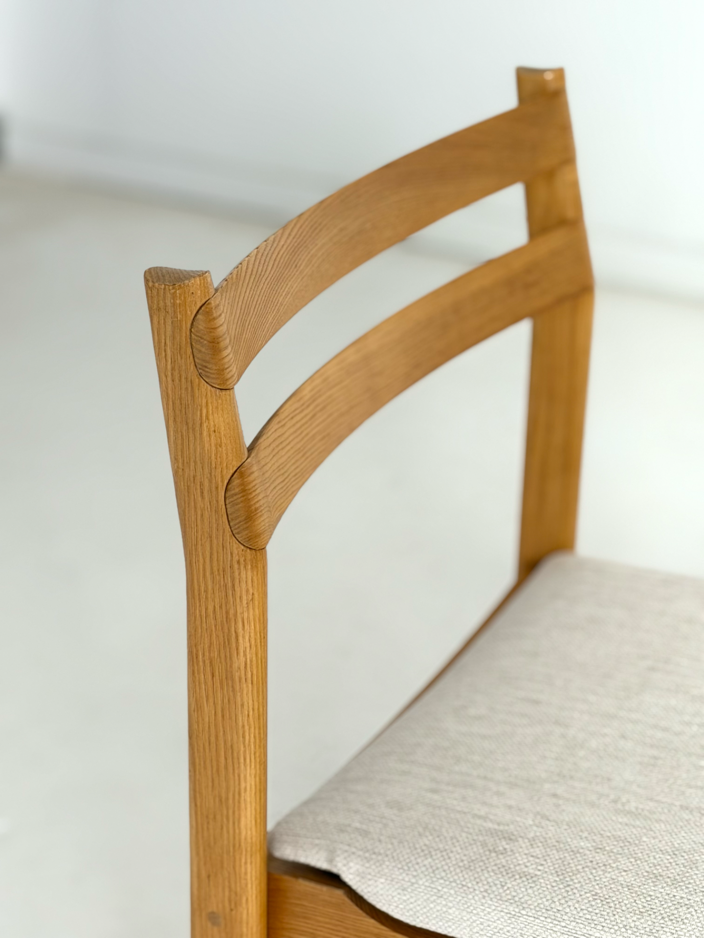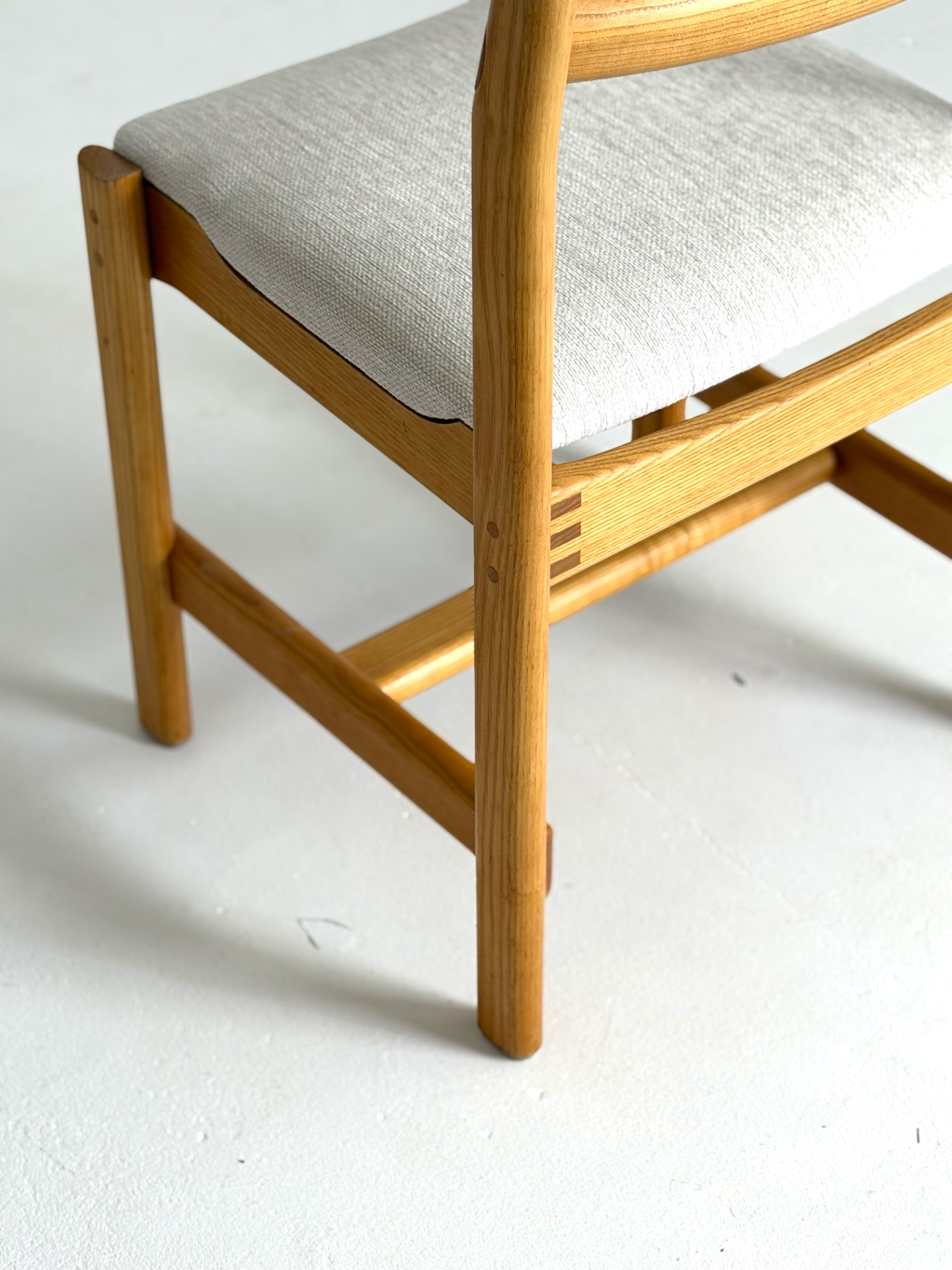 Tanskalaiset H. W. Kleinin suunnittelemat vintage-tuolit 1970-luvulta. Massiivitamminen runko ja kauniisti kaartuvat selkänojat yhdistyvät ajattomaan muotoiluun. Istuimet on verhoiltu vaalealla, hillityllä kankaalla, joka tuo tuoleihin raikkautta ja modernia ilmettä. Elegantti ja harvinaisempi löytö laatutietoiselle sisustajalle.