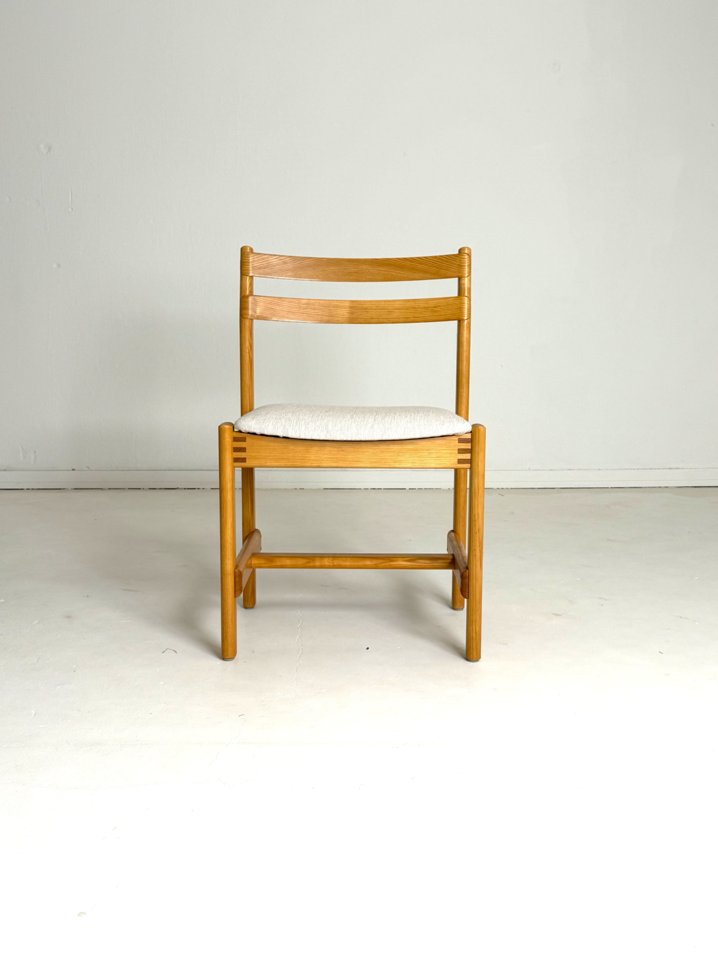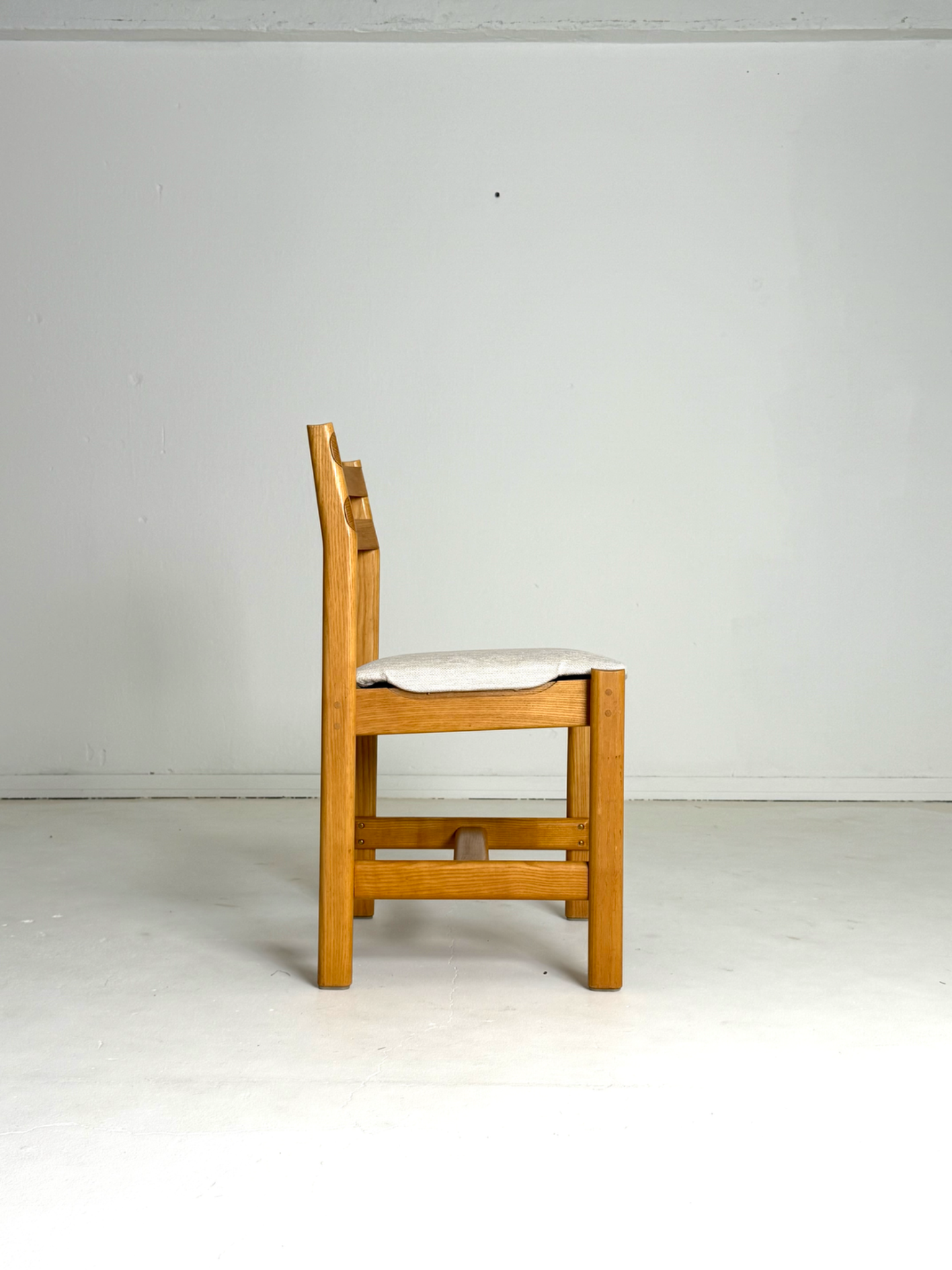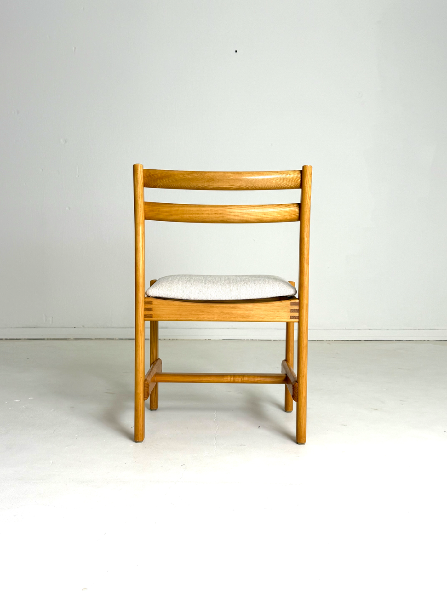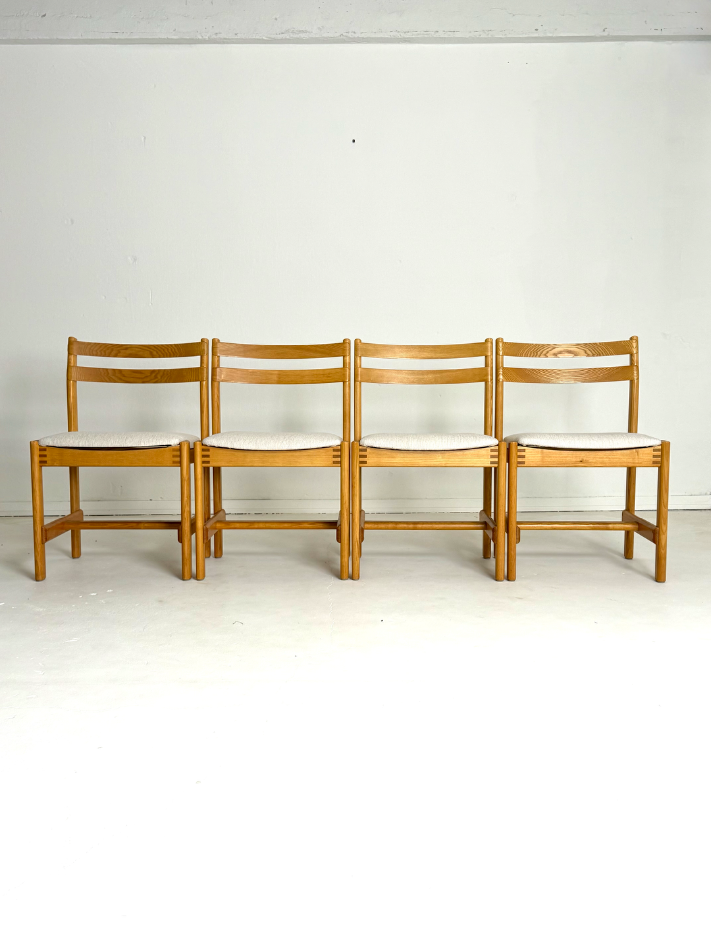 Tanskalaiset H. W. Kleinin suunnittelemat vintage-tuolit 1970-luvulta. Massiivitamminen runko ja kauniisti kaartuvat selkänojat yhdistyvät ajattomaan muotoiluun. Istuimet on verhoiltu vaalealla, hillityllä kankaalla, joka tuo tuoleihin raikkautta ja modernia ilmettä. Elegantti ja harvinaisempi löytö laatutietoiselle sisustajalle.