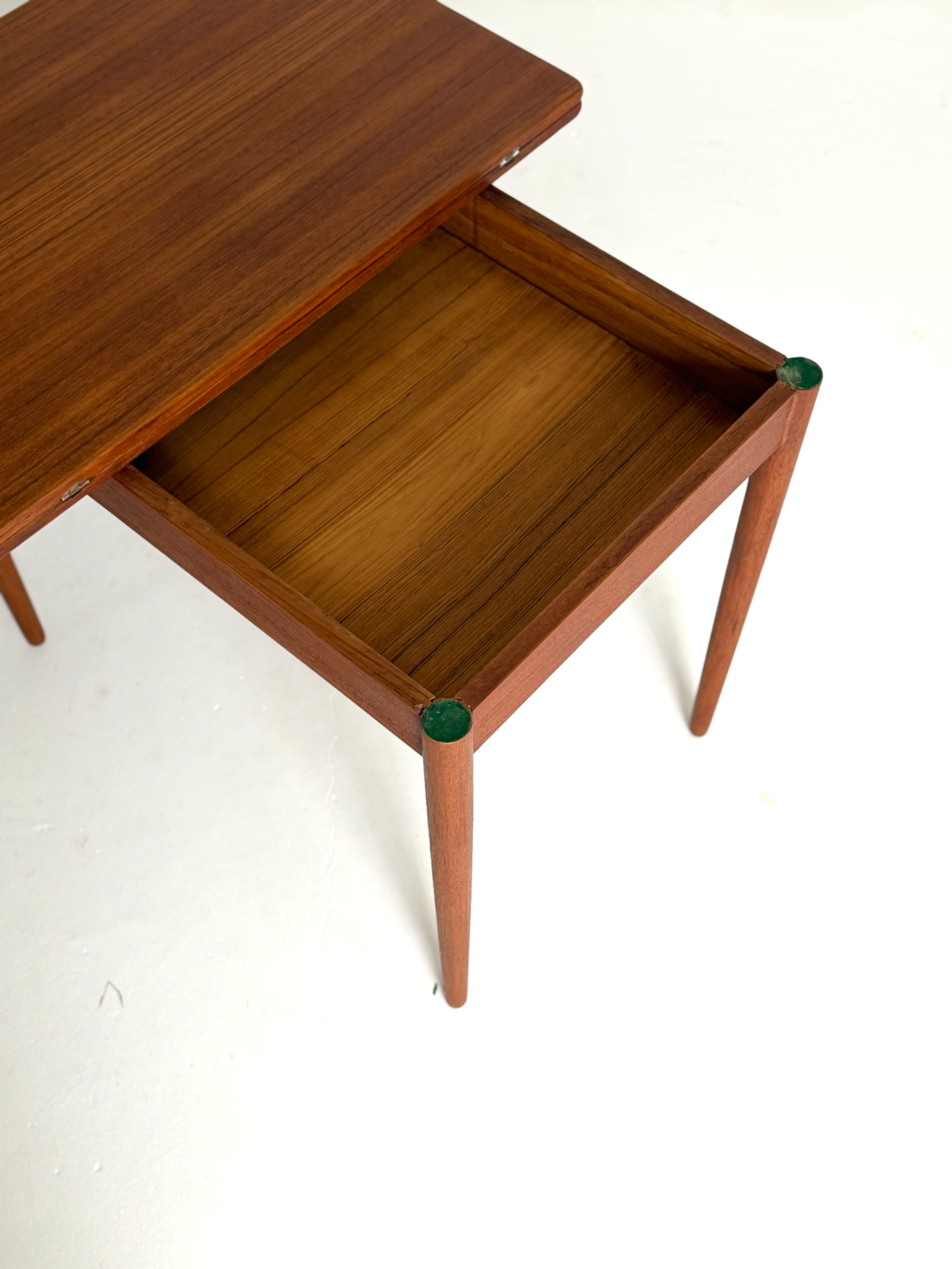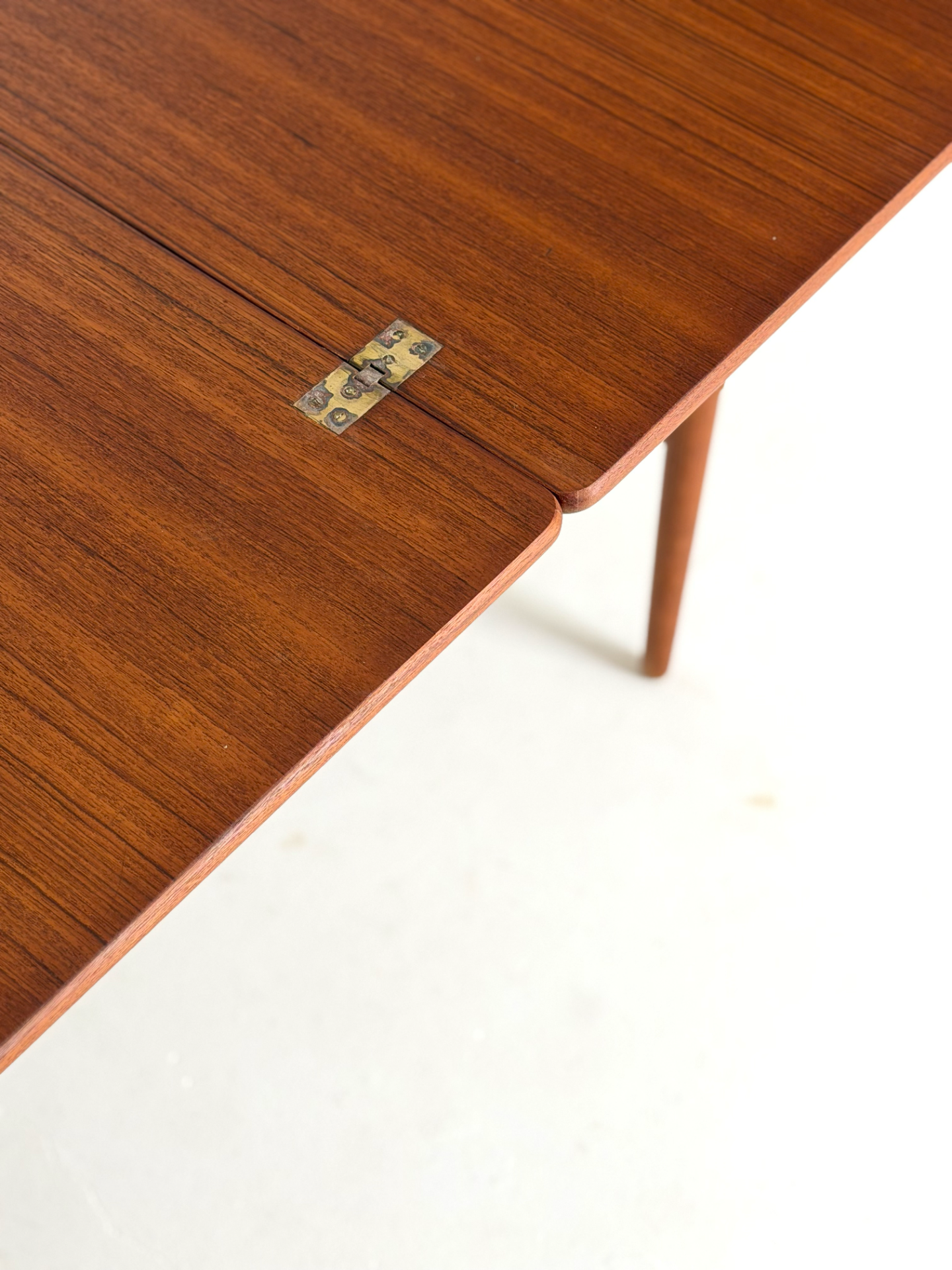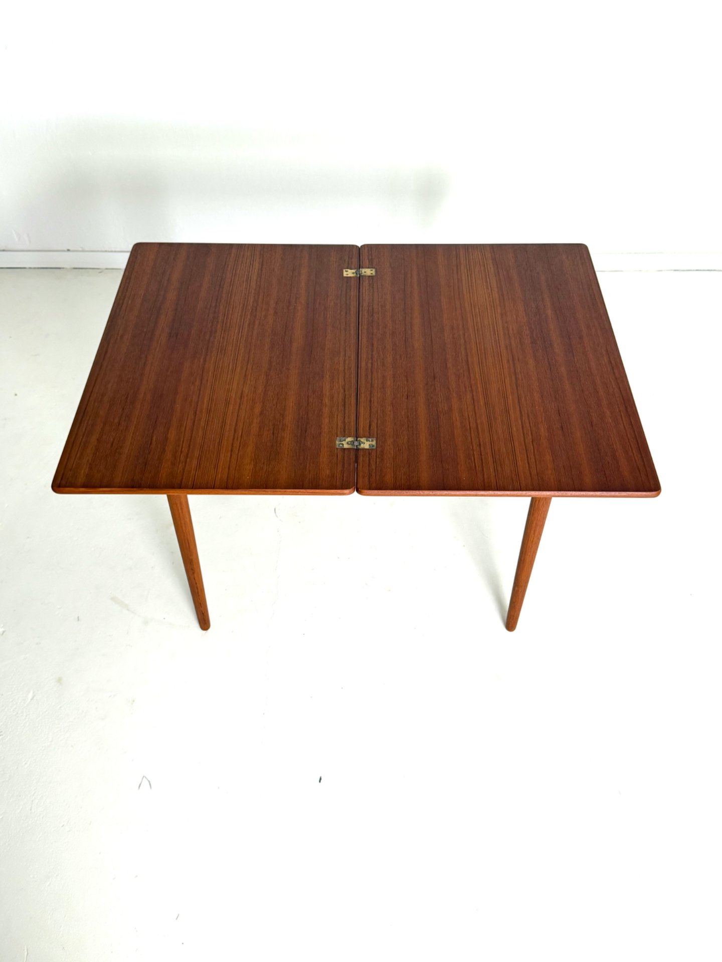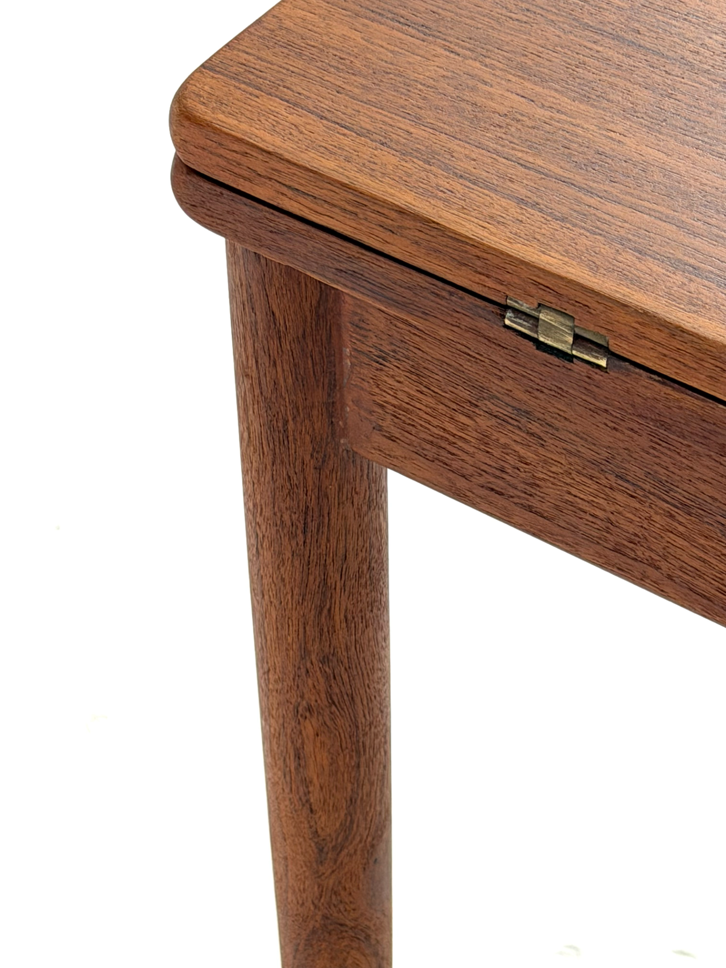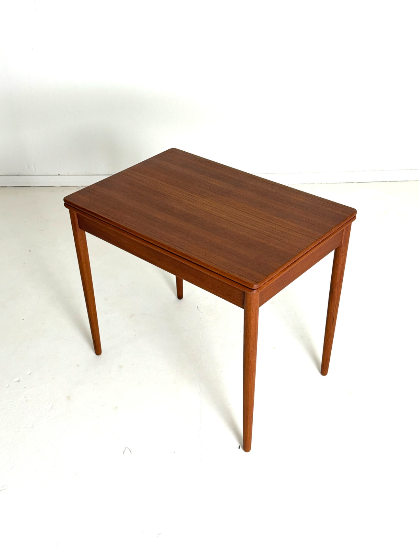 Harvinainen pöytä on suunniteltu 1950-luvulla. Valmistaja tanskalainen Andreas Tuck. Tiikkinen runko ja kansi, messinkiset saranat. Pöydän kansi taittuu kahteen osaan, jolloin siitä saa suuremman pöydän esimerkiksi ruokailuun tai työskentelyyn. Kannessa säilytystila esimerkiksi korteille tai muille pienille esineille. Elegantti ja käytännöllinen vintage-huonekalu tanskalaisen modernismin huipulta.
