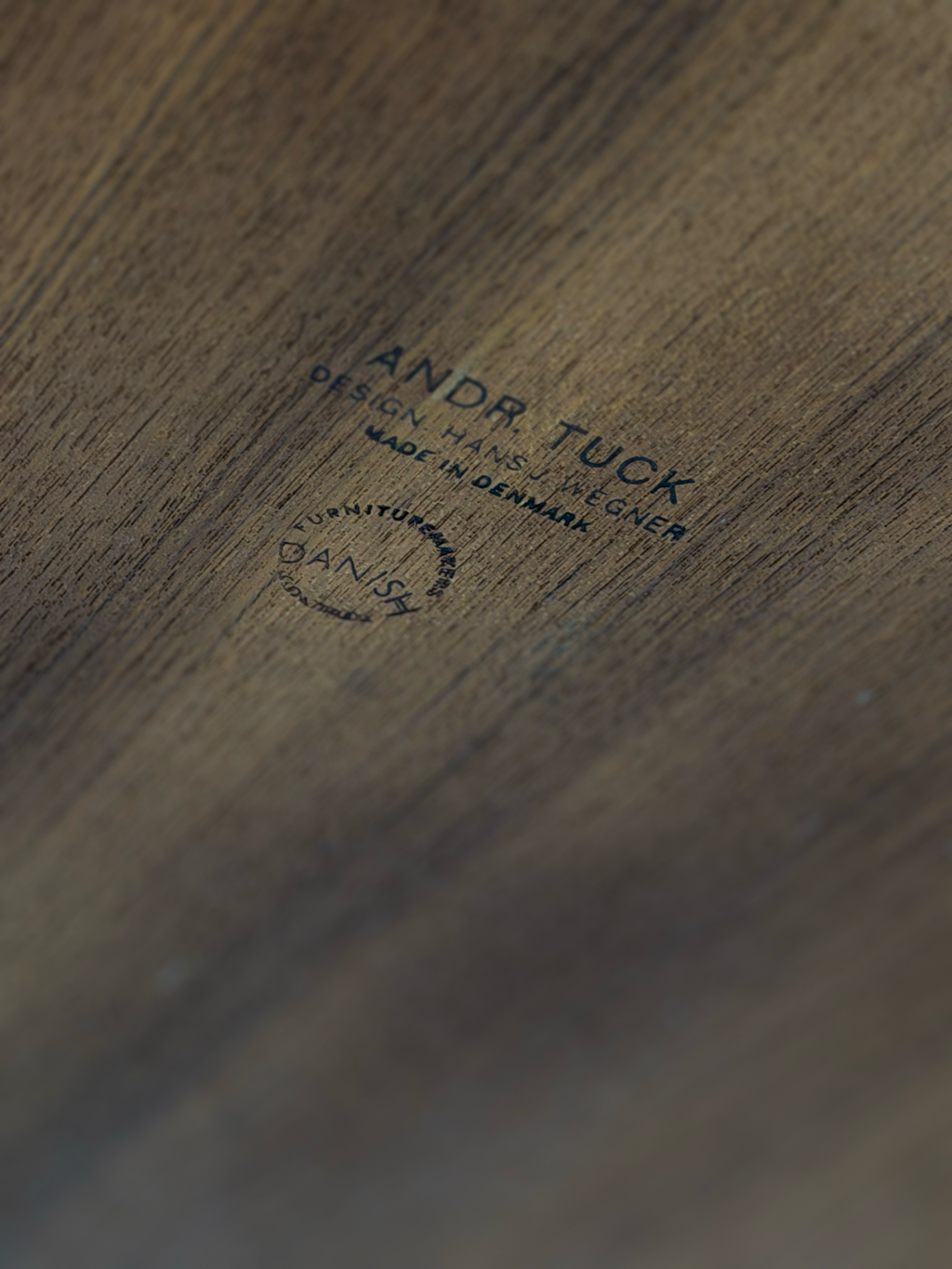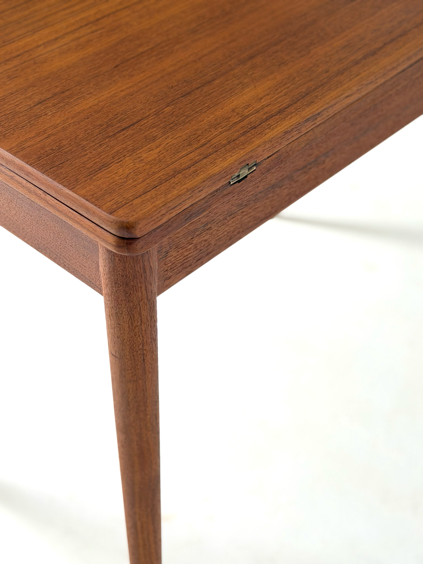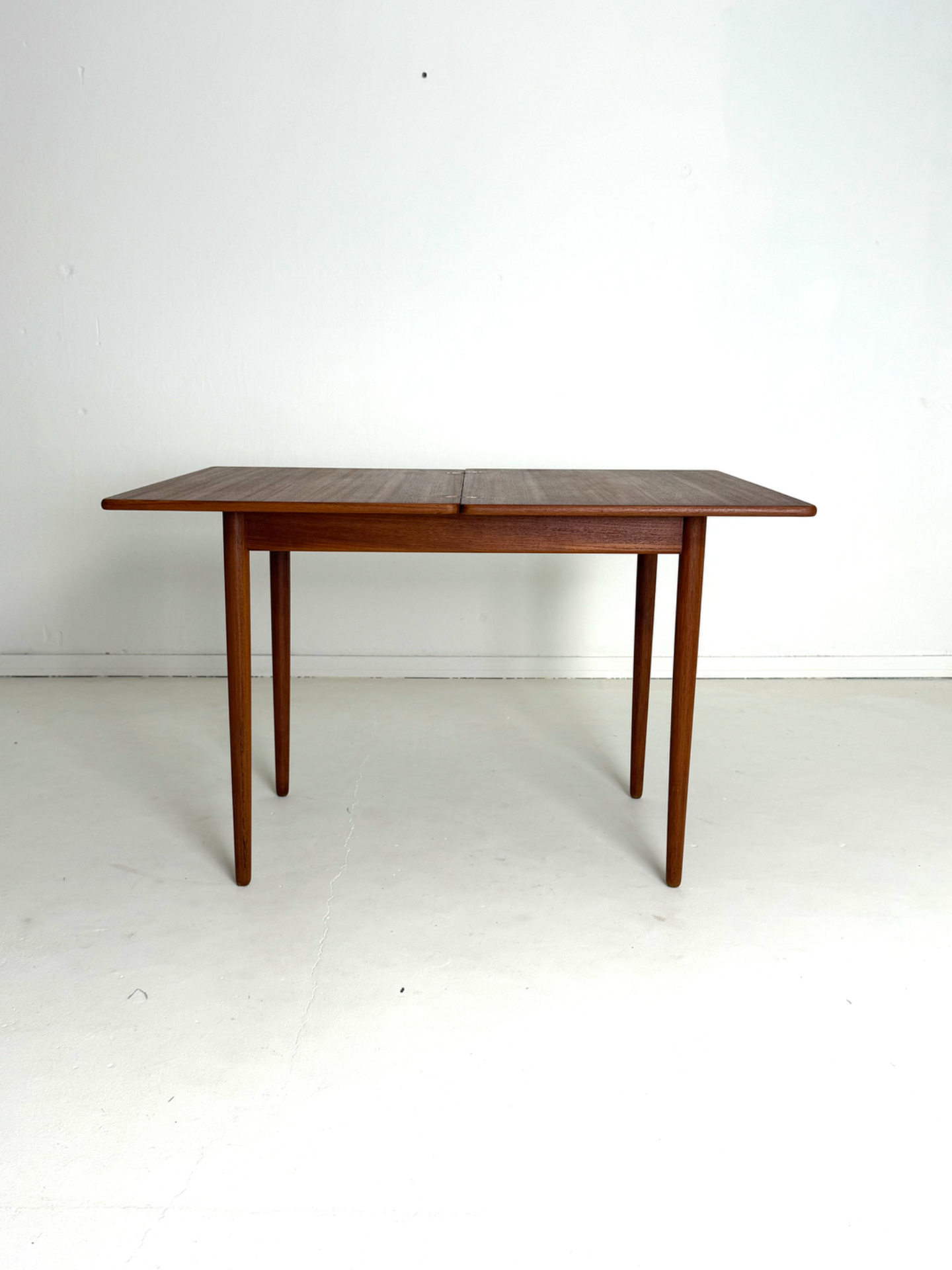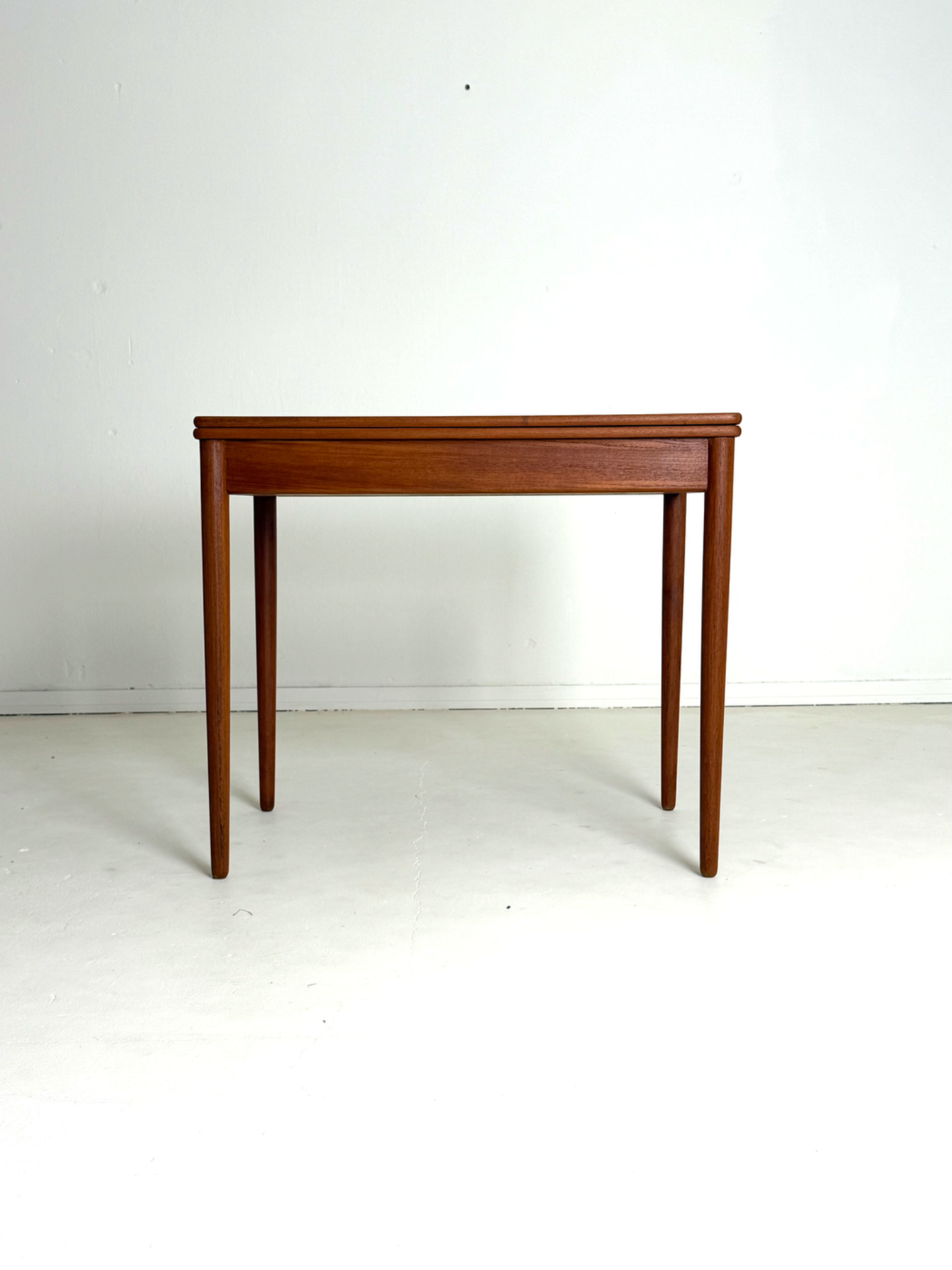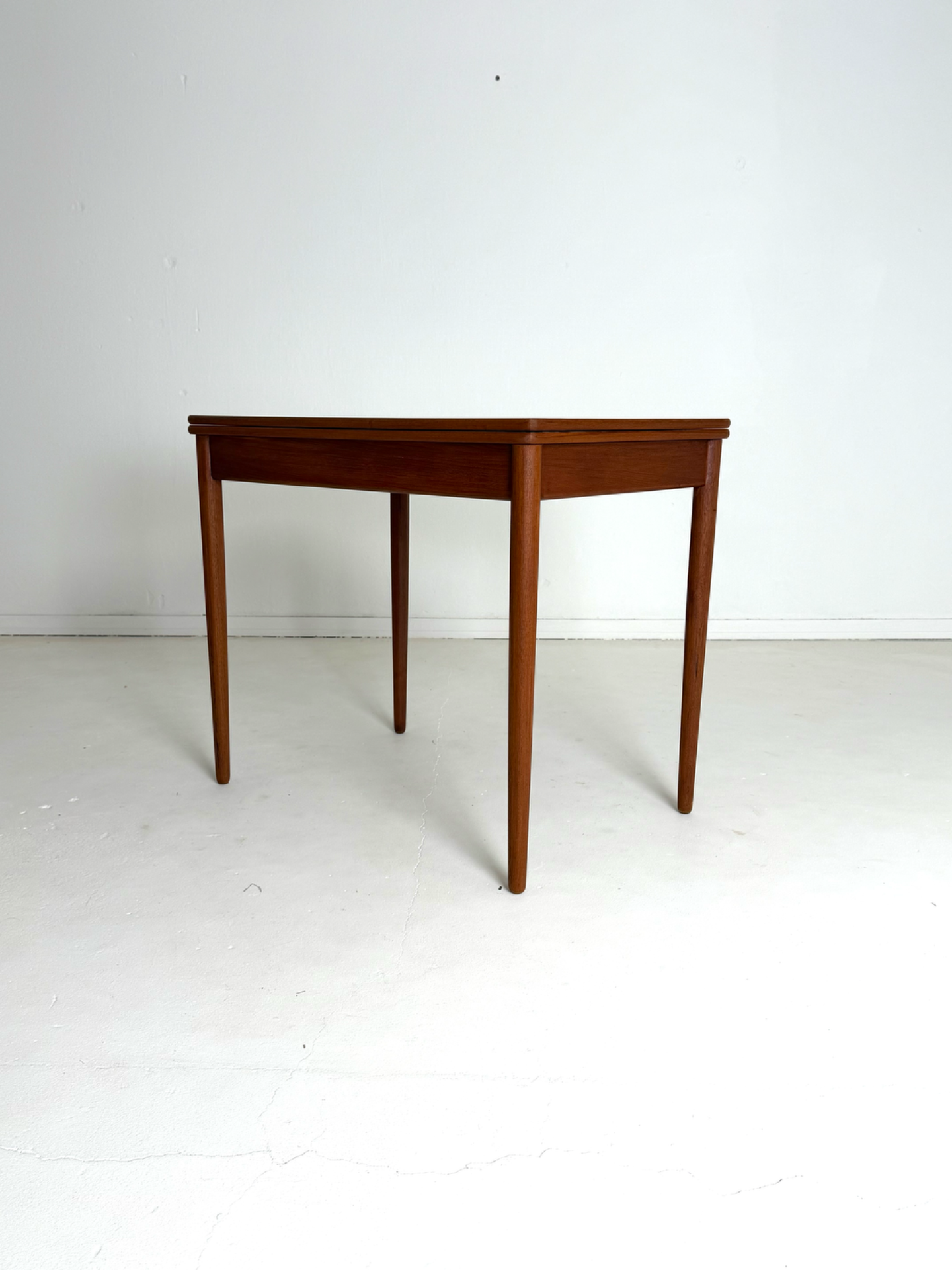 Harvinainen pöytä on suunniteltu 1950-luvulla. Valmistaja tanskalainen Andreas Tuck. Tiikkinen runko ja kansi, messinkiset saranat. Pöydän kansi taittuu kahteen osaan, jolloin siitä saa suuremman pöydän esimerkiksi ruokailuun tai työskentelyyn. Kannessa säilytystila esimerkiksi korteille tai muille pienille esineille. Elegantti ja käytännöllinen vintage-huonekalu tanskalaisen modernismin huipulta.