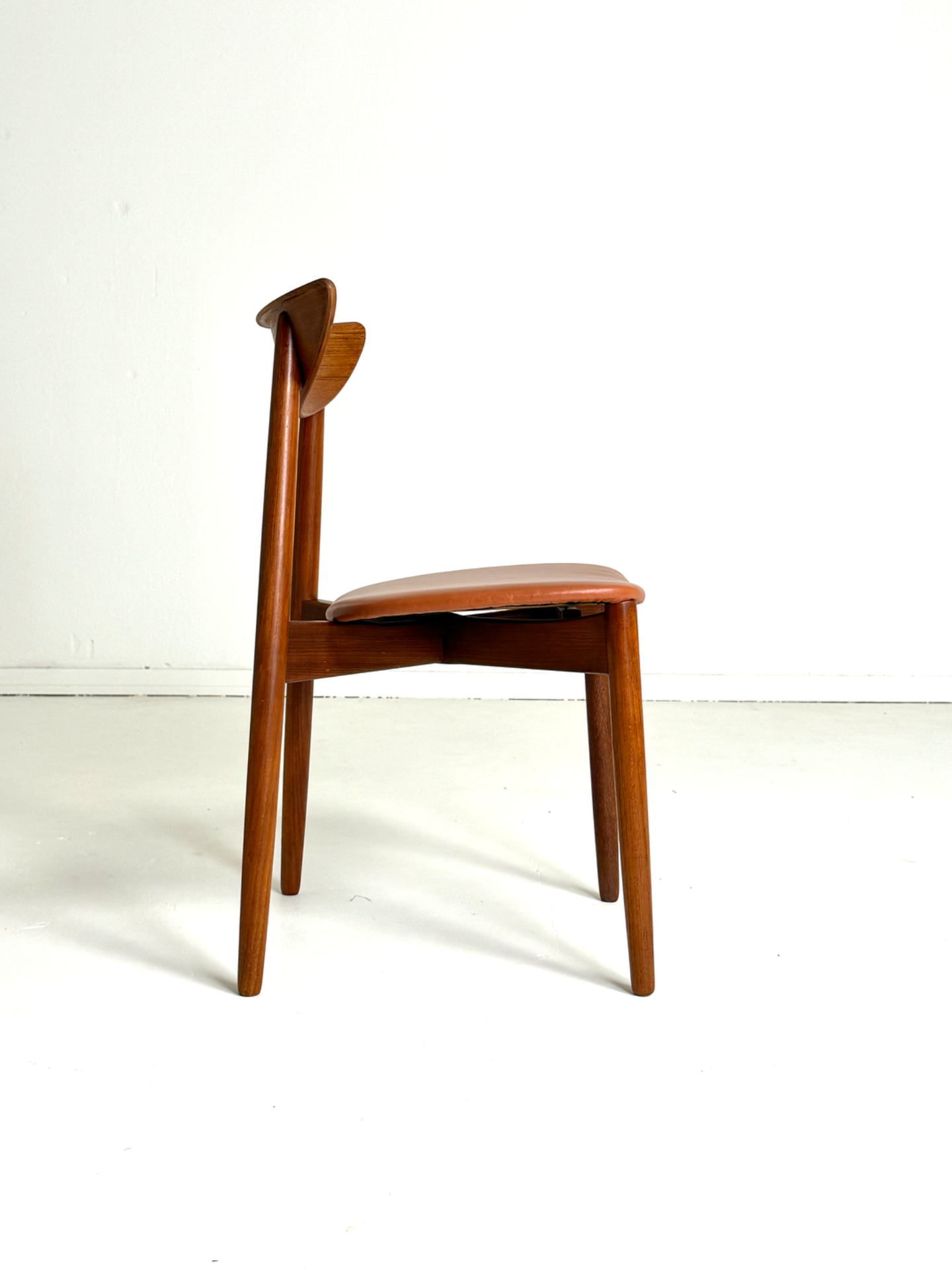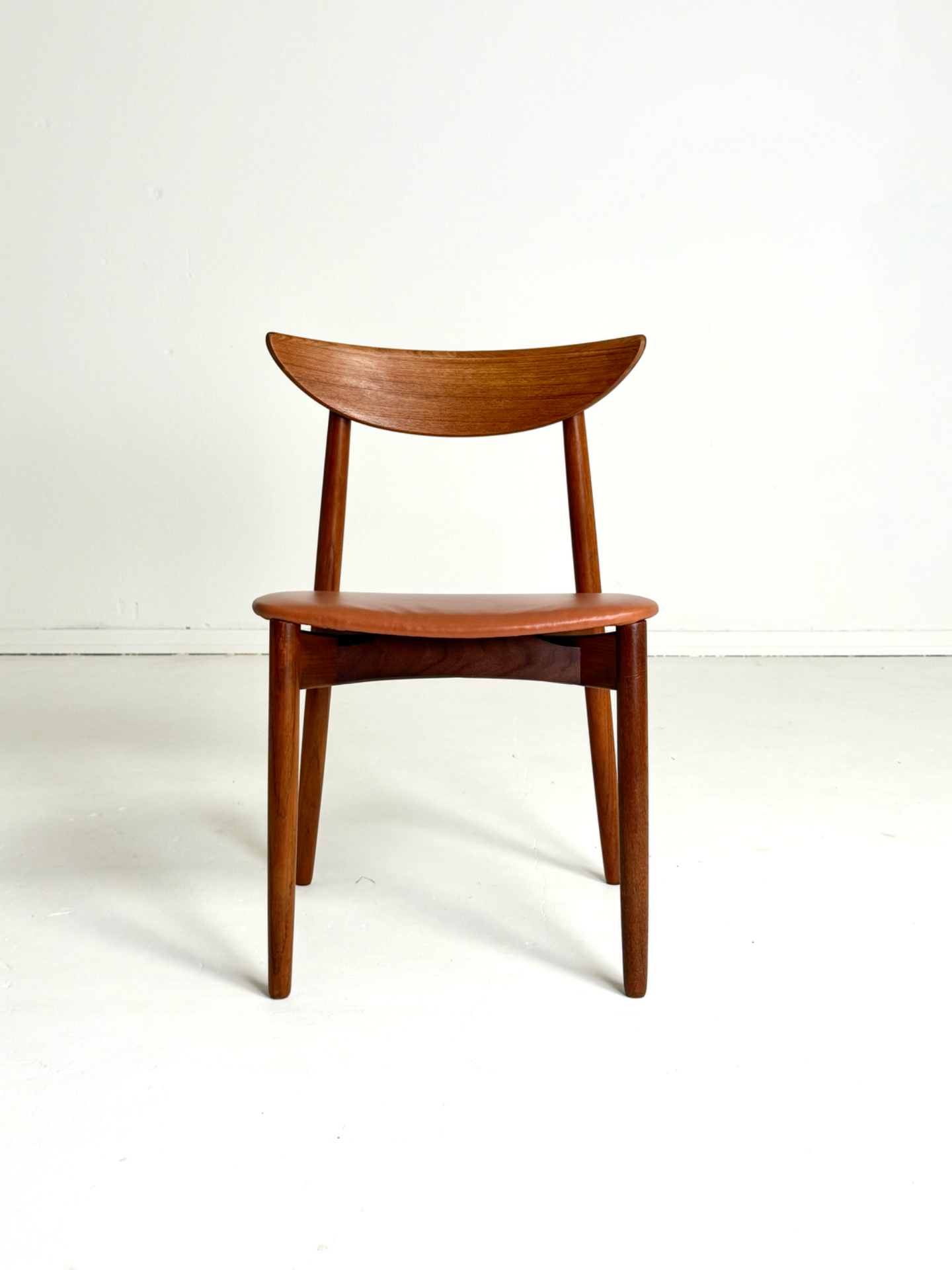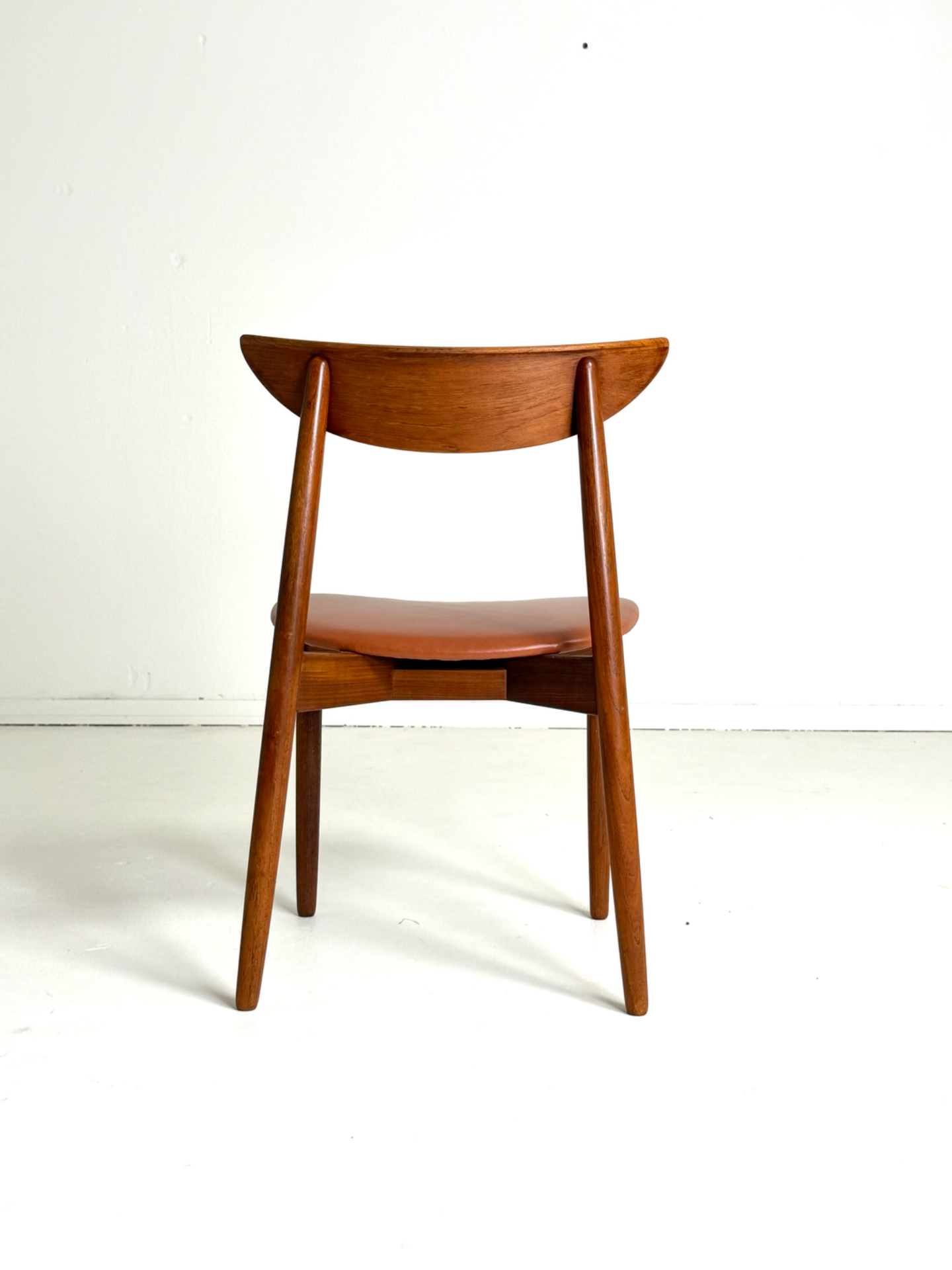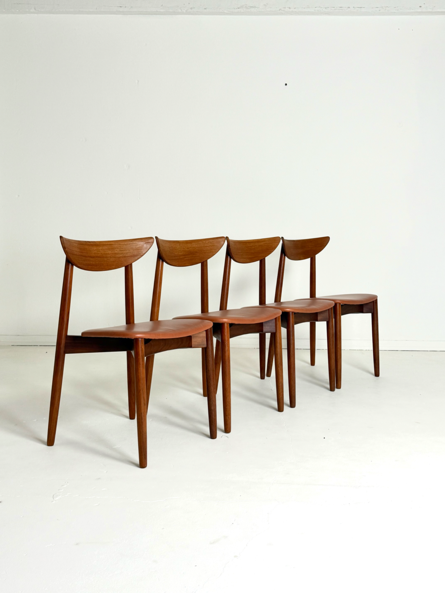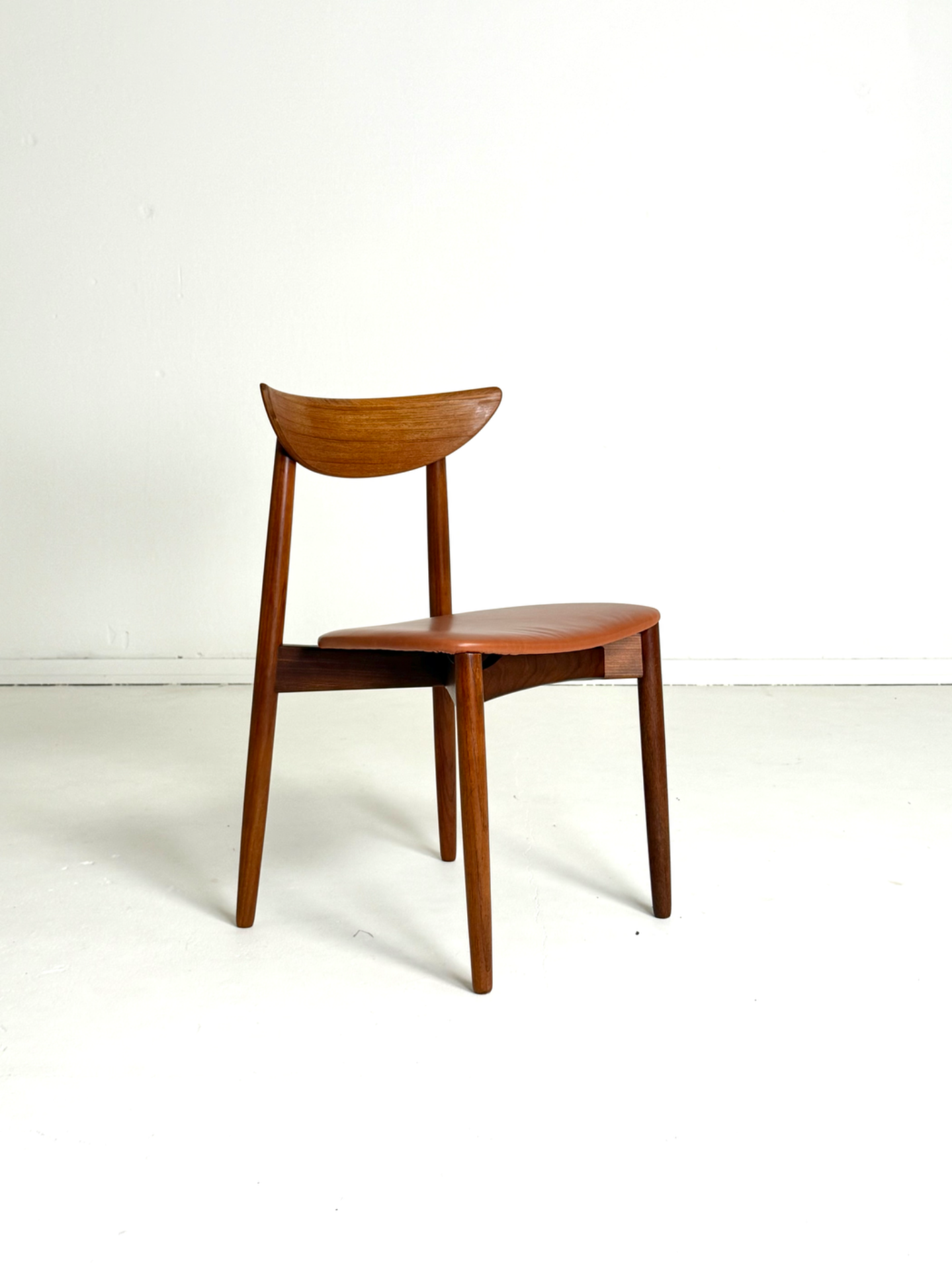 Elegantti neljän tuolin setti, suunnittelija Harry Østergaard, valmistaja Randers Møbelfabrik. Malli 58 edustaa tanskalaisen muotoilun huippua 1950-luvulta — ajaton ja linjakas muotoilu yhdistyy tiikkirunkoon ja uudistettuun istuinosan kierrätysnahkaverhoiluun. Nämä vintage-tuolit ovat täydellinen valinta ruokapöydän ympärille tai yksittäisinä katseenvangitsijoina eri tiloihin.