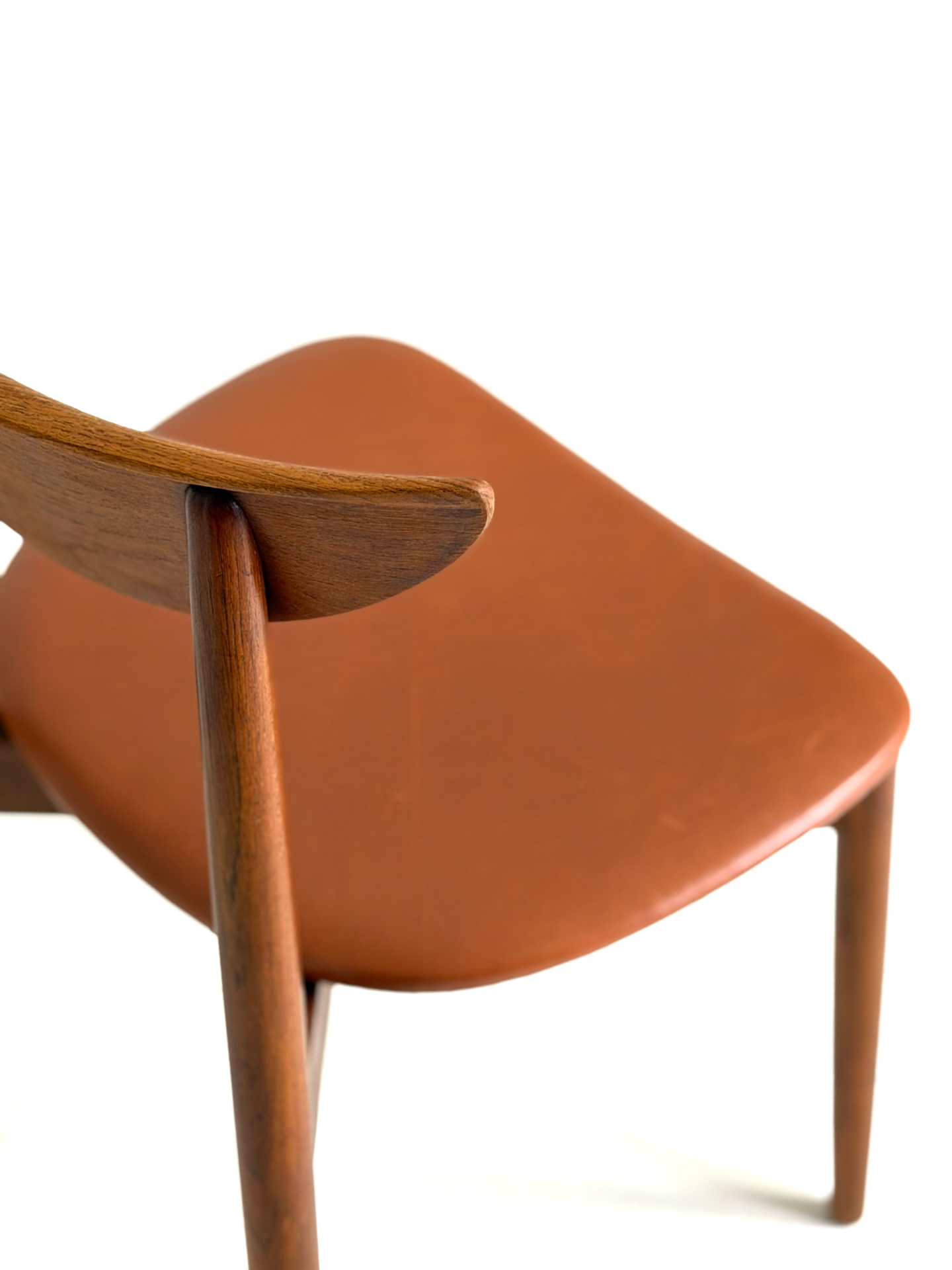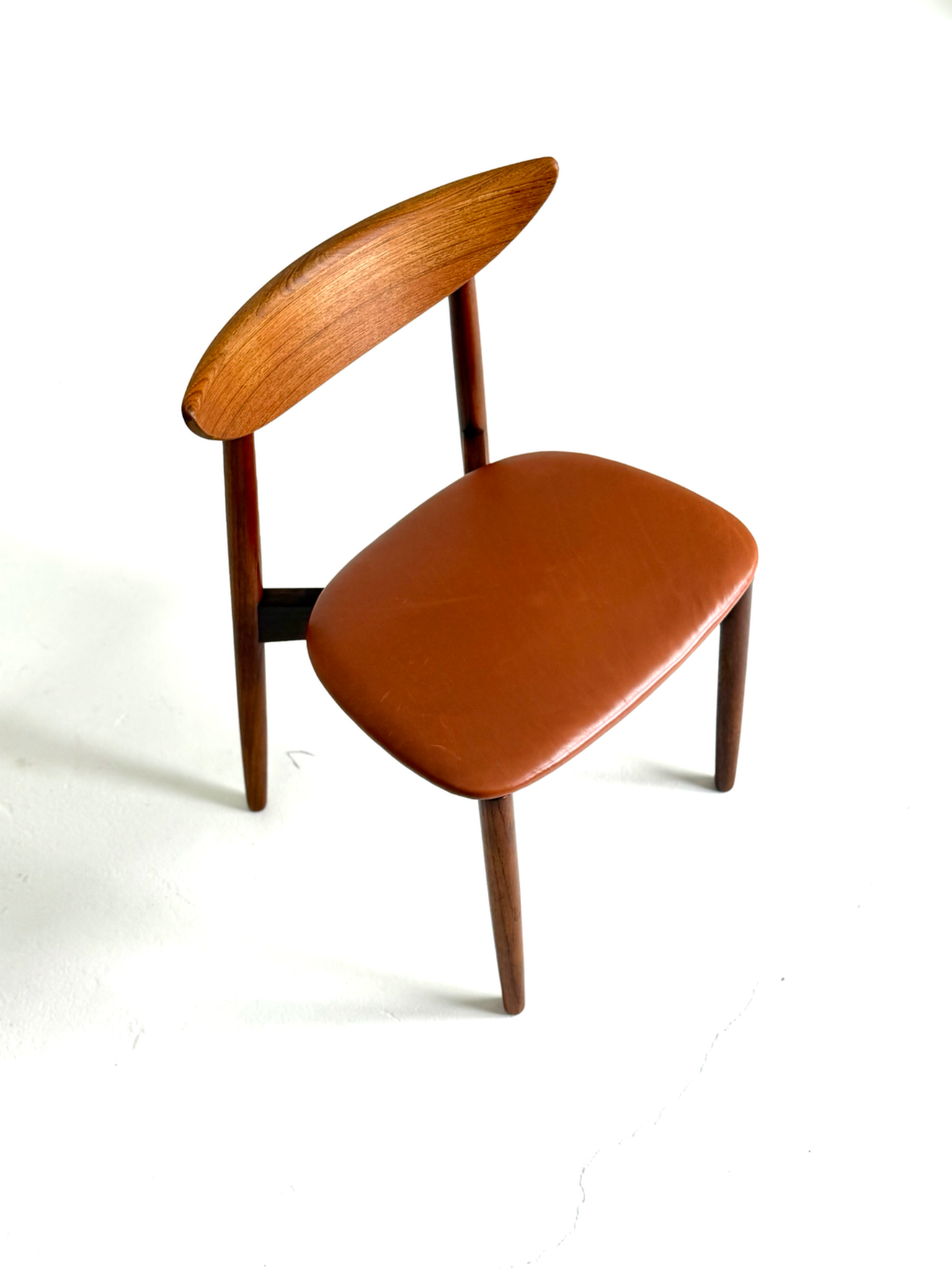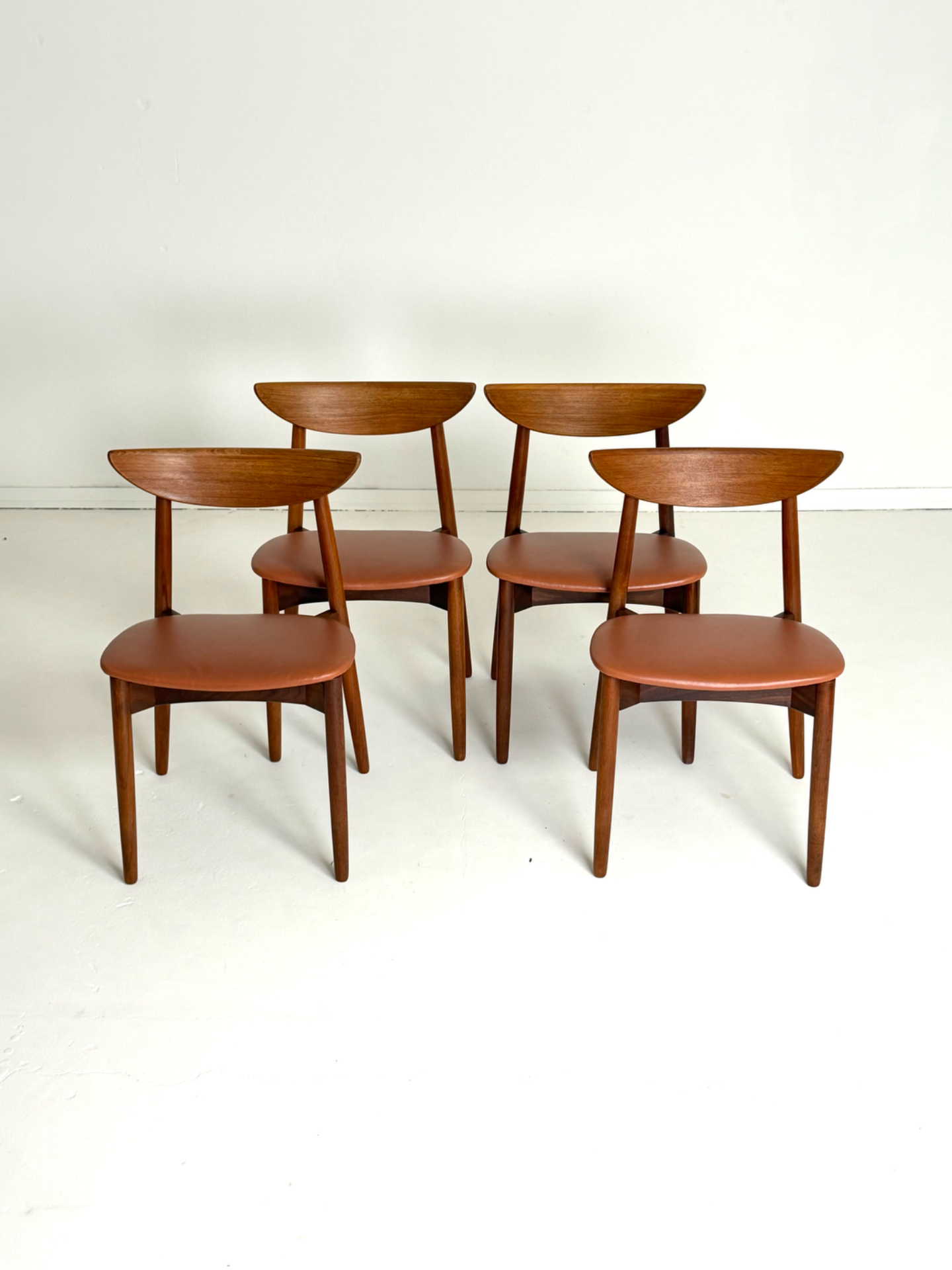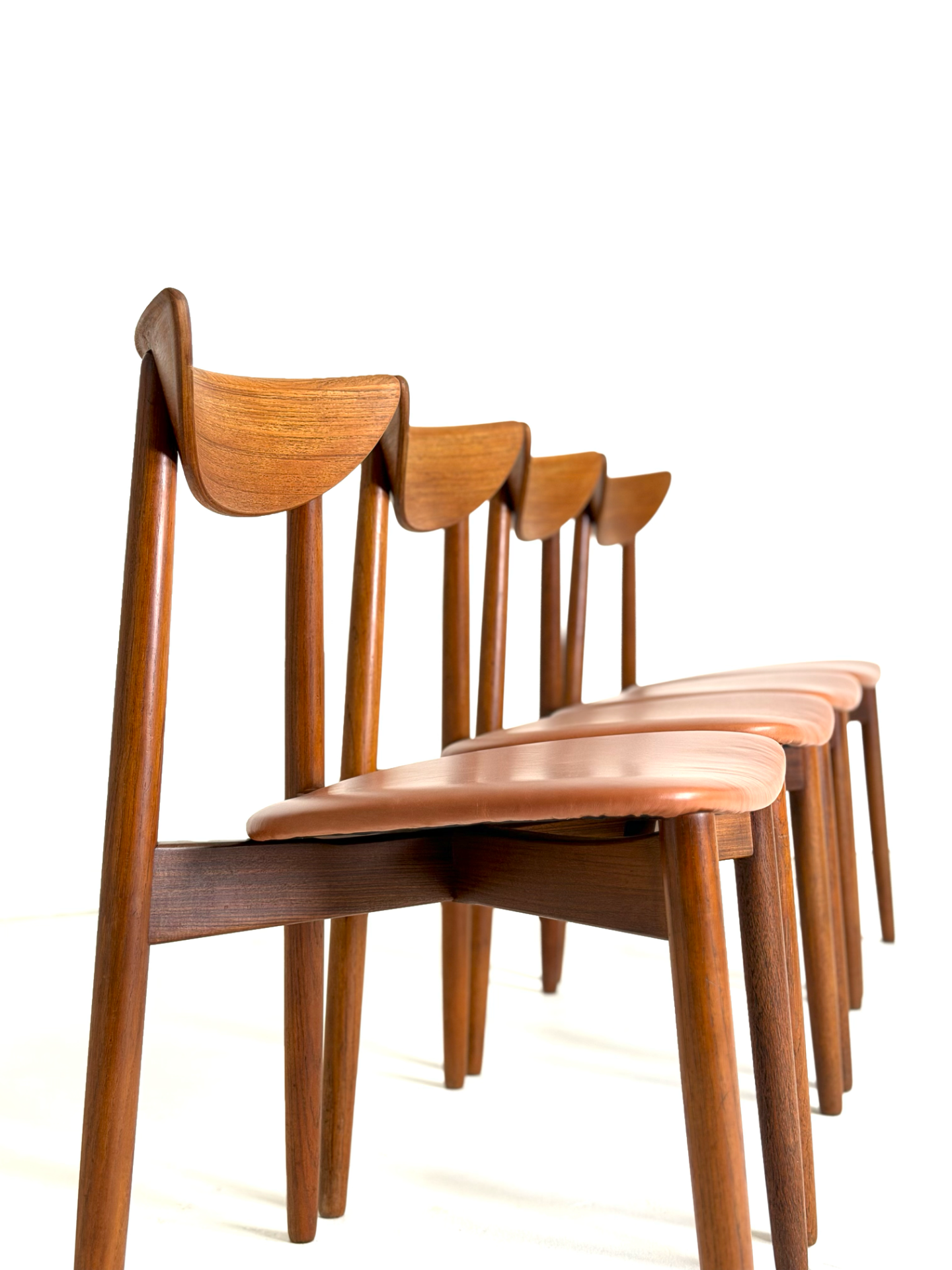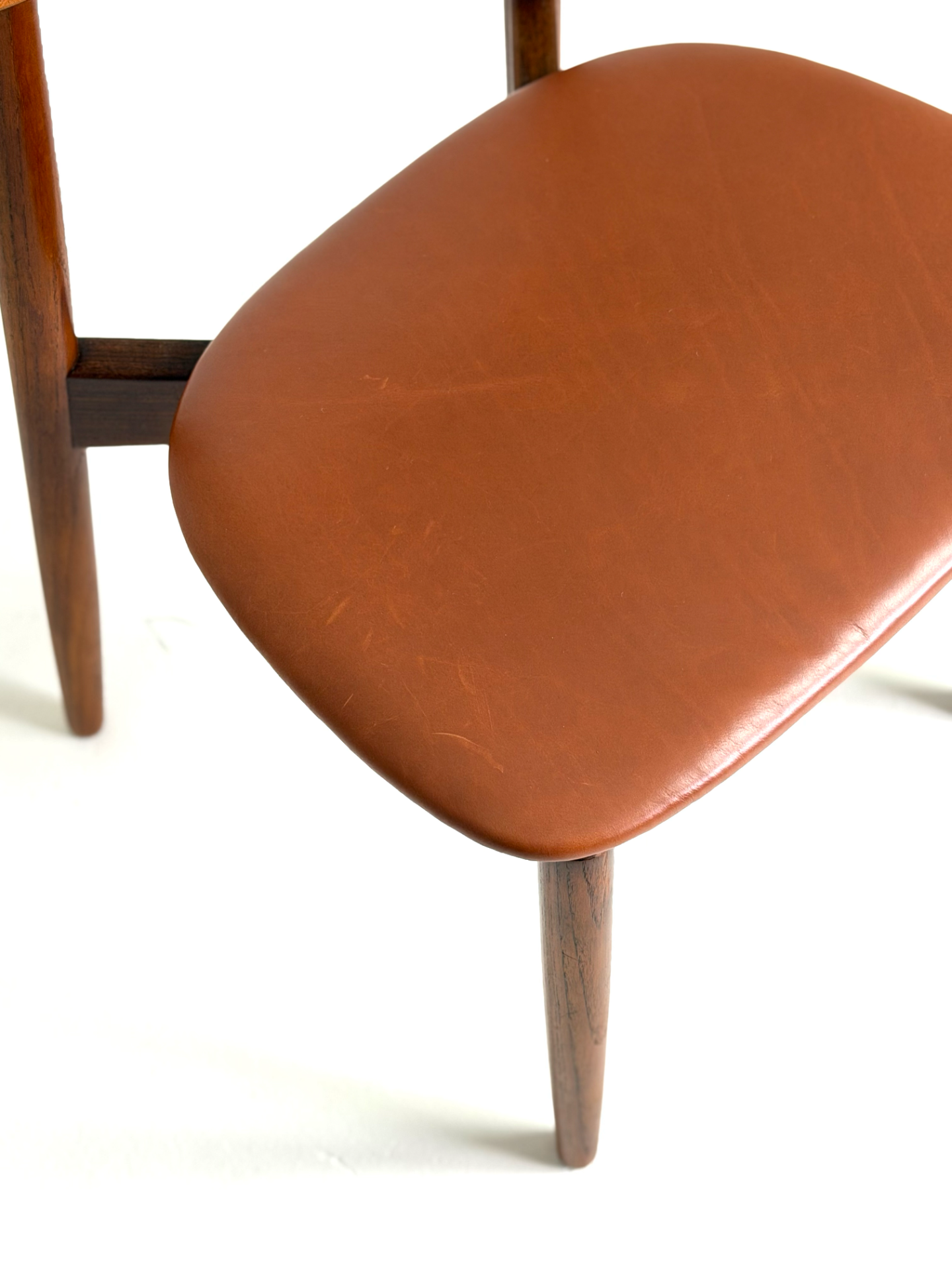 Elegantti neljän tuolin setti, suunnittelija Harry Østergaard, valmistaja Randers Møbelfabrik. Malli 58 edustaa tanskalaisen muotoilun huippua 1950-luvulta — ajaton ja linjakas muotoilu yhdistyy tiikkirunkoon ja uudistettuun istuinosan kierrätysnahkaverhoiluun. Nämä vintage-tuolit ovat täydellinen valinta ruokapöydän ympärille tai yksittäisinä katseenvangitsijoina eri tiloihin.