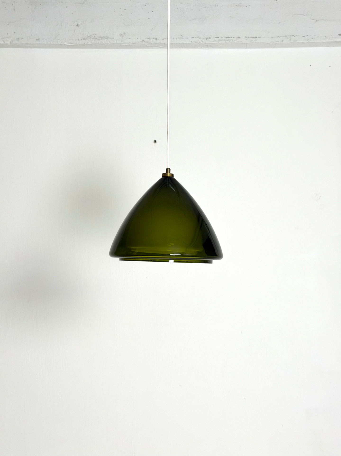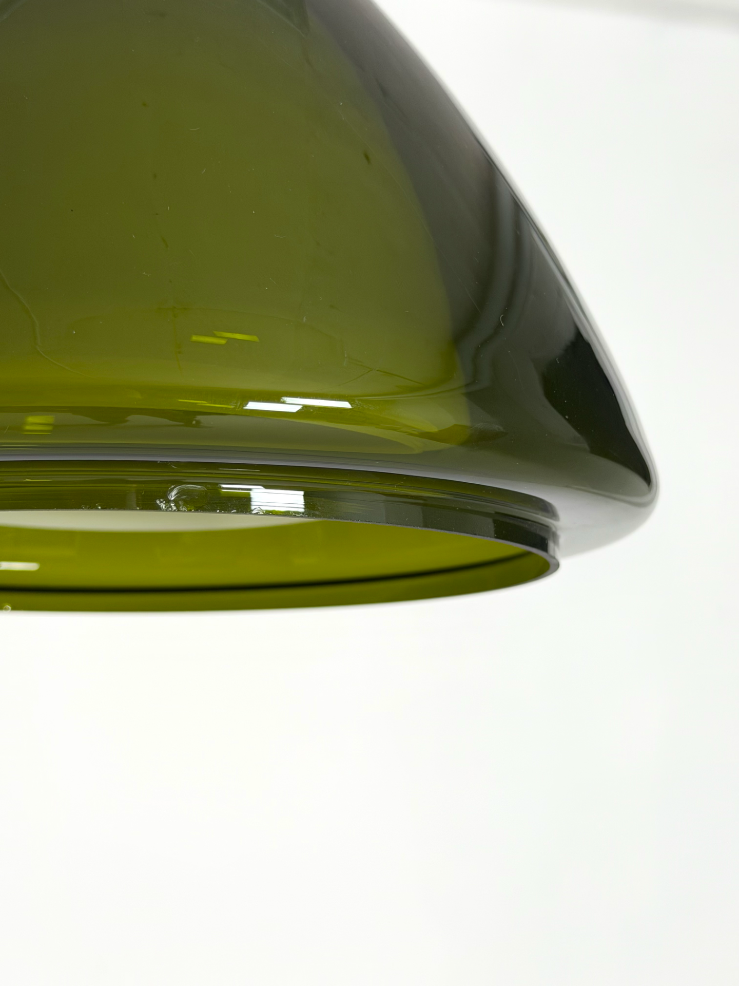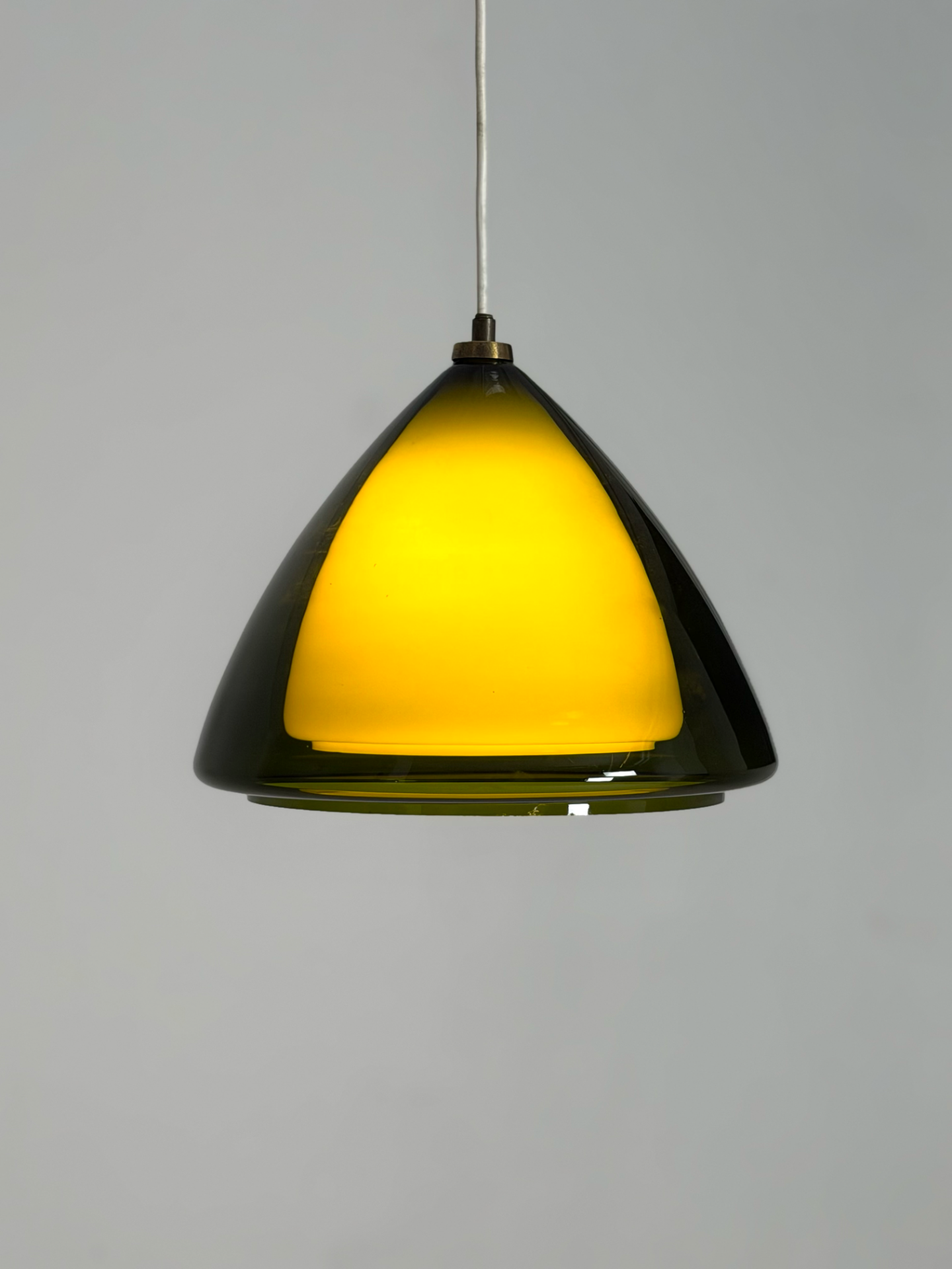 A beautiful vintage pendant lamp by Danish maker Holmegaard. The outer shade is made of deep green glass, while the inner opaline glass diffuser softens the light, creating a warm and cozy atmosphere. Its timeless design and elegant tone make it a stunning addition above a dining table or in a living space.