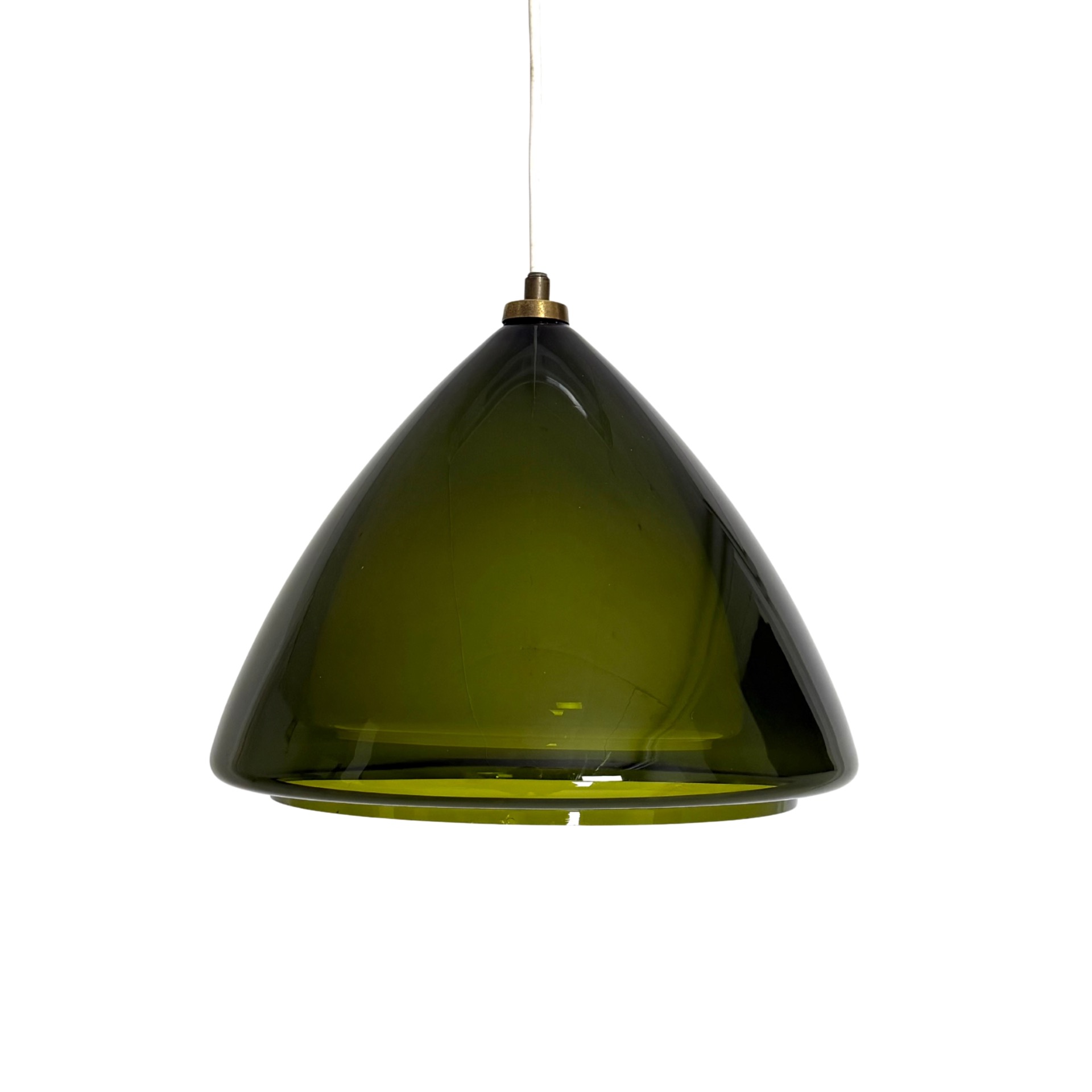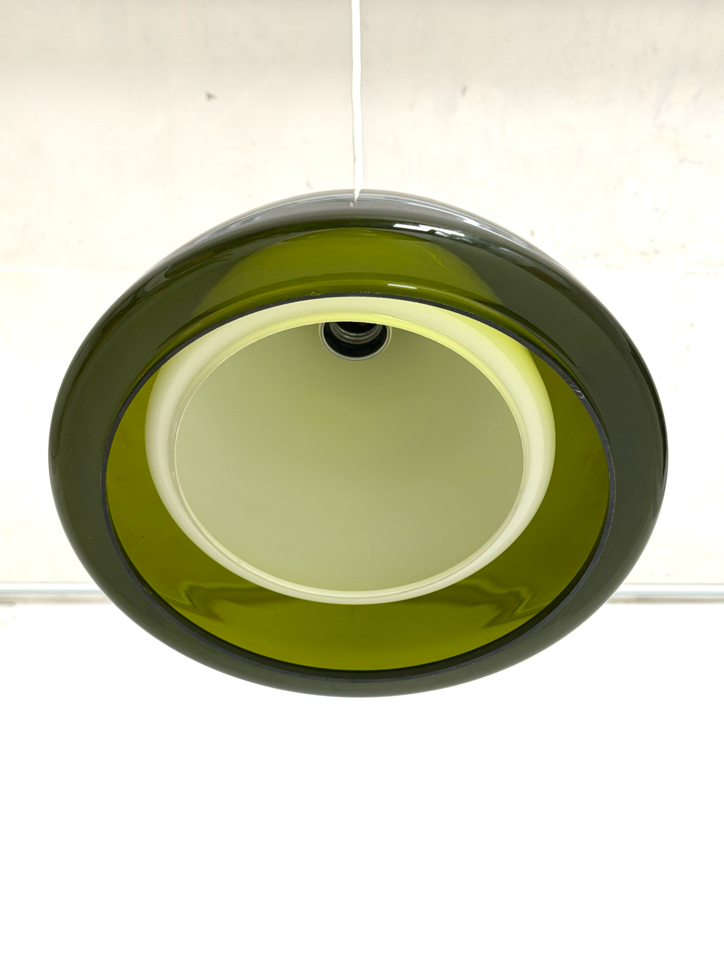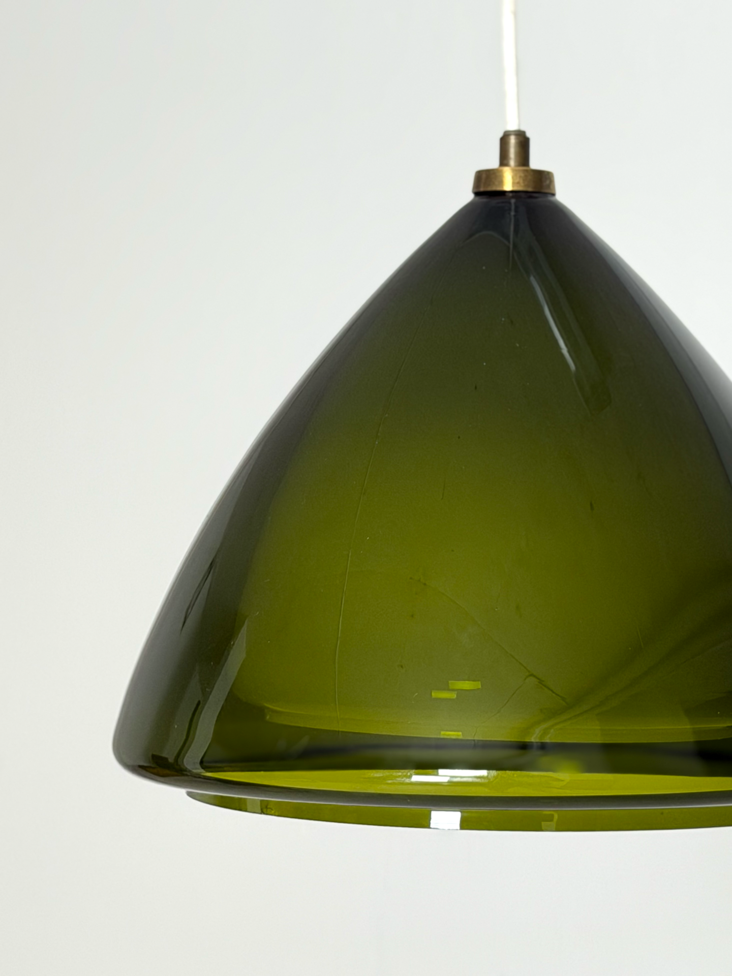 A beautiful vintage pendant lamp by Danish maker Holmegaard. The outer shade is made of deep green glass, while the inner opaline glass diffuser softens the light, creating a warm and cozy atmosphere. Its timeless design and elegant tone make it a stunning addition above a dining table or in a living space.