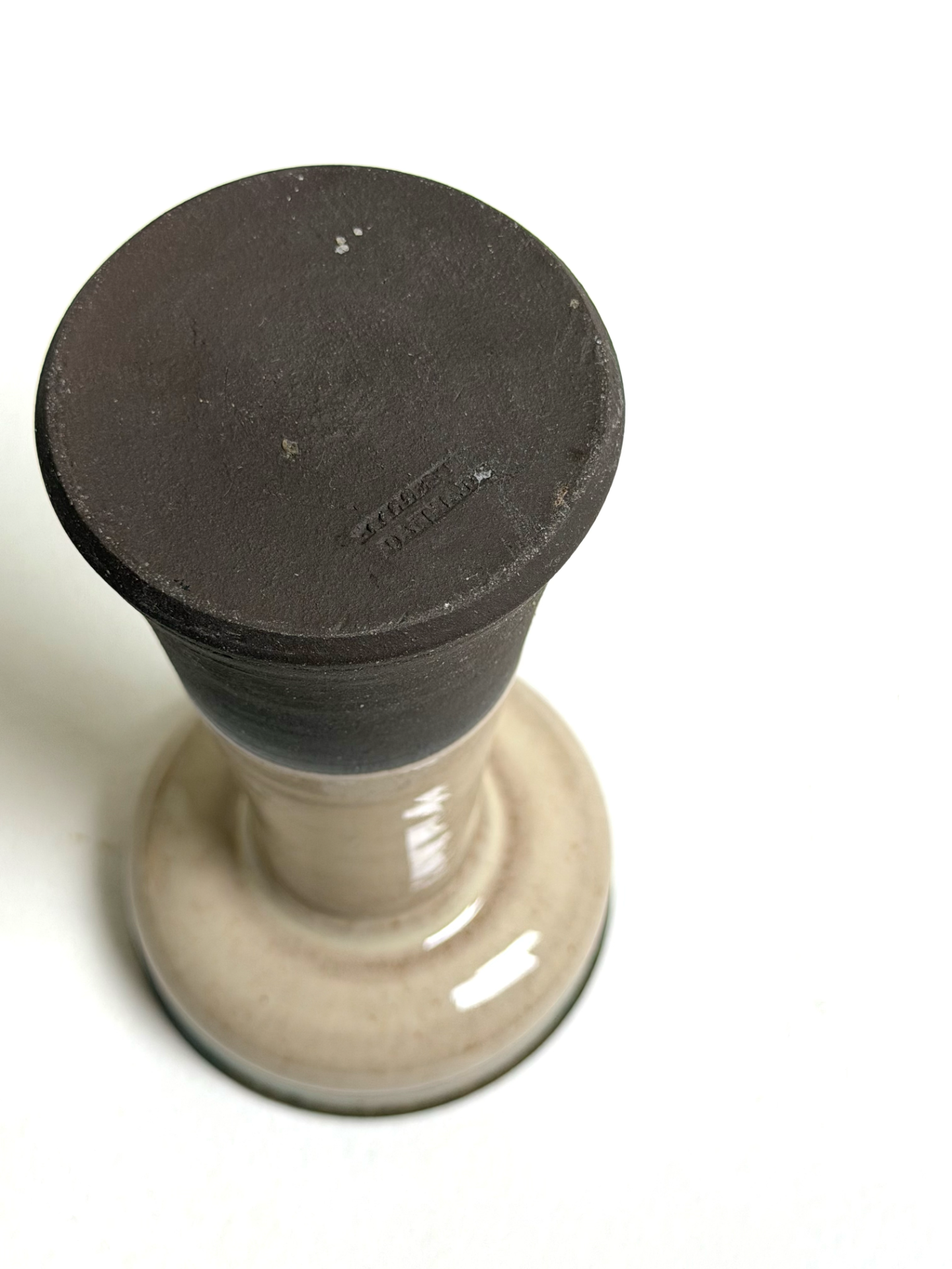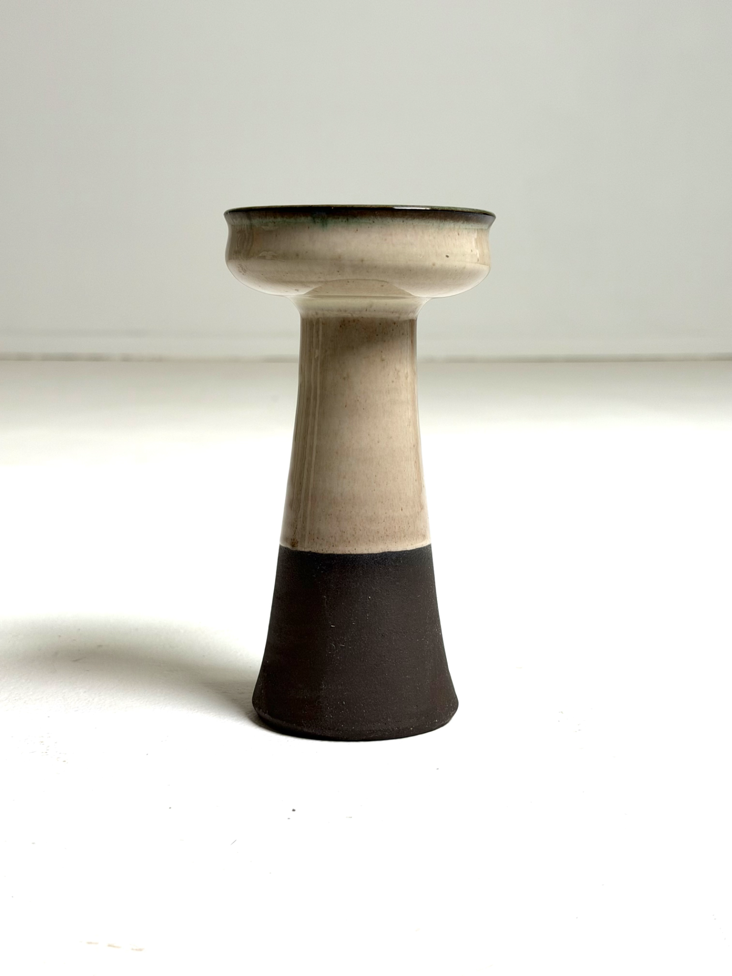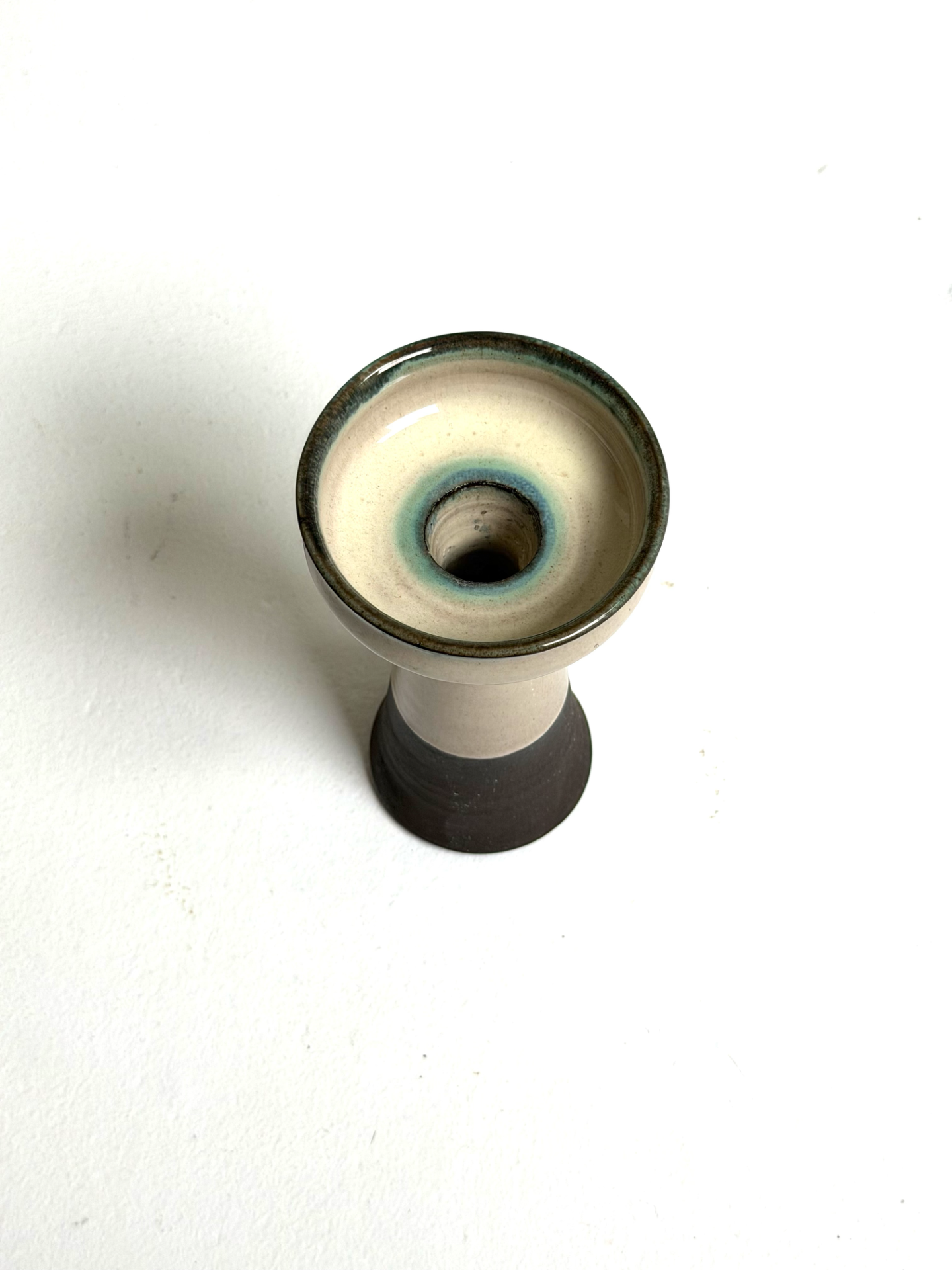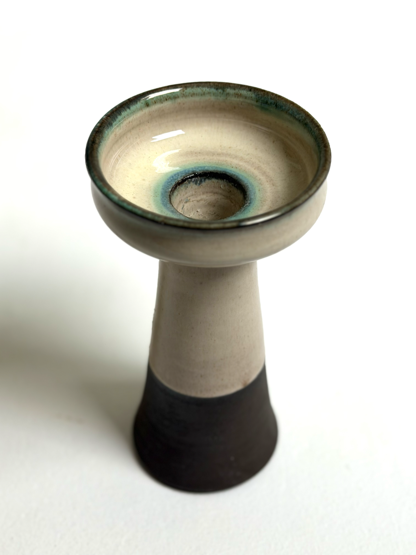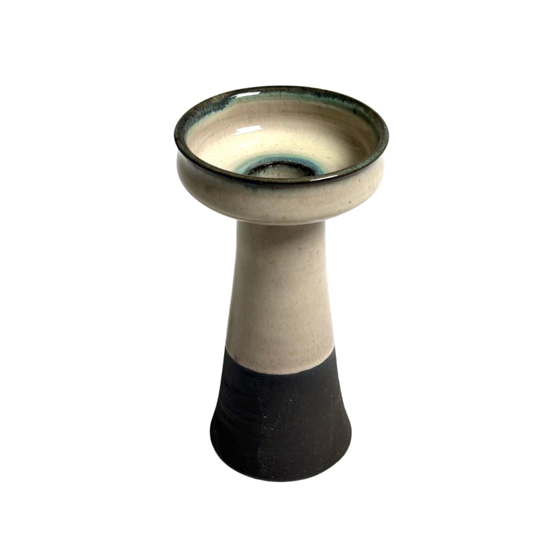 Tanskalainen Hyllested Keramik -studio valmistama veistoksellinen keraaminen maljakko 1970-luvulta. Maljakossa on kauniisti lasitettu yläosa sinivihrein vivahtein, joka sulautuu vaaleaan vartaloon ja tummaan pohjaan. Muodoltaan muistuttaa klassista jalustaa tai kynttilänjalkaa – keramiikkataidetta, joka toimii yhtä lailla käyttöesineenä kuin sisustuselementtinä.
