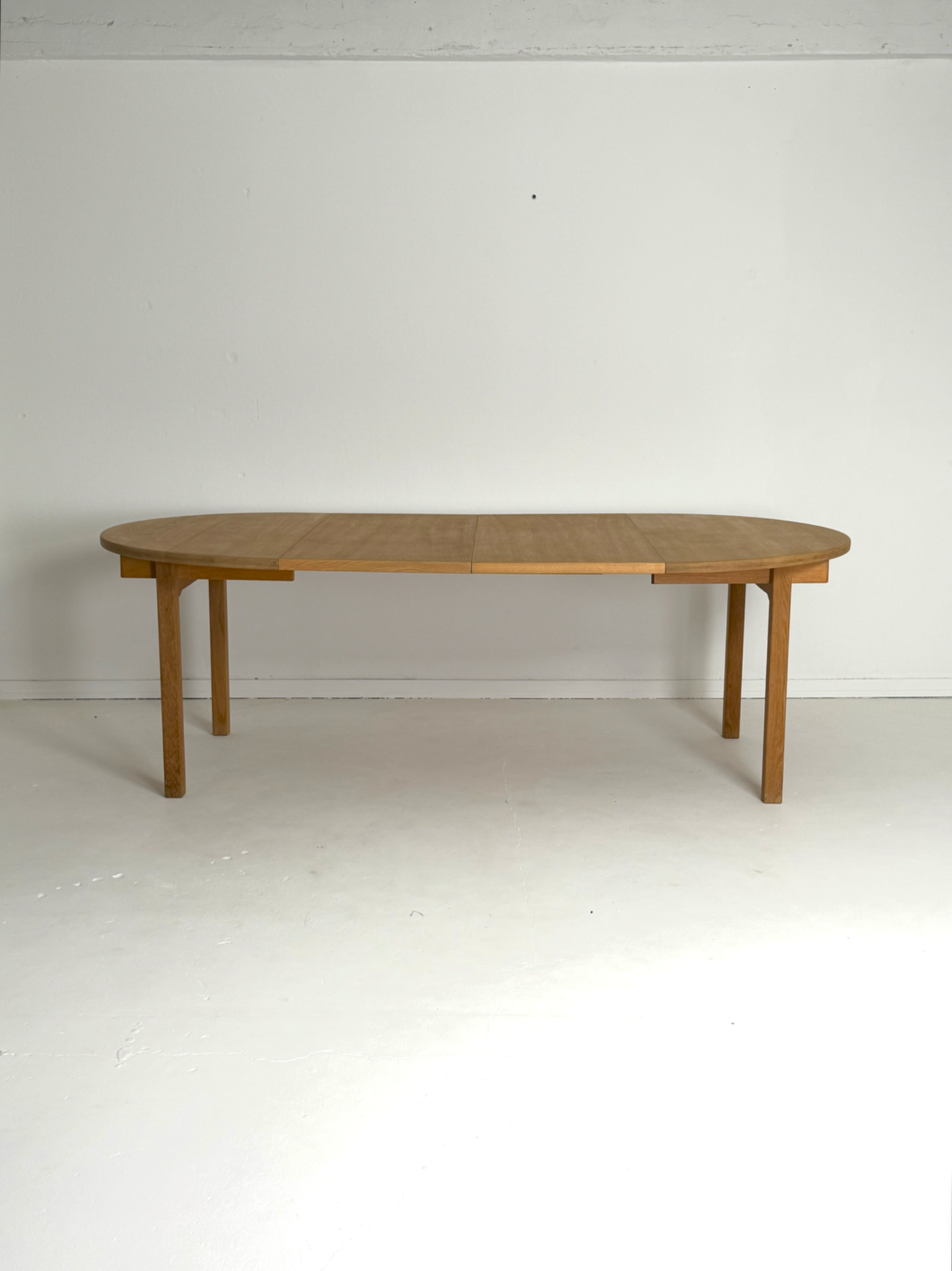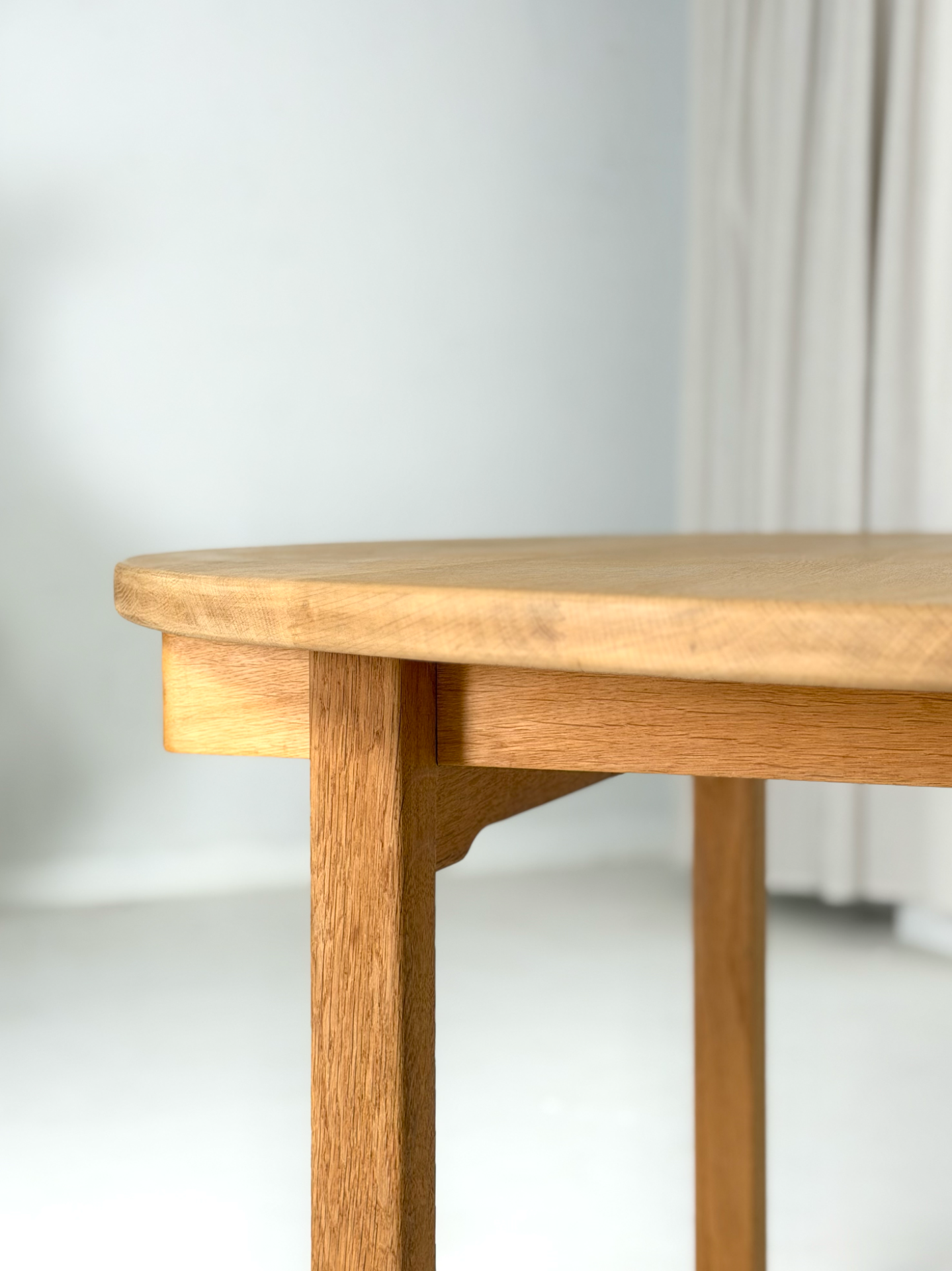Tanskalainen muotoilija Kurt Østervigin suunnittelema tyylikäs ja käytännöllinen pyöreä ruokapöytä 1960-luvulta. Valmistaja KP Møbler. Pöytä on valmistettu massiivitammesta, ja siihen kuuluu kaksi erillistä jatkopalaa. Ilman jatkopaloja pöydän ääreen mahtuu mukavasti 4 henkilöä, jatkettuna jopa 10. Tämä klassinen ja ajaton pöytä toimii erinomaisesti sekä arjessa että juhlahetkissä. Pöytä on käsitelty huonekalusaippualla, mikä antaa pöydän pinalle kauniin, vaalean tammean sävyn. Pöydän kansi patinoituu yleensä käytössä ja sitä tulee huoltaa huonekalusaippualla.