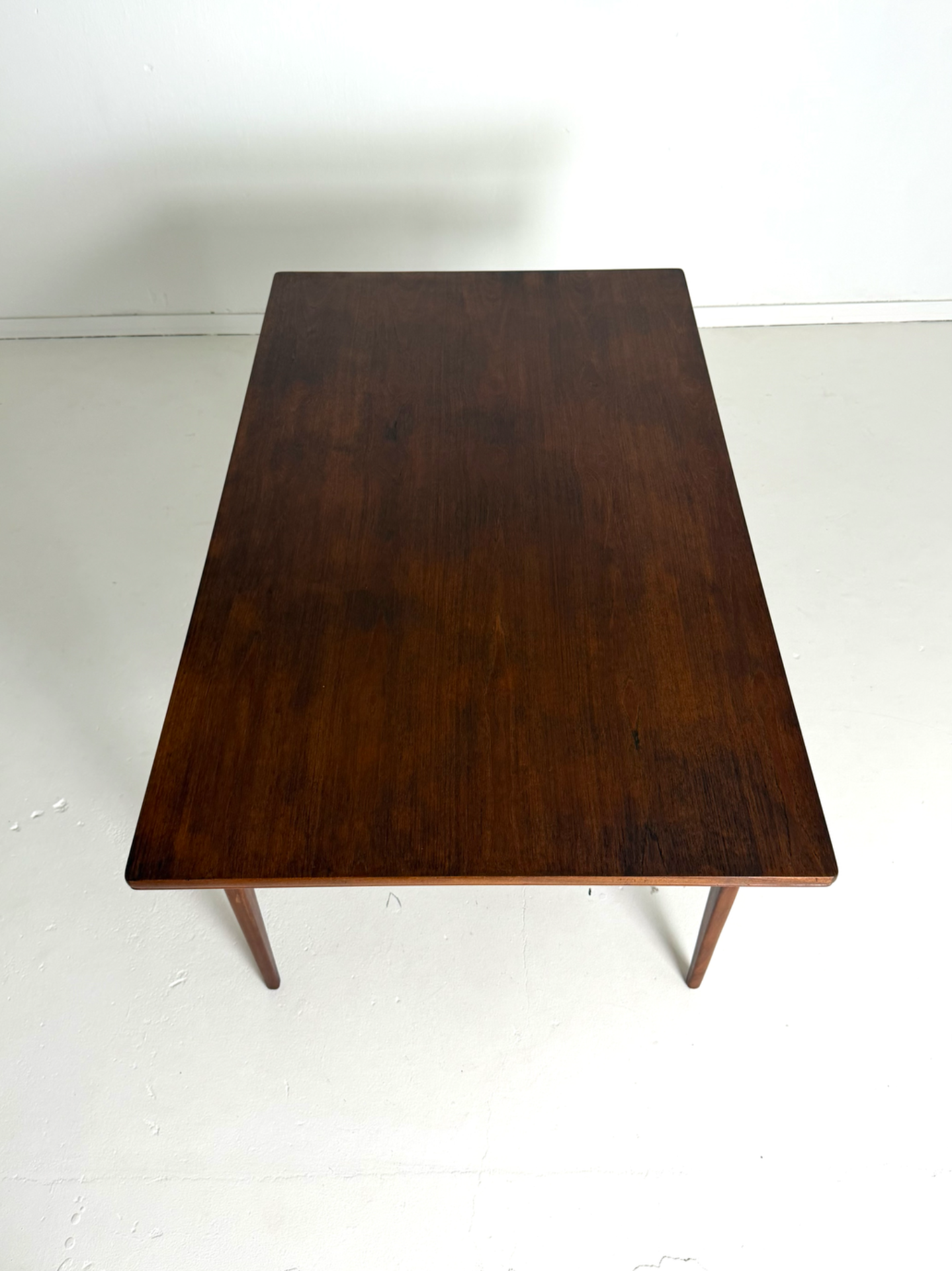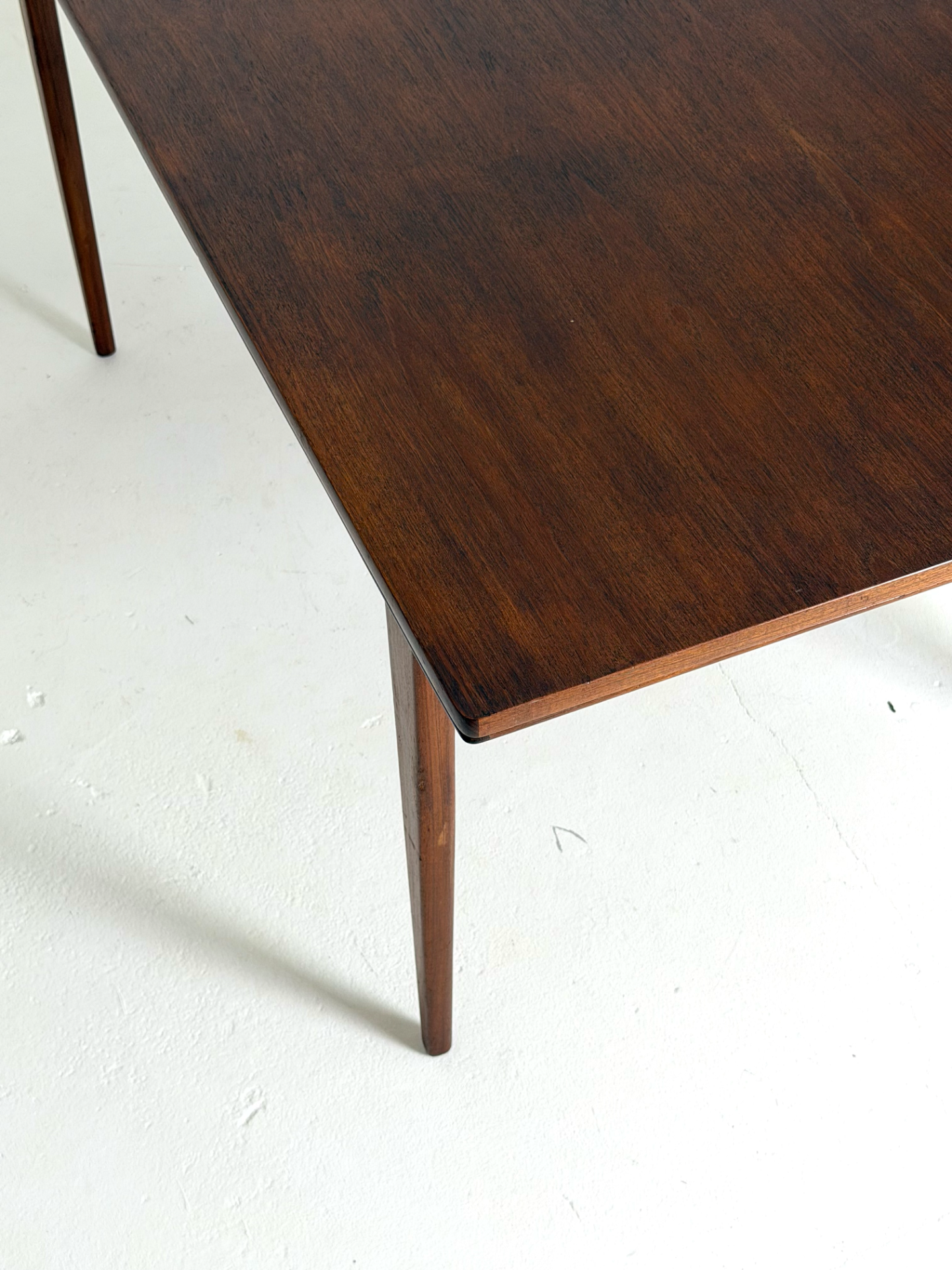 Tyylikäs ja ajattoman elegantti tanskalainen ruokapöytä 1960-luvulta. Pöydän kauniisti sävyttynyt tiikkipinta ja siro, mutta tukeva rakenne edustavat skandinaavisen muotoilun hienostuneinta linjaa.