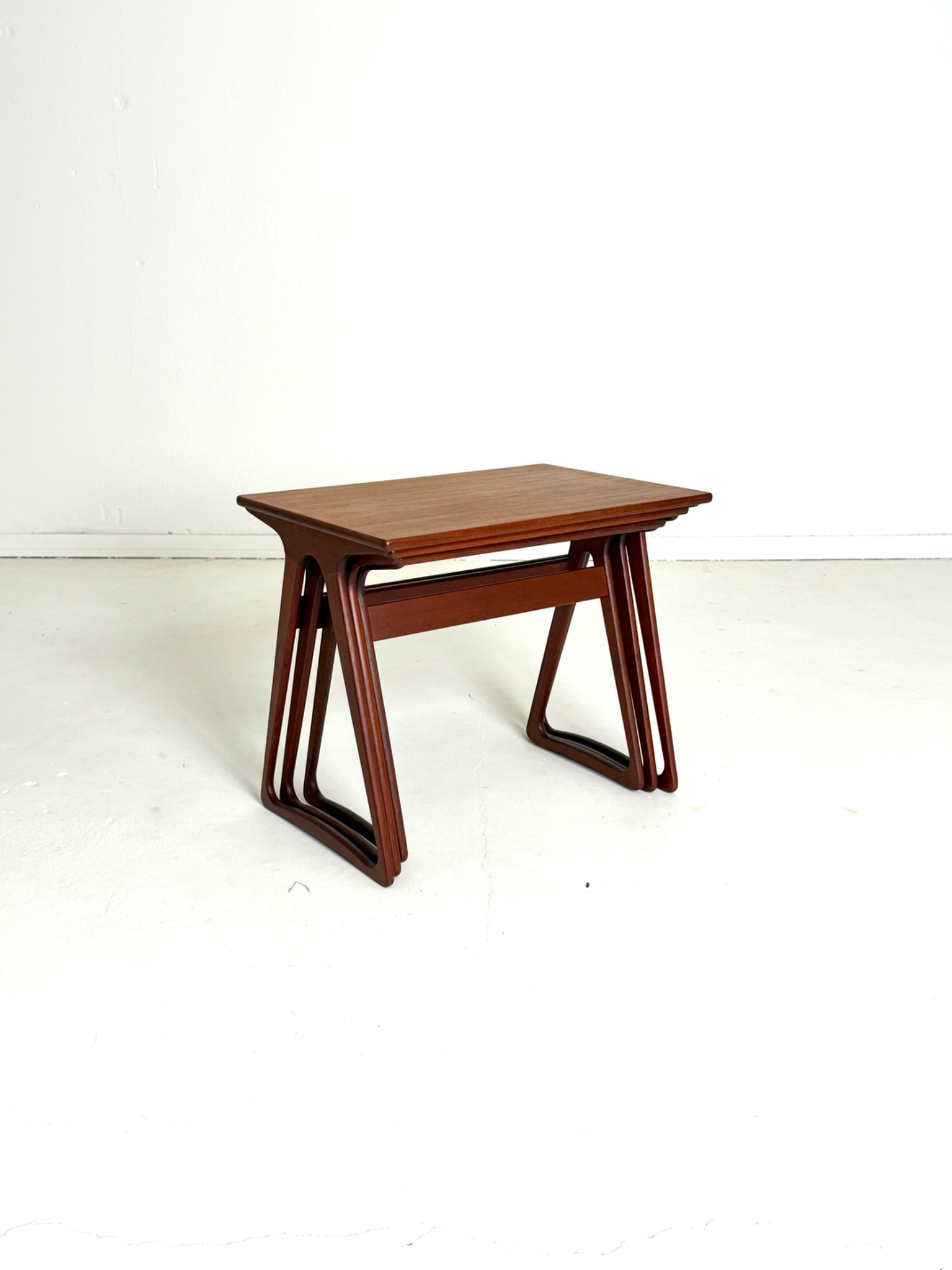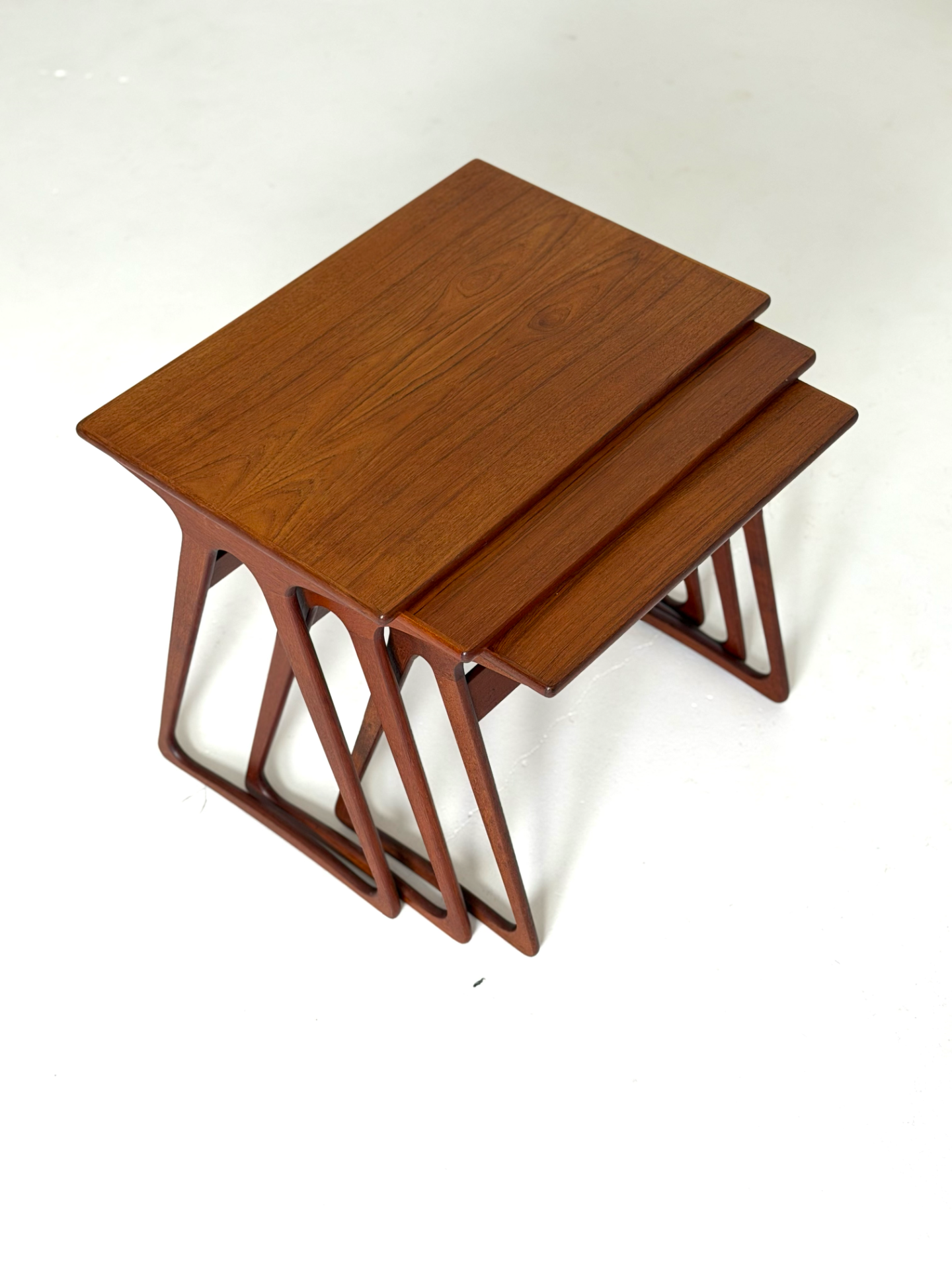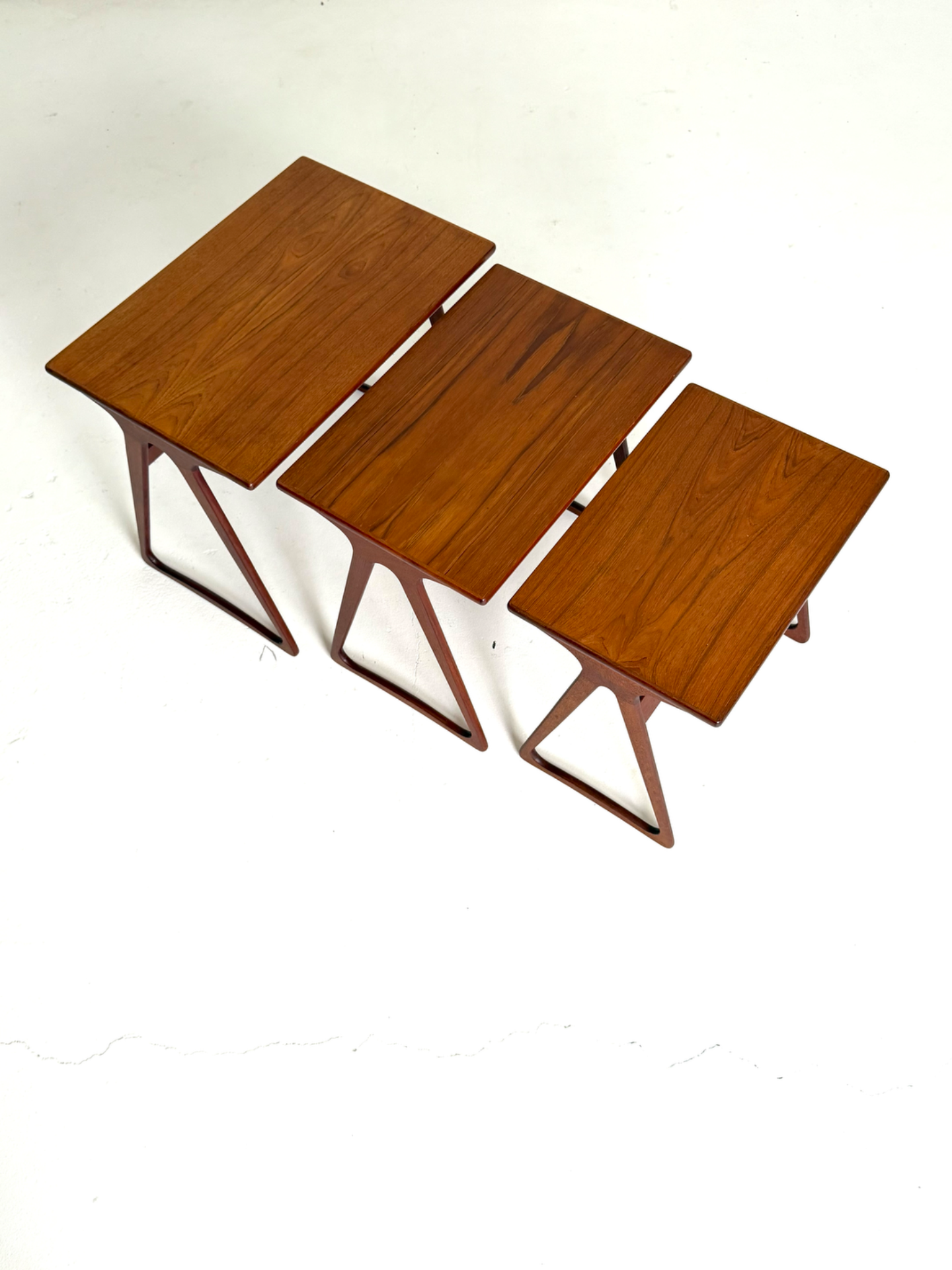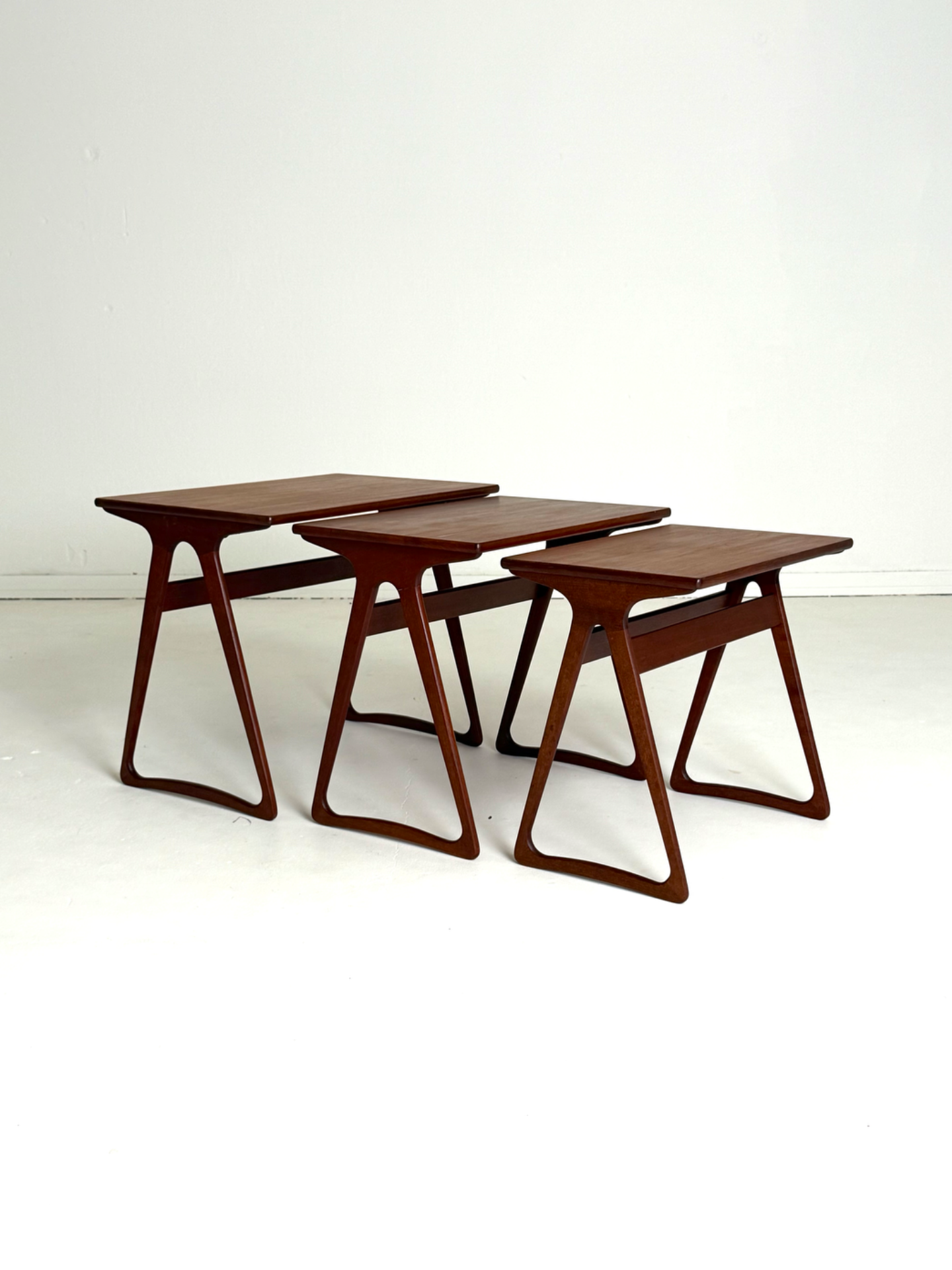 Rare and elegant set of teak nesting tables designed by renowned Danish designer Johannes Andersen in the 1960s. Manufactured by CFC Silkeborg. The set includes three tables of graduating size that slide smoothly beneath each other. Sculptural legs and refined joinery reflect the craftsmanship and timeless appeal of Danish modern design. A versatile and functional piece that adds character to any interior.