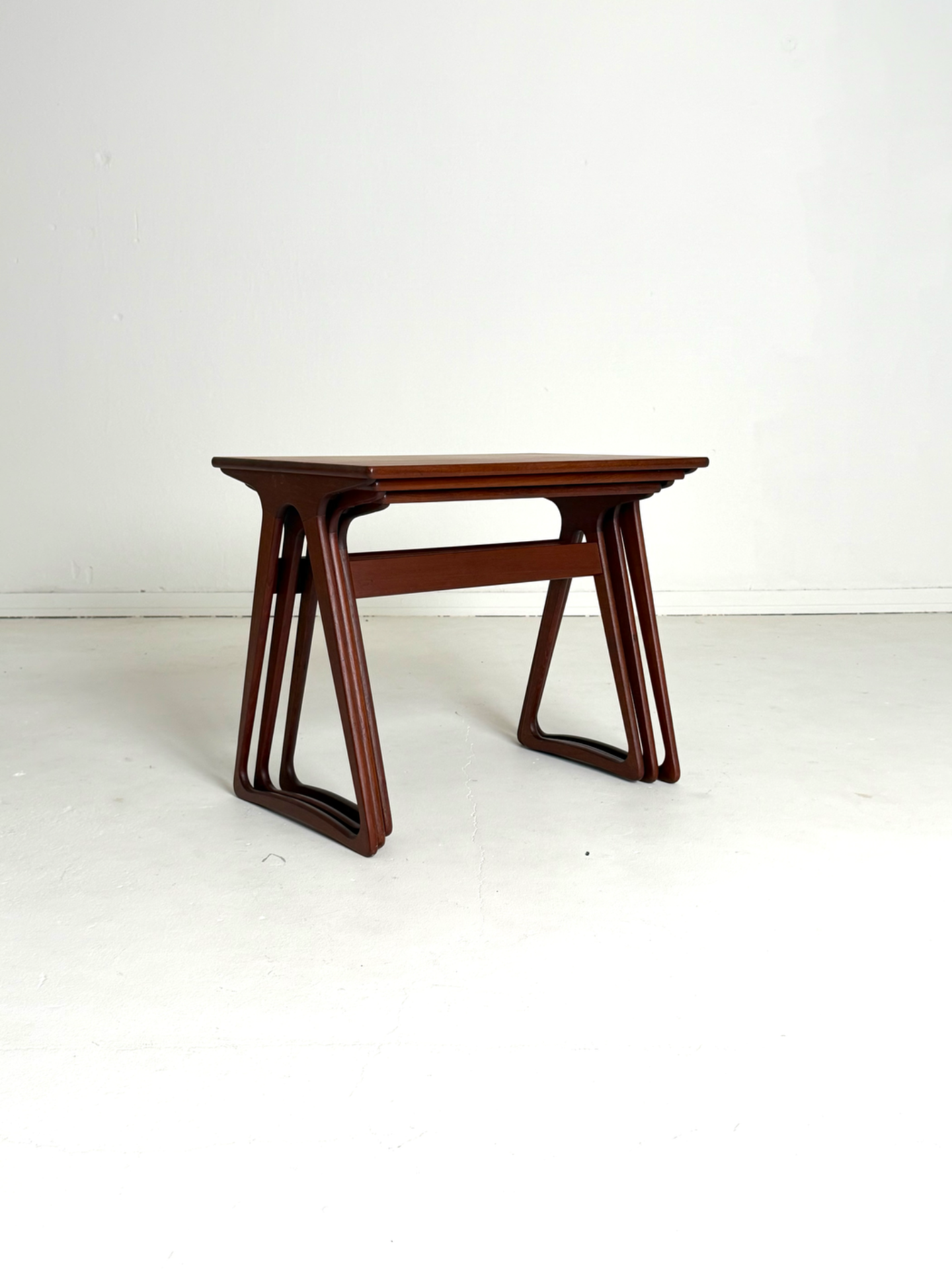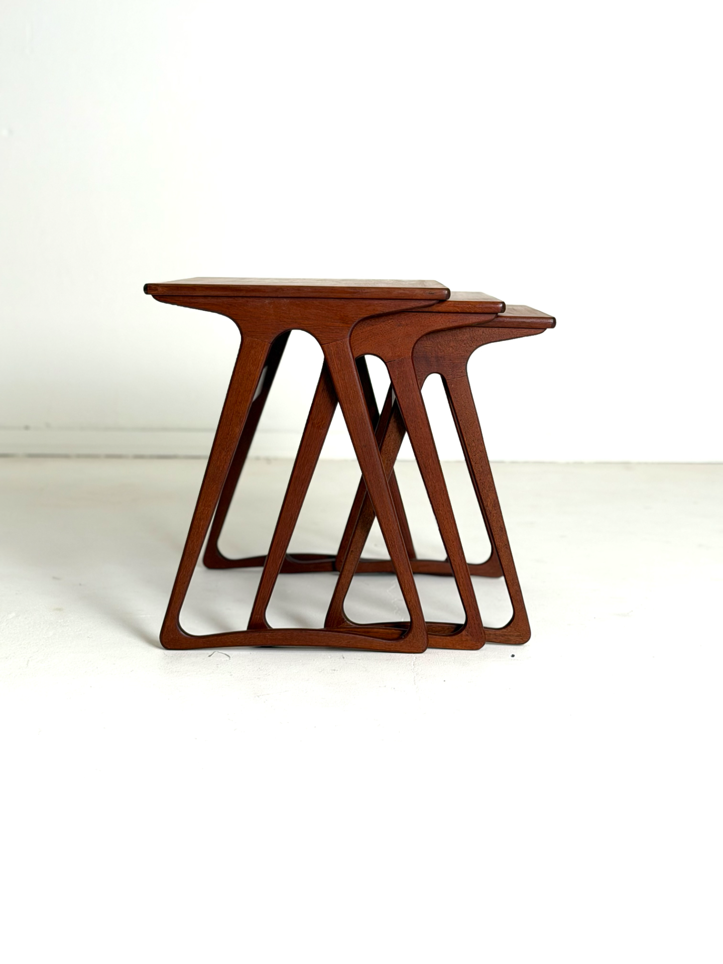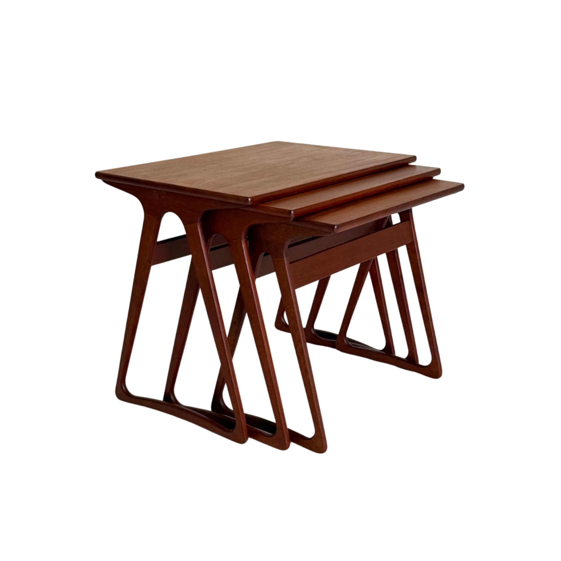 Rare and elegant set of teak nesting tables designed by renowned Danish designer Johannes Andersen in the 1960s. Manufactured by CFC Silkeborg. The set includes three tables of graduating size that slide smoothly beneath each other. Sculptural legs and refined joinery reflect the craftsmanship and timeless appeal of Danish modern design. A versatile and functional piece that adds character to any interior.
