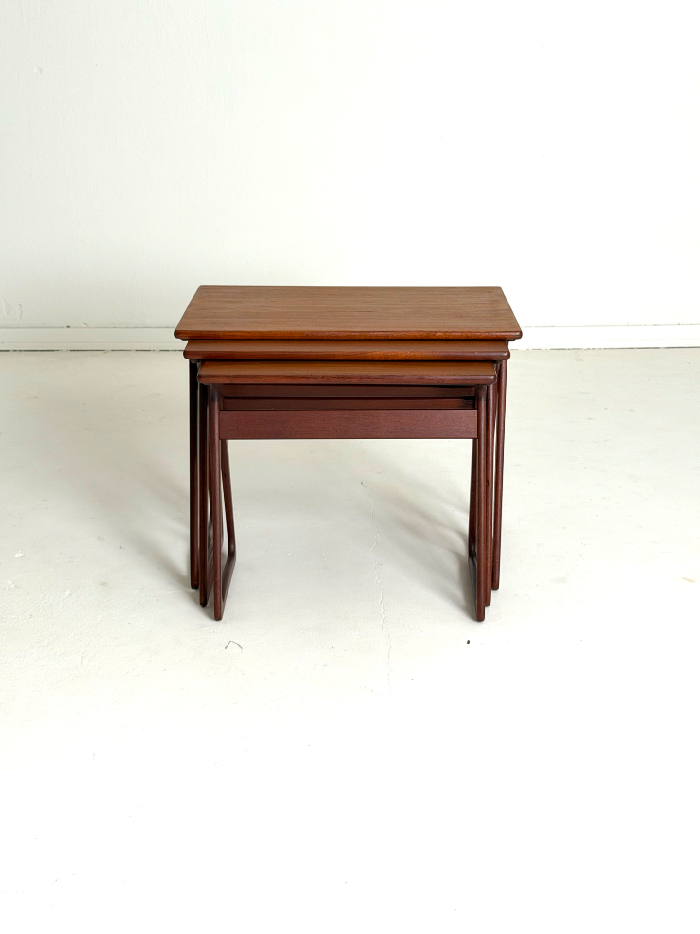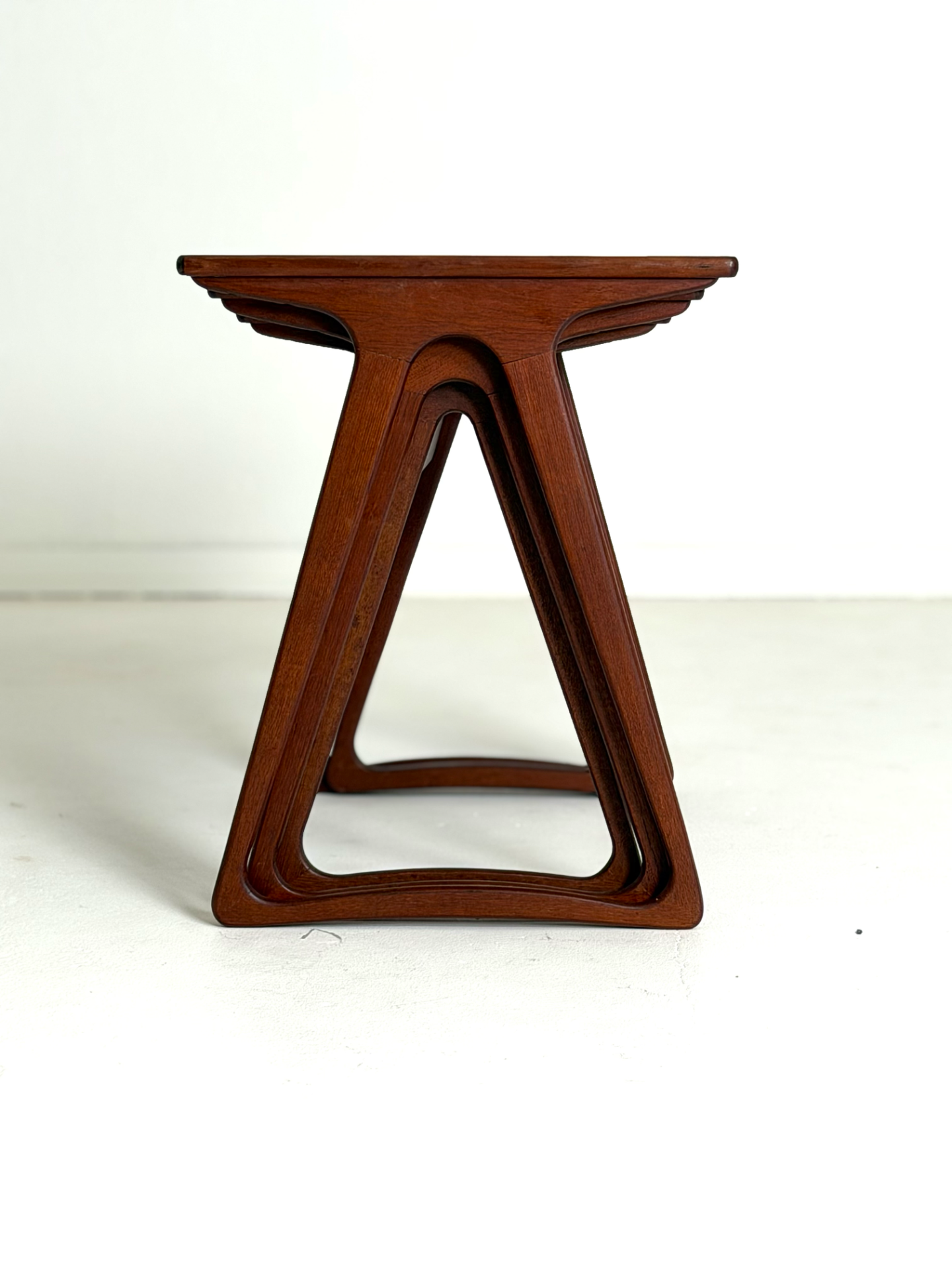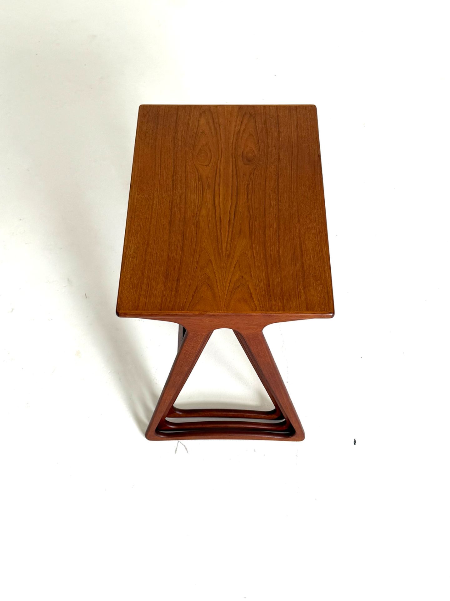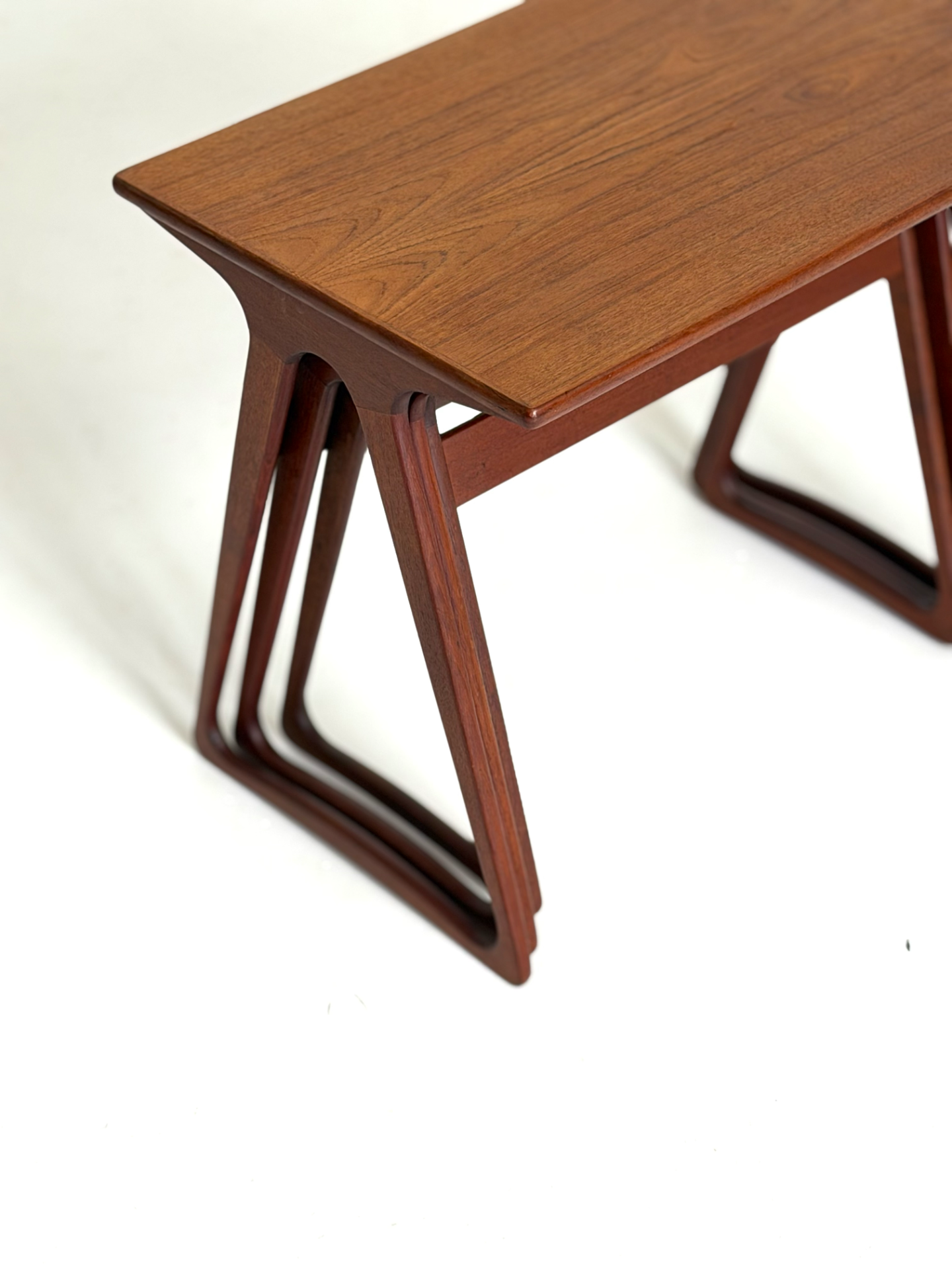 Rare and elegant set of teak nesting tables designed by renowned Danish designer Johannes Andersen in the 1960s. Manufactured by CFC Silkeborg. The set includes three tables of graduating size that slide smoothly beneath each other. Sculptural legs and refined joinery reflect the craftsmanship and timeless appeal of Danish modern design. A versatile and functional piece that adds character to any interior.