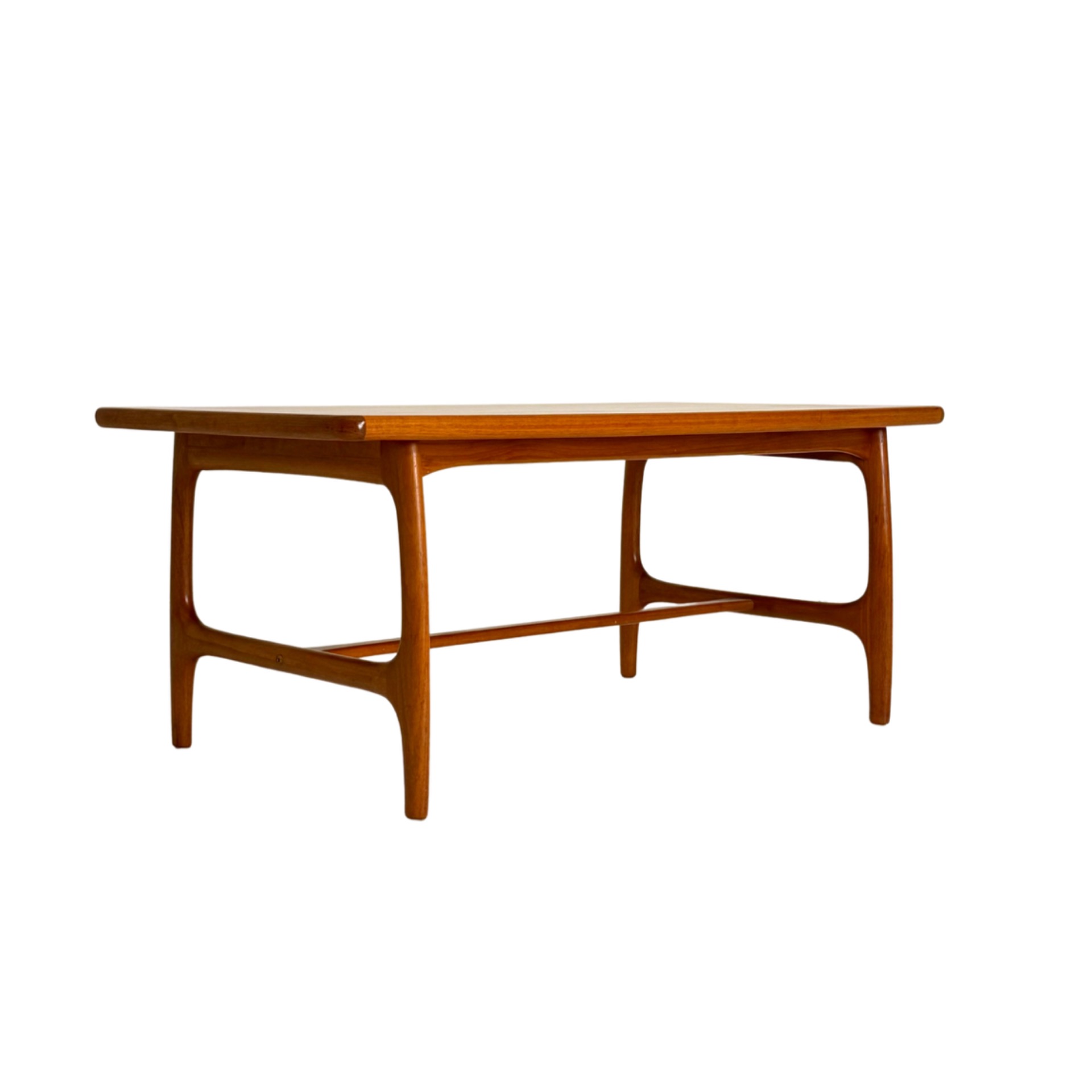 Johannes Andersenin Uldum Møbelfabrikille suunnittelema elegantti jatkettava ruokapöytä 1960-luvun Tanskasta. Valmistettu tiikistä, pöydässä korostuvat pyöristetyt reunat, virtaviivainen muotoilu ja huolellisesti viimeistellyt yksityiskohdat. Pöydän toiseen päähän on integroitu paikka jatkopalalle. Klassinen ja laadukas esimerkki tanskalaisesta huonekalumuotoilusta. Kansi käsitelty pinnan vaurioiden vuoksi lähes mustalla huonekaluvahalla.