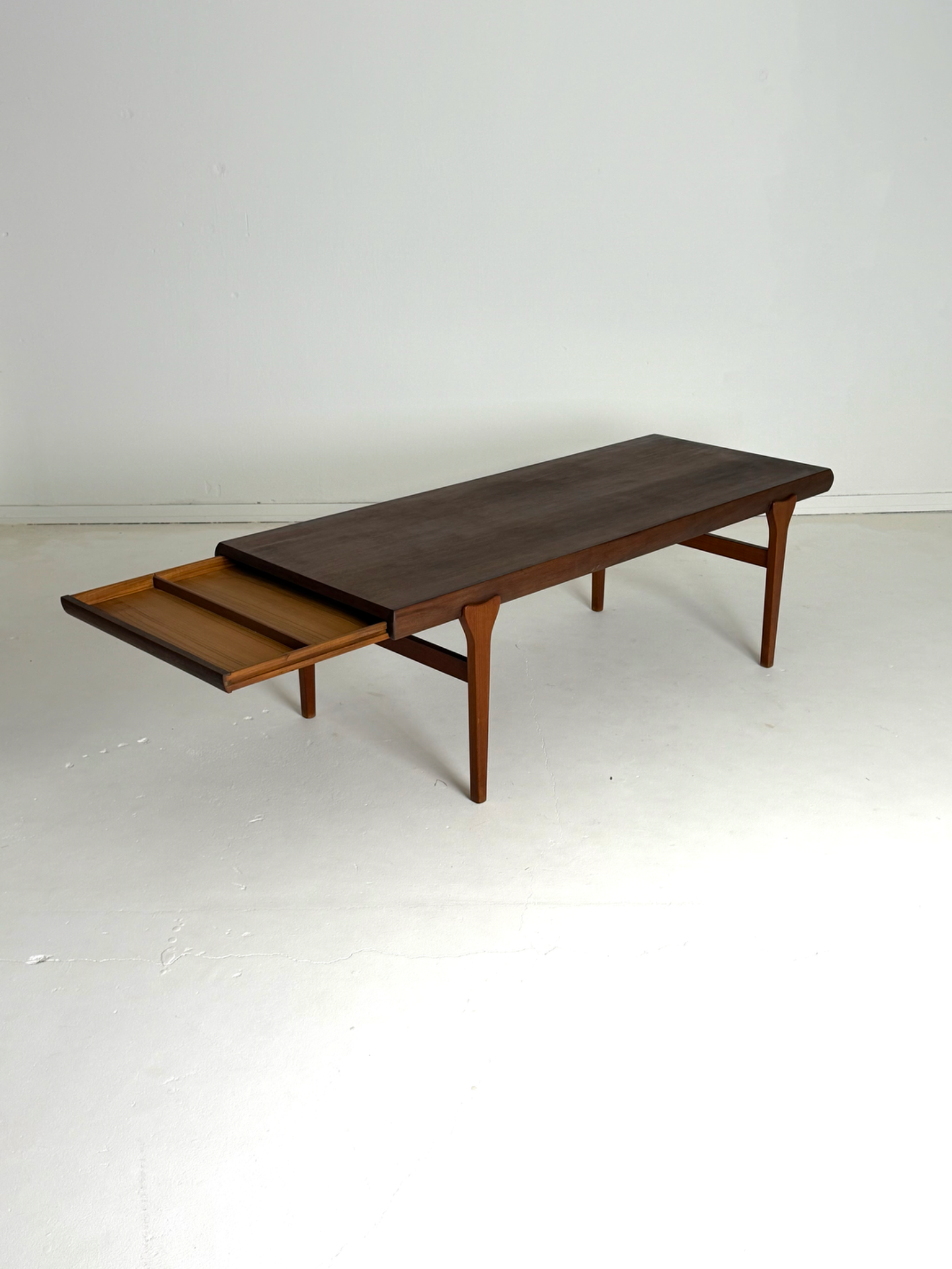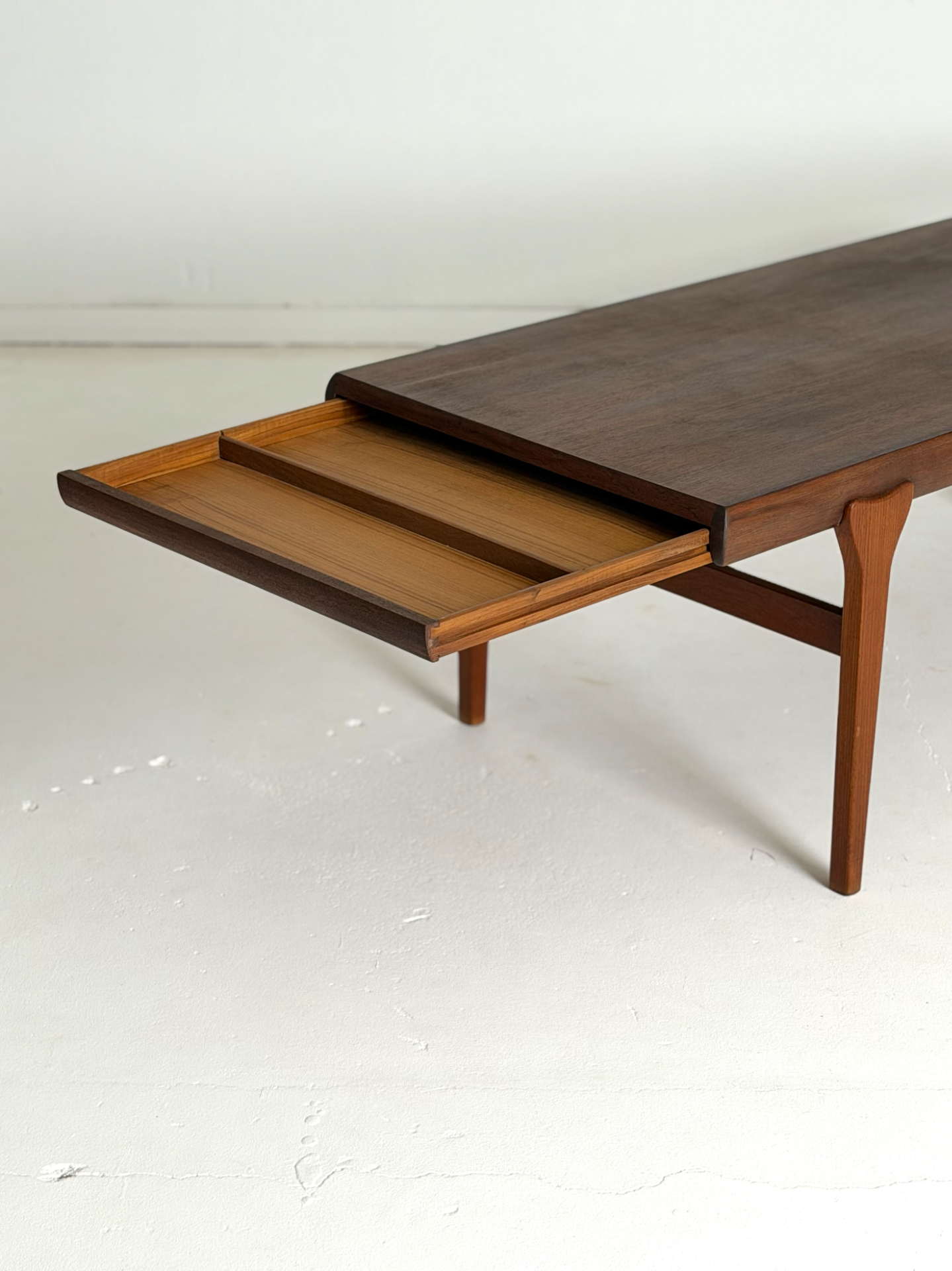 Upea tanskalainen vintage-sohvapöytä 1960-luvulta, suunnittelijana Johannes Andersen. Valmistajana toimi laadustaan tunnettu Uldum Møbelfabrik. Tiikkiviiluinen pöytätaso ja kauniisti muotoillut jalat henkivät skandinaavista tyylikkyyttä. Toisessa päässä ulosvedettävä laatikko ja toisessa päässä tarjoilutaso tuovat käytännöllisyyttä ja toiminnallisuutta. Elegantti valinta niin olohuoneeseen kuin lounge-tilaan.