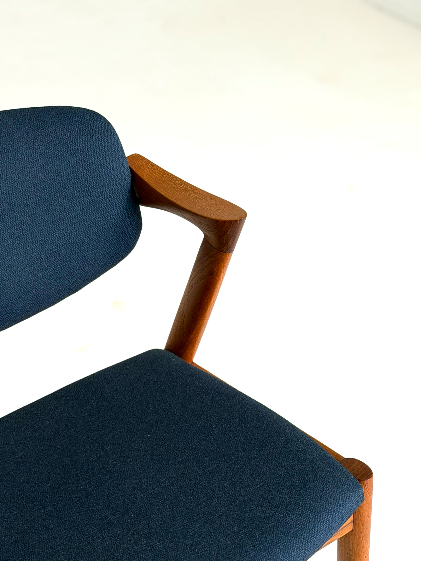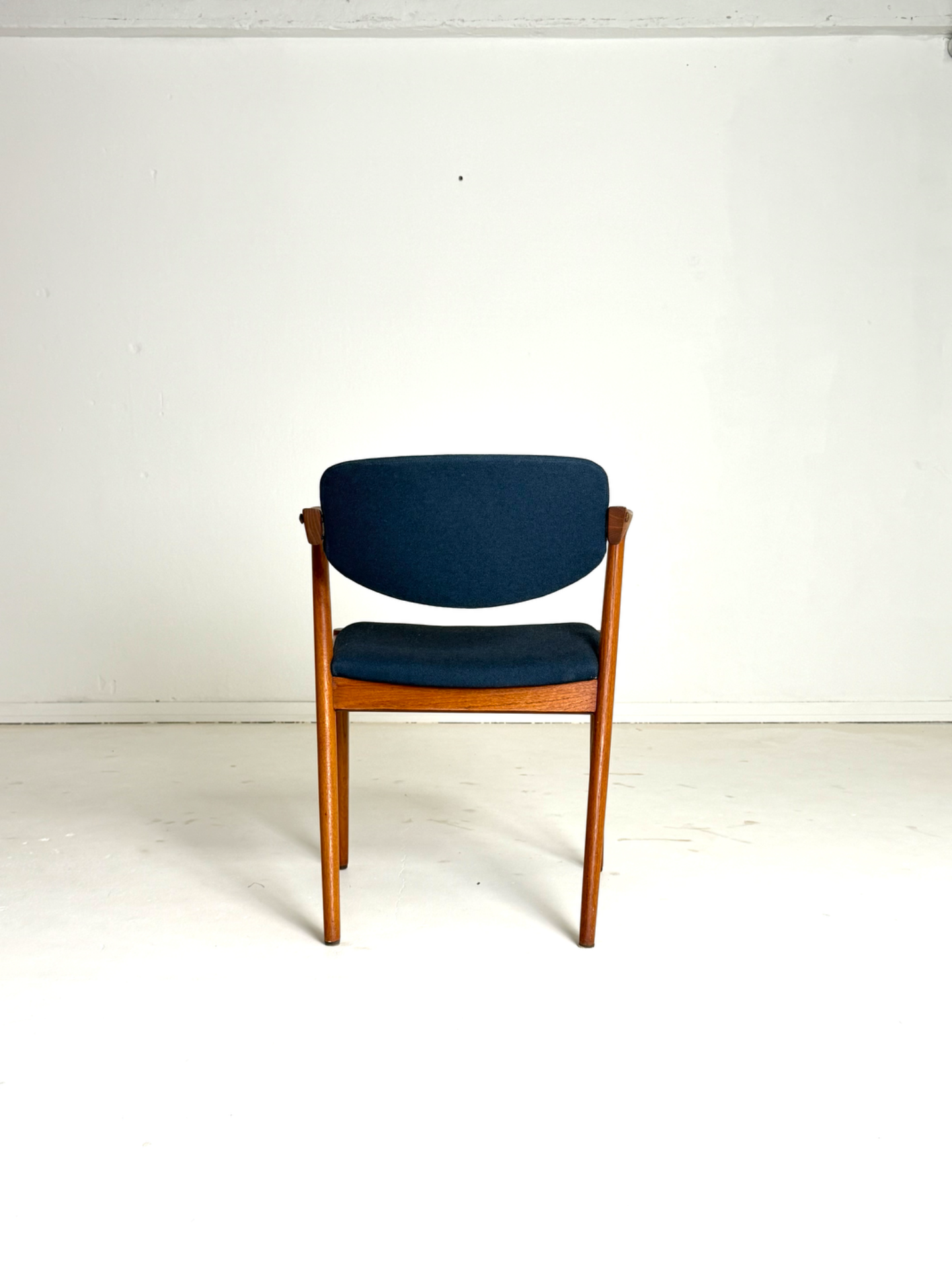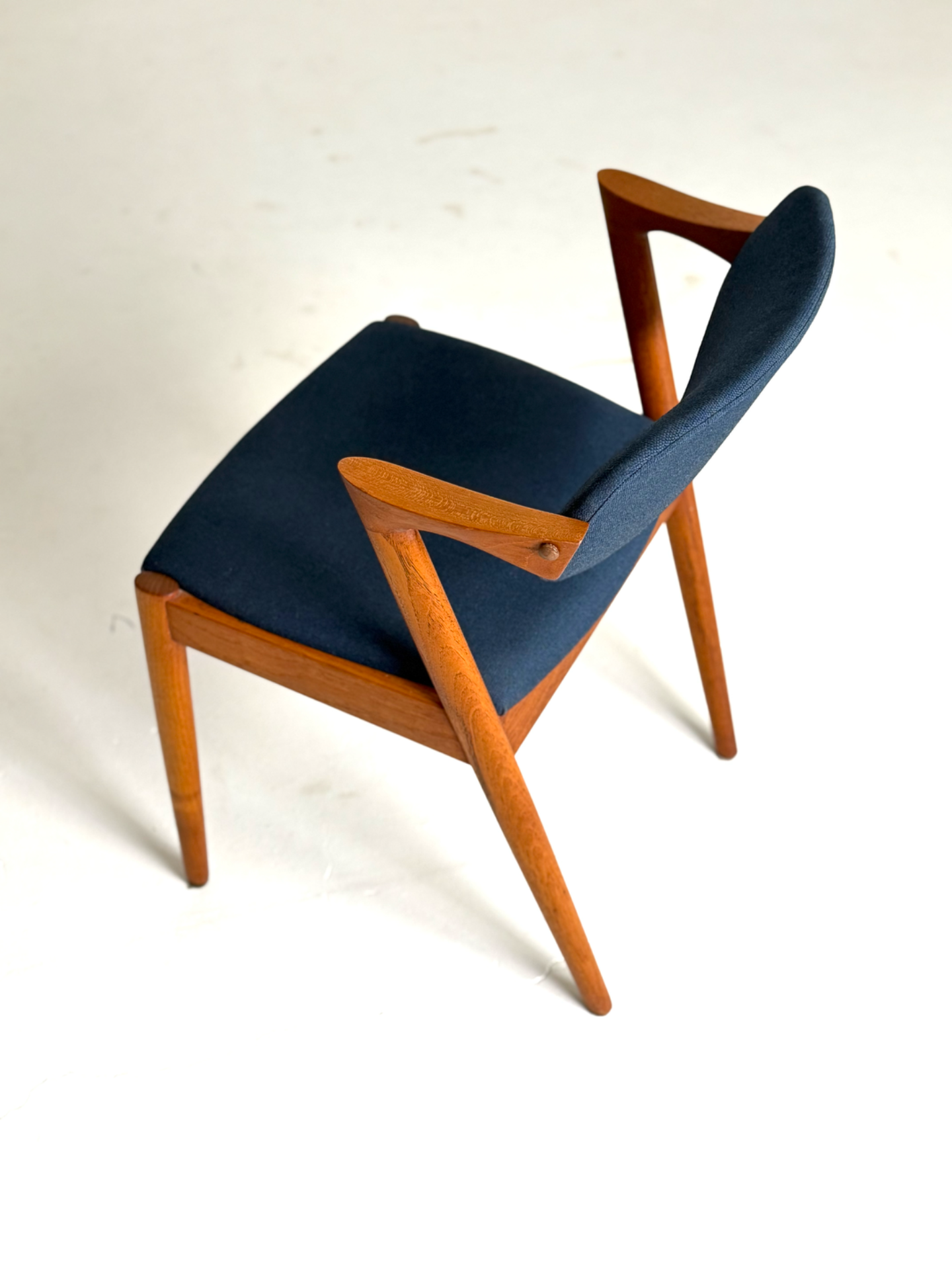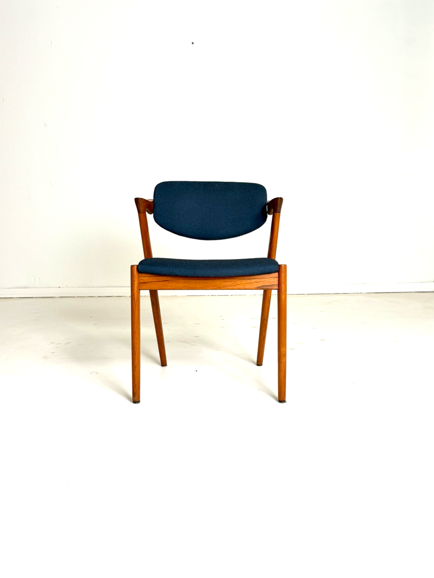 Ikoninen tanskalainen tuoli, joka tunnetaan myös nimellä "Z-tuoli". Kai Kristiansenin suunnittelema ja Schou Andersenin valmistama malli 42 hurmaa elegantilla ja dynaamisella muotokielellään. 1960-luvulla suunnitellussa tuolissa yhdistyvät hienostunut käsityö, linjakas runko ja siro, mutta tukeva rakenne. Taipuva selkänoja ja istuin on verhoiltu tummansinisellä villakankaalla. Ehdoton klassikko designin ystävälle.