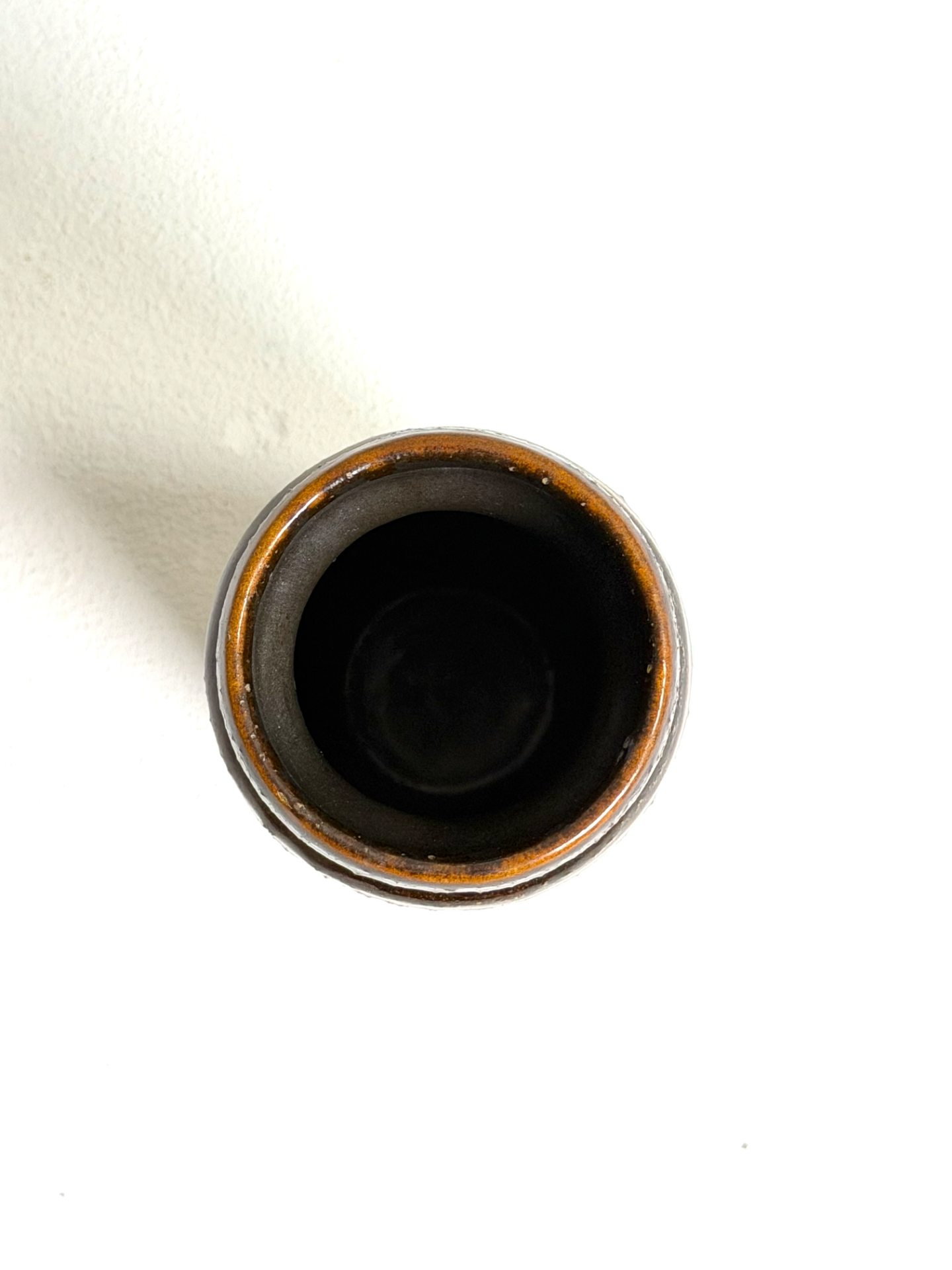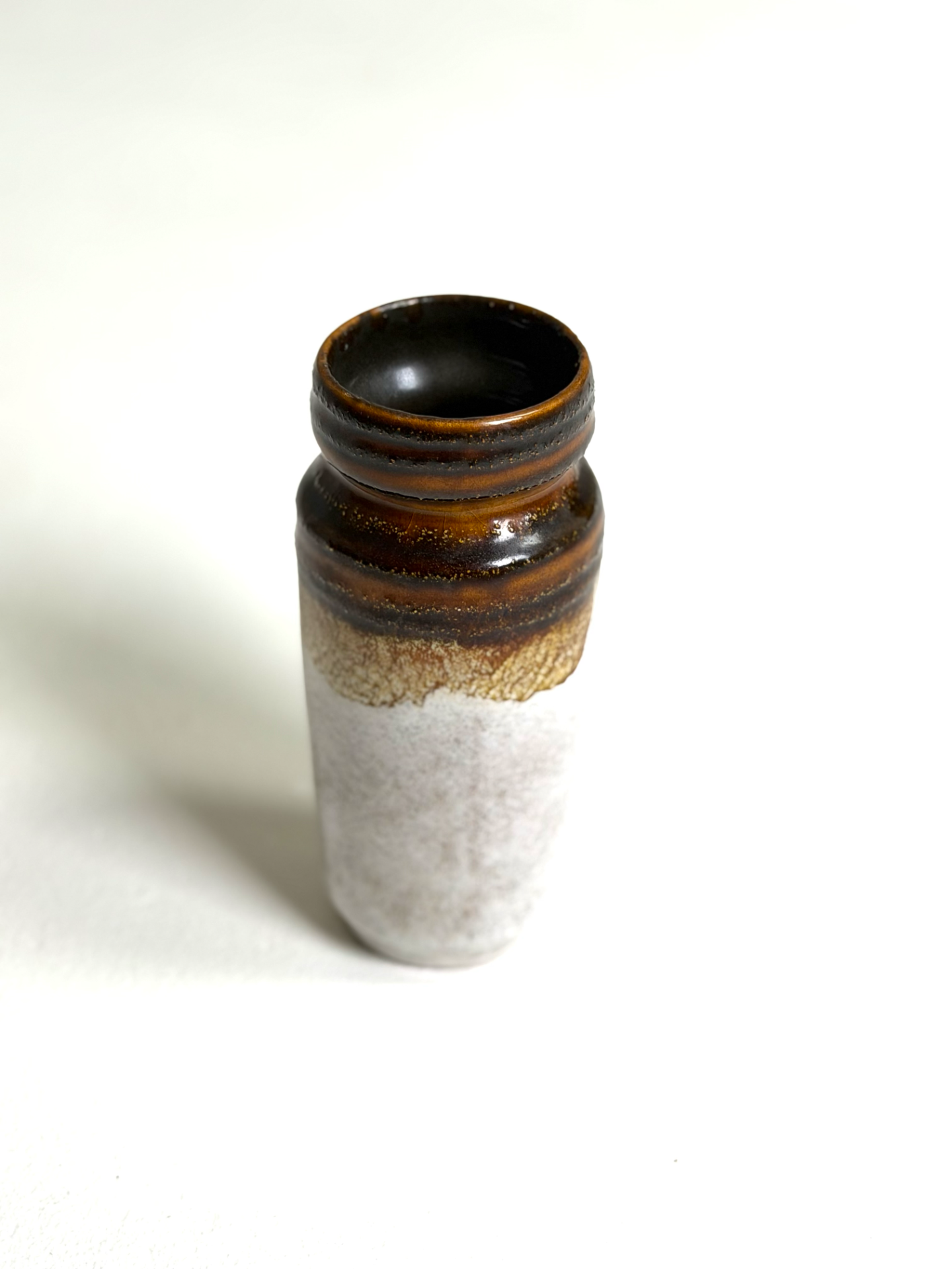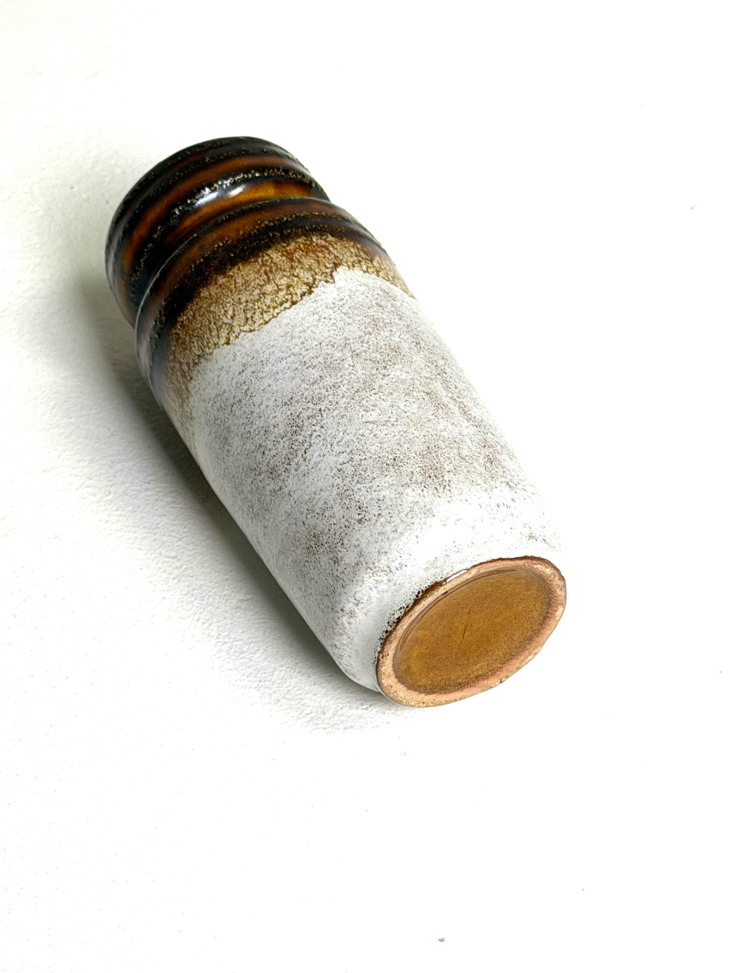 Näyttävä länsisaksalainen keraaminen maljakko 1960–70-luvulta. Upea lasite yhdistää syvän ruskeat ja vaaleat sävyt eläväpintaiseksi kokonaisuudeksi. Skulpturaalinen muoto ja rouhea tekstuuri tekevät maljakosta sekä keräily- että sisustusesineen.