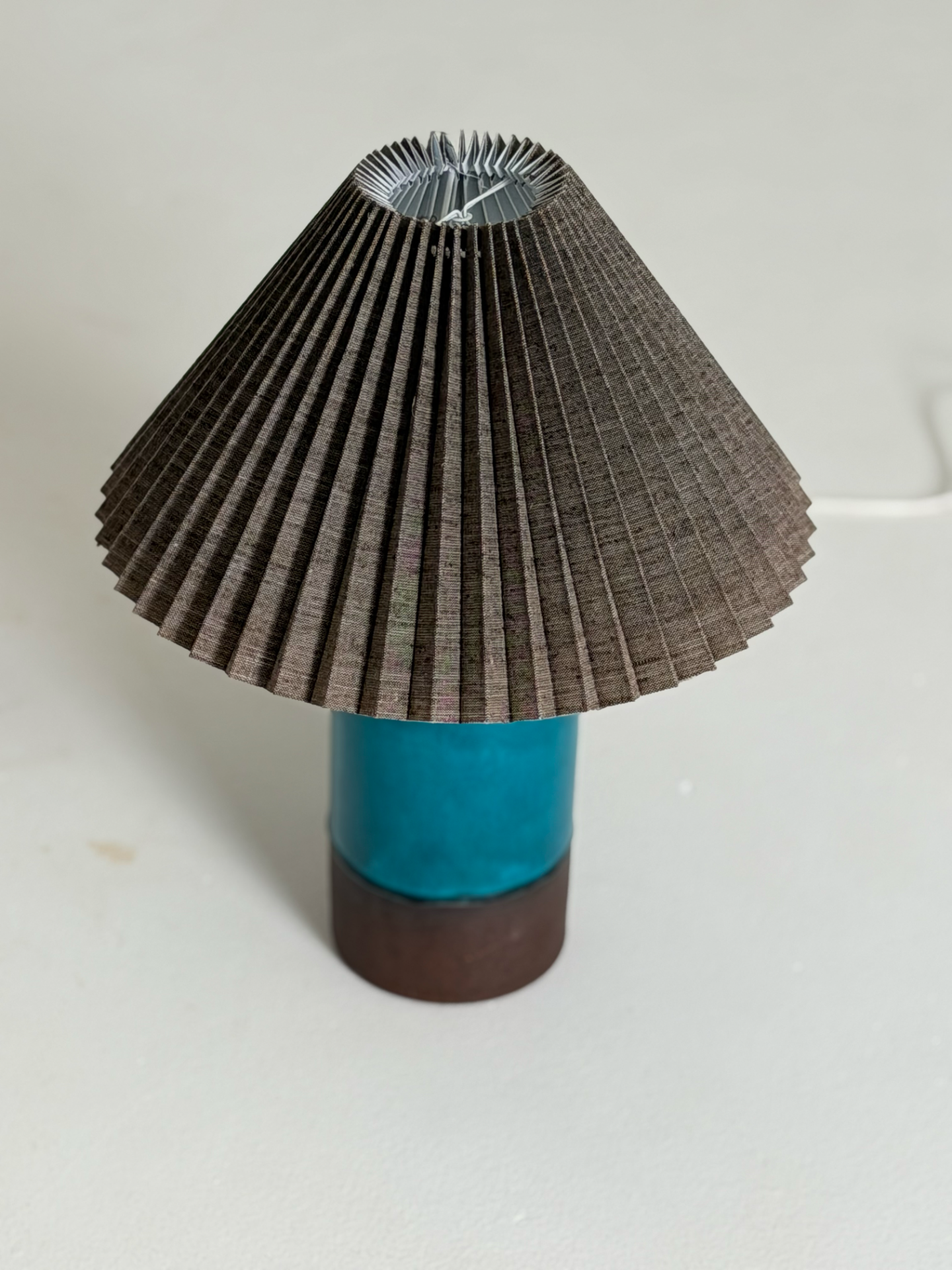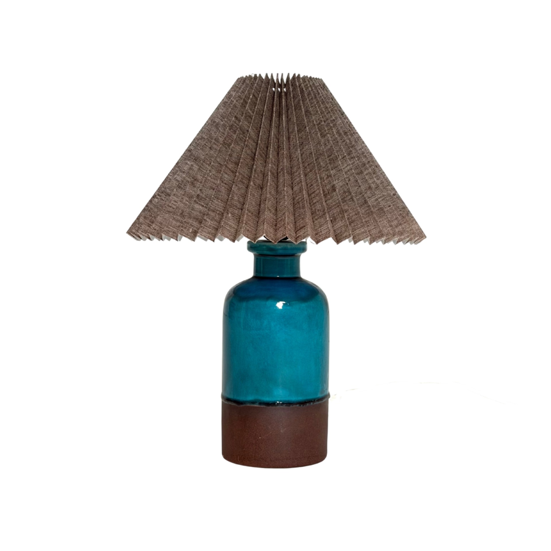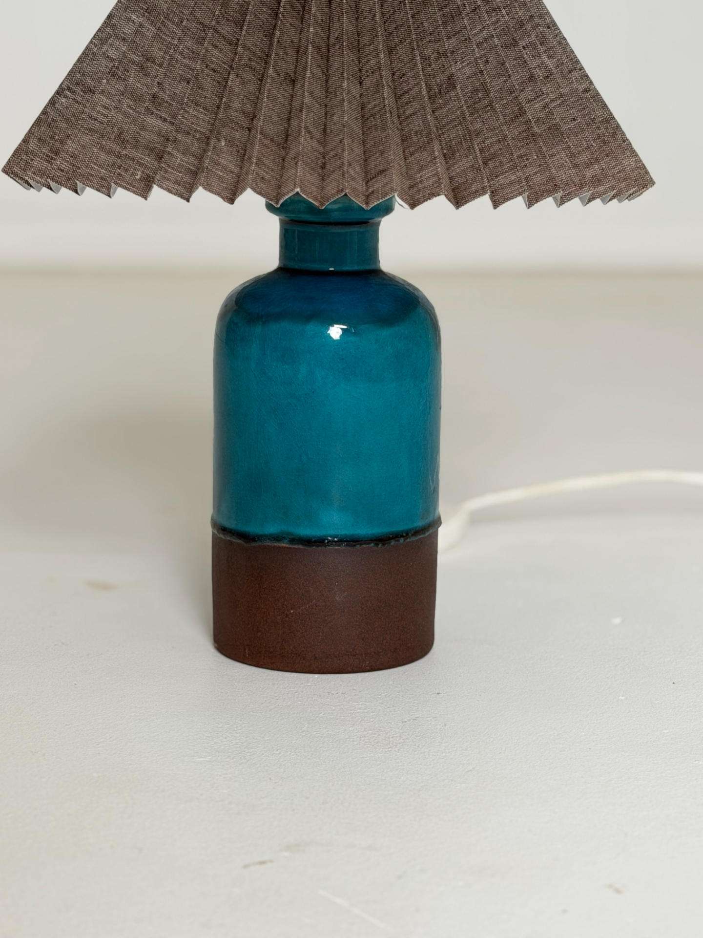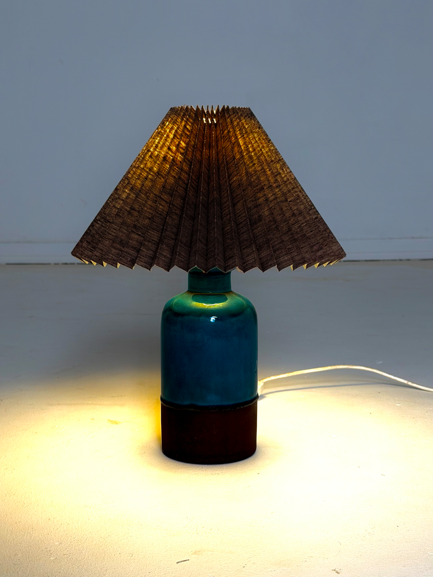 Muotoilu on selkeä mutta ilmeikäs, ja käsityön jälki näkyy hienovaraisina yksityiskohtina lasituksessa. Valaisinta täydentää laskostettu varjostin, joka pehmentää valoa ja tuo tilaan lämmintä, kodikasta tunnelmaa.
