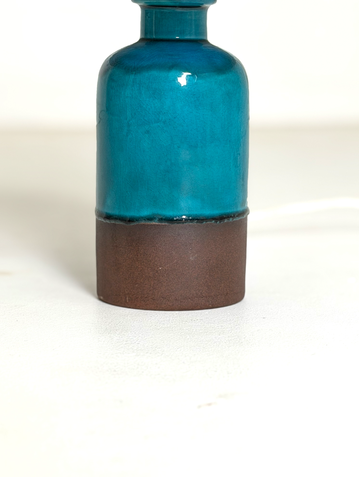 Tunnelmallinen ja persoonallinen keraaminen pöytävalaisin 1970-luvun Tanskasta. Valaisimen jalassa yhdistyvät kauniisti syvä turkoosi lasite ja maanläheinen ruskea alaosa, luoden elävän ja harmonisen kokonaisuuden.