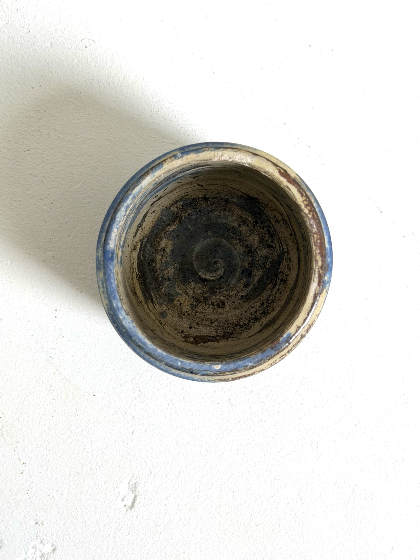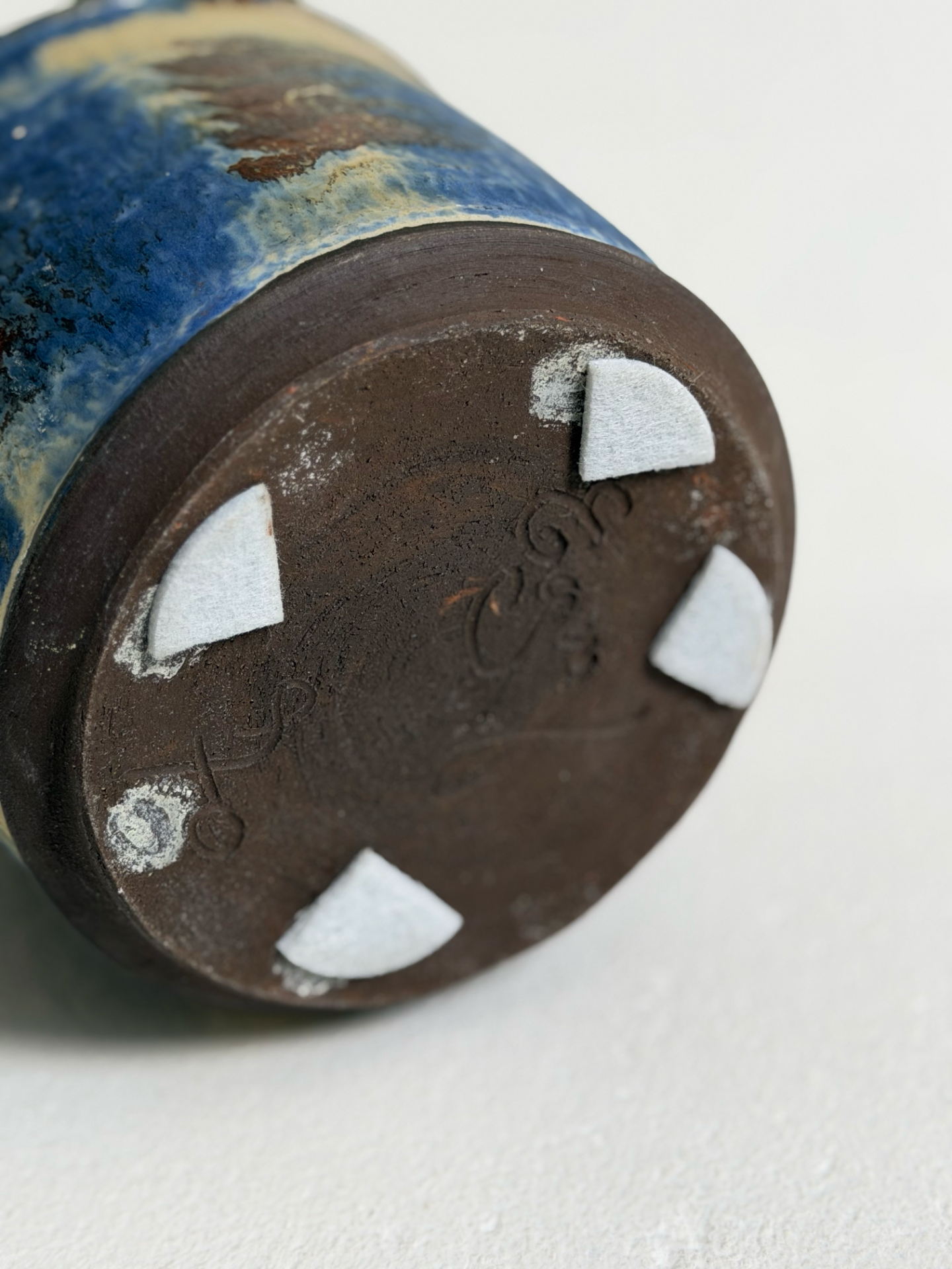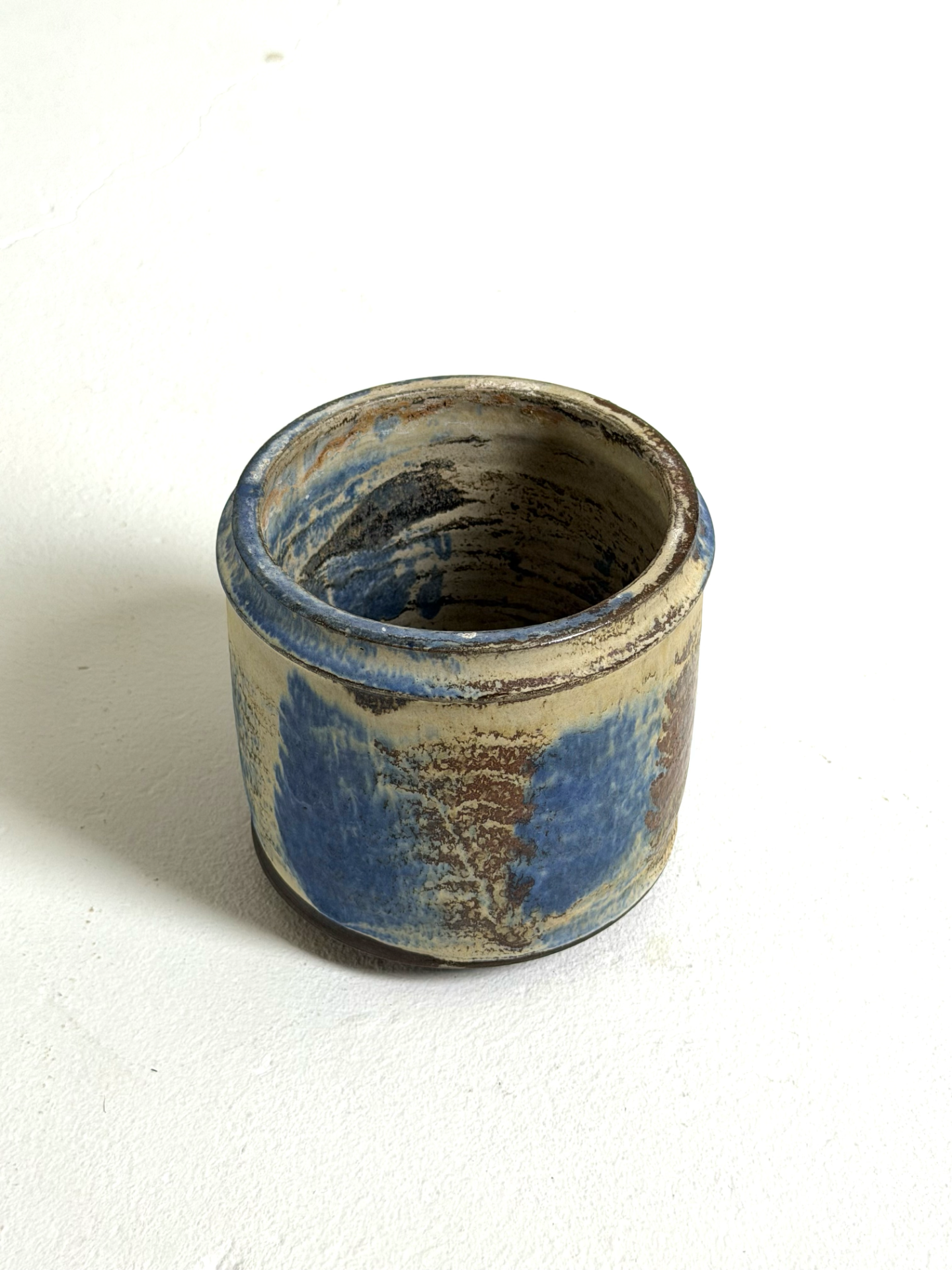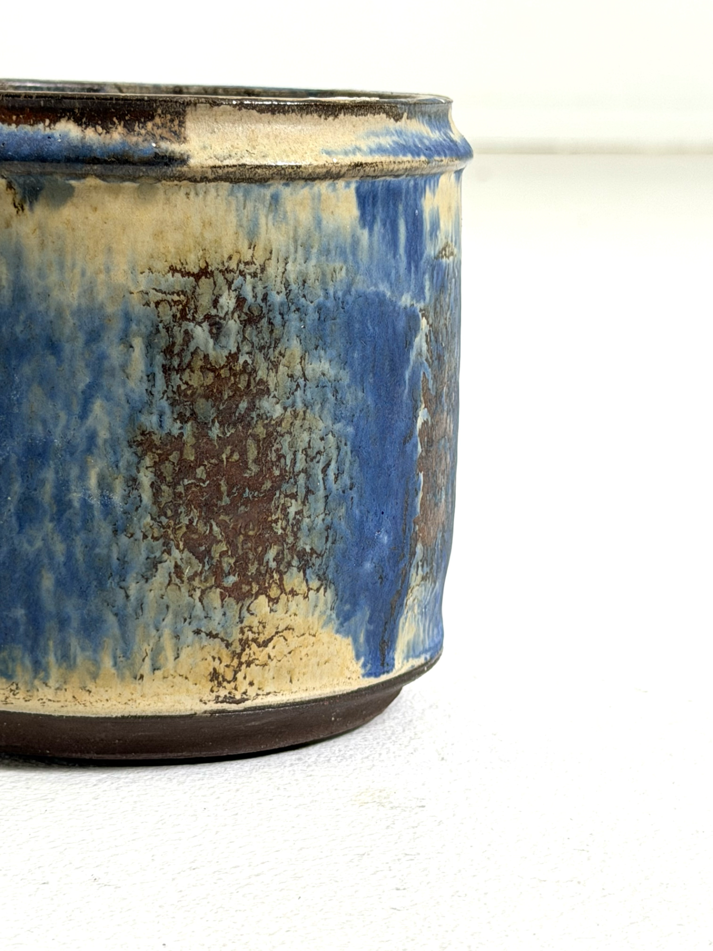 Ilmeikäs keraaminen maljakko tai ruukku 1970–80-luvulta, jossa yhdistyvät kauniisti maanläheiset sävyt ja elävä, käsityönomainen lasite. Sinisen, ruskean ja vaalean sävyjen orgaaninen pintakuvio tekee jokaisesta katselukulmasta kiinnostavan.