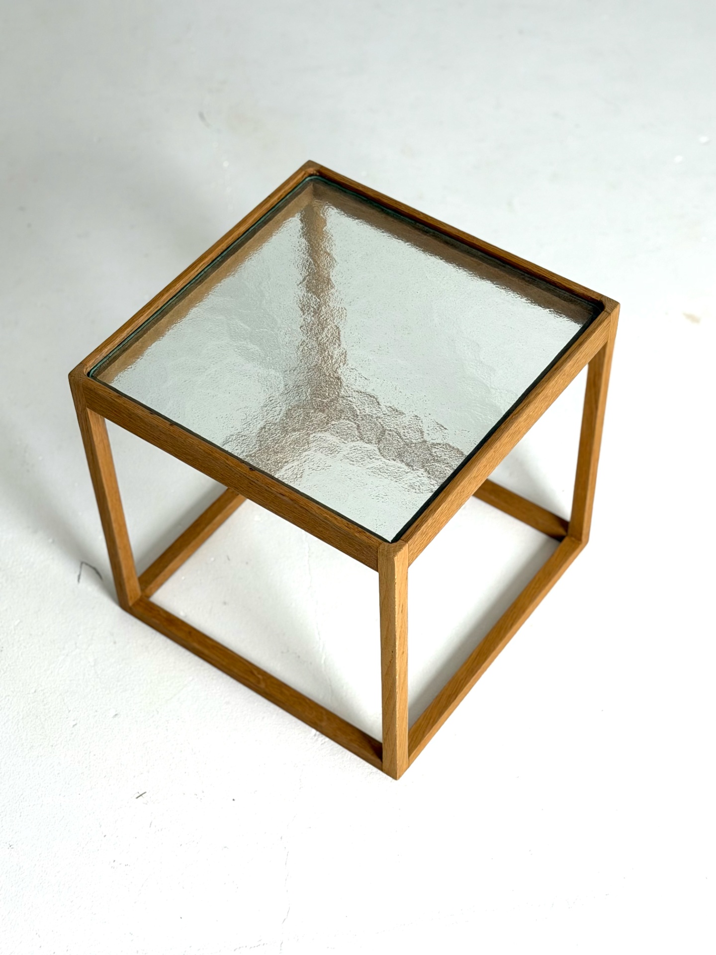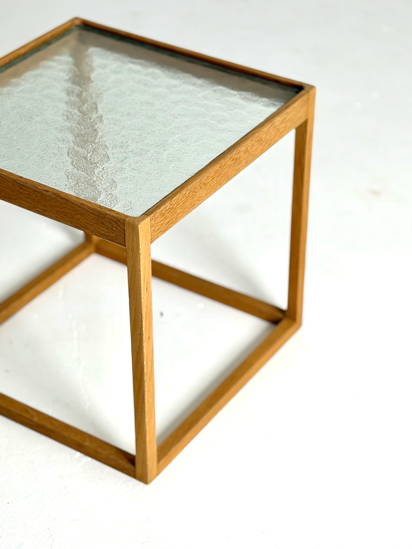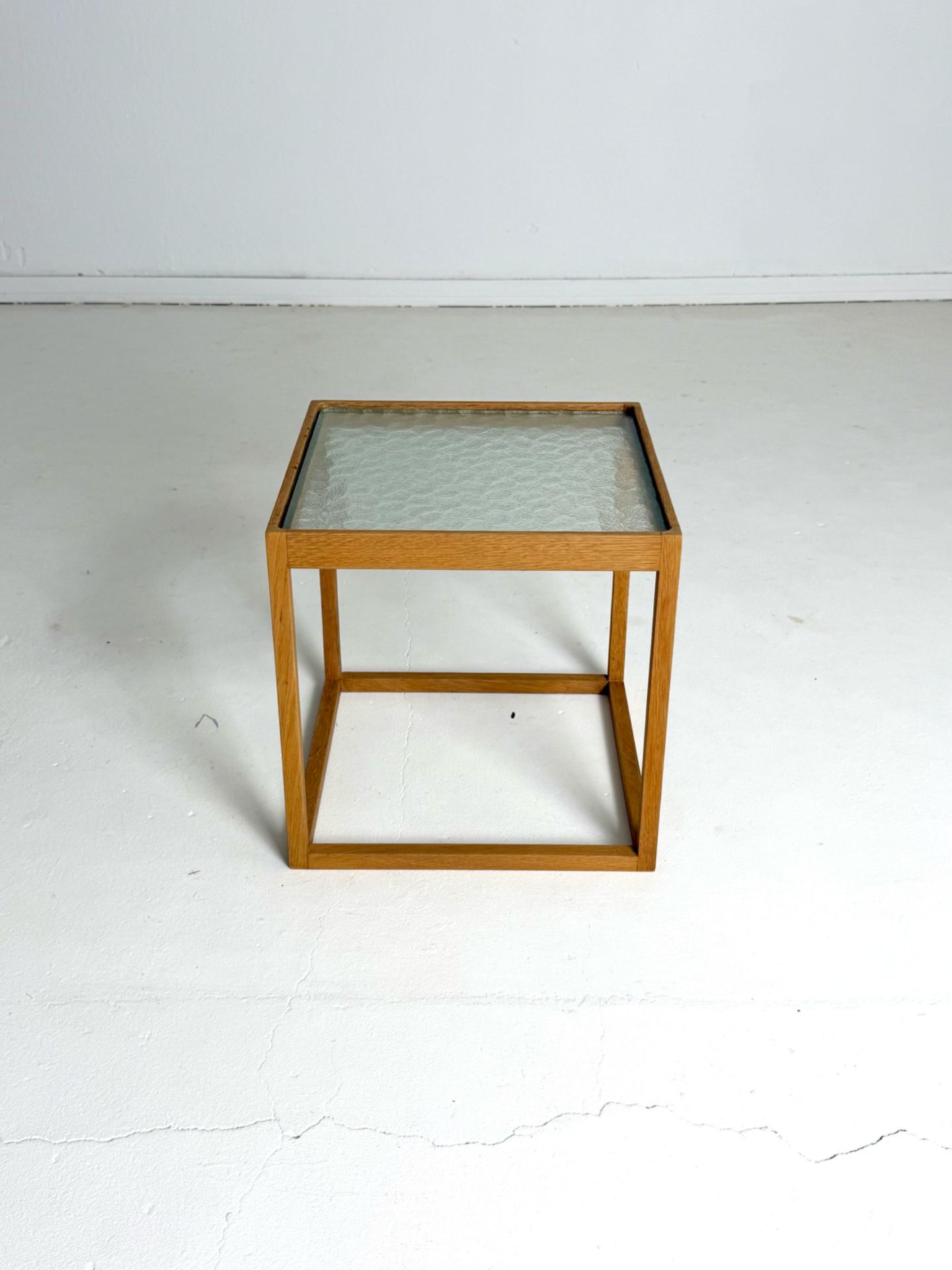 A rare and sculptural side table designed by Danish designer Kurt Østervig and manufactured by KP Møbler in the 1960s. The "Kube" features a striking oak cube frame and a beautiful, patterned original glass top. Lightweight yet sturdy, this piece works perfectly as a side table or a nightstand.