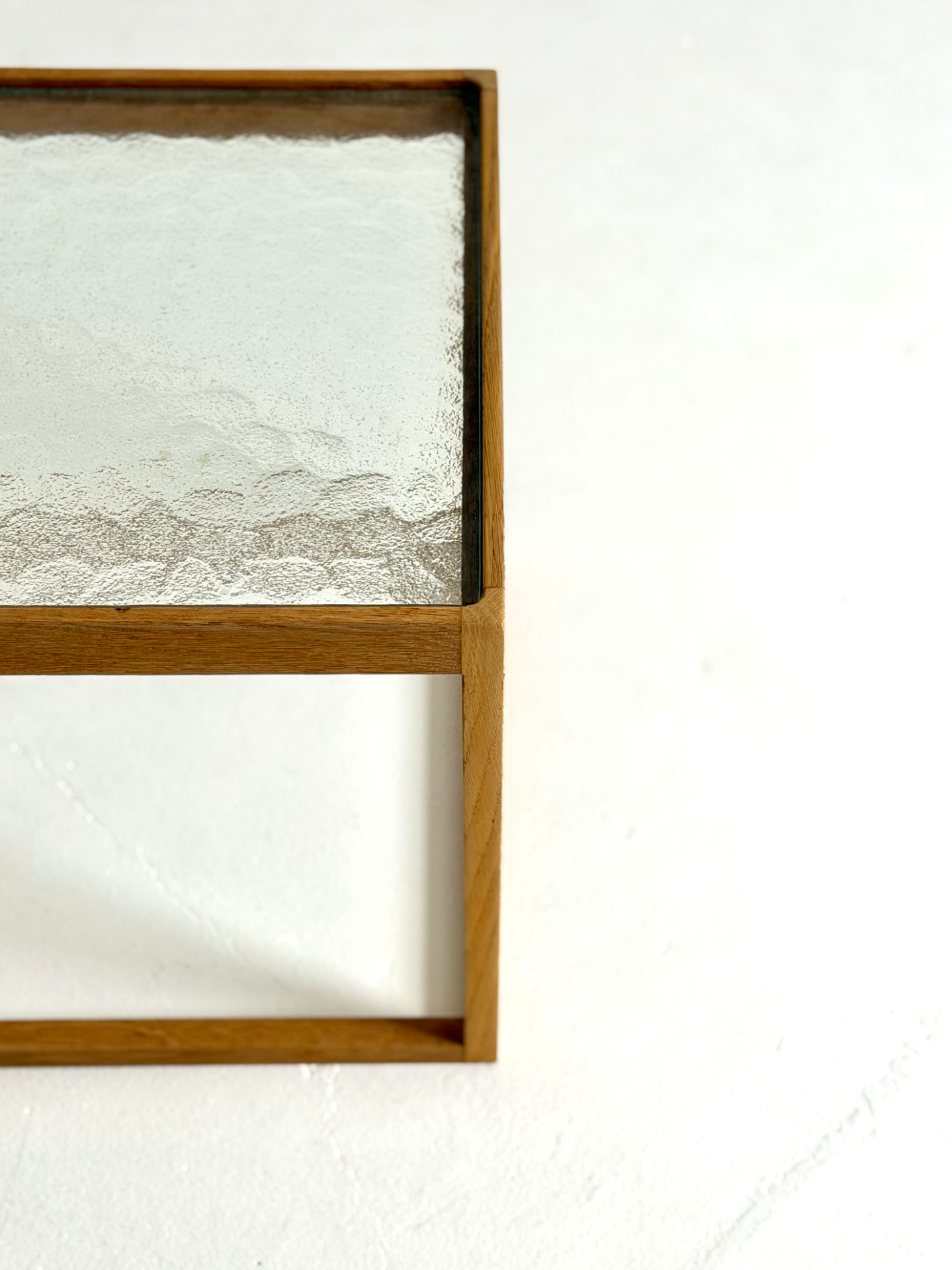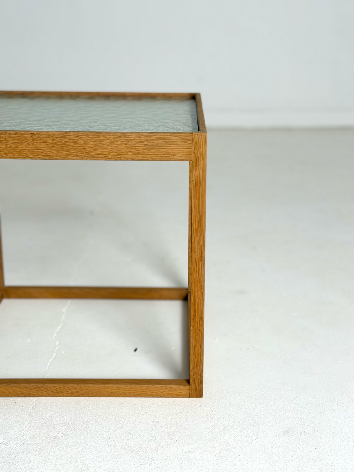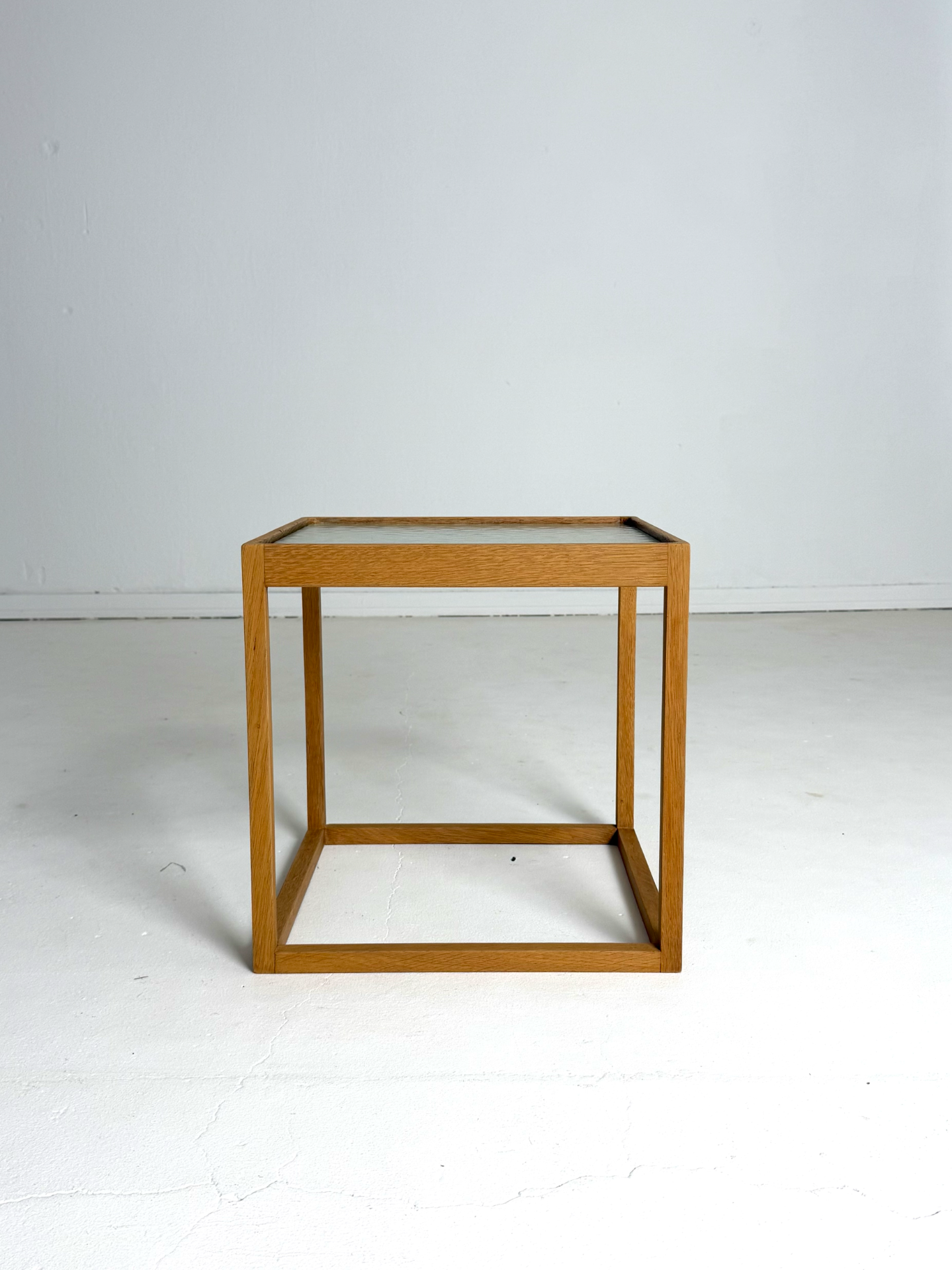 A rare and sculptural side table designed by Danish designer Kurt Østervig and manufactured by KP Møbler in the 1960s. The "Kube" features a striking oak cube frame and a beautiful, patterned original glass top. Lightweight yet sturdy, this piece works perfectly as a side table or a nightstand.