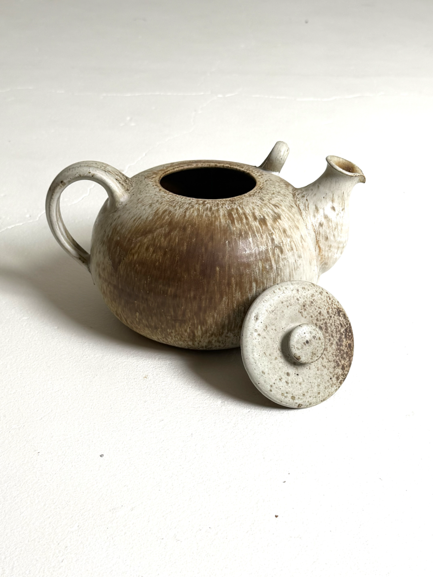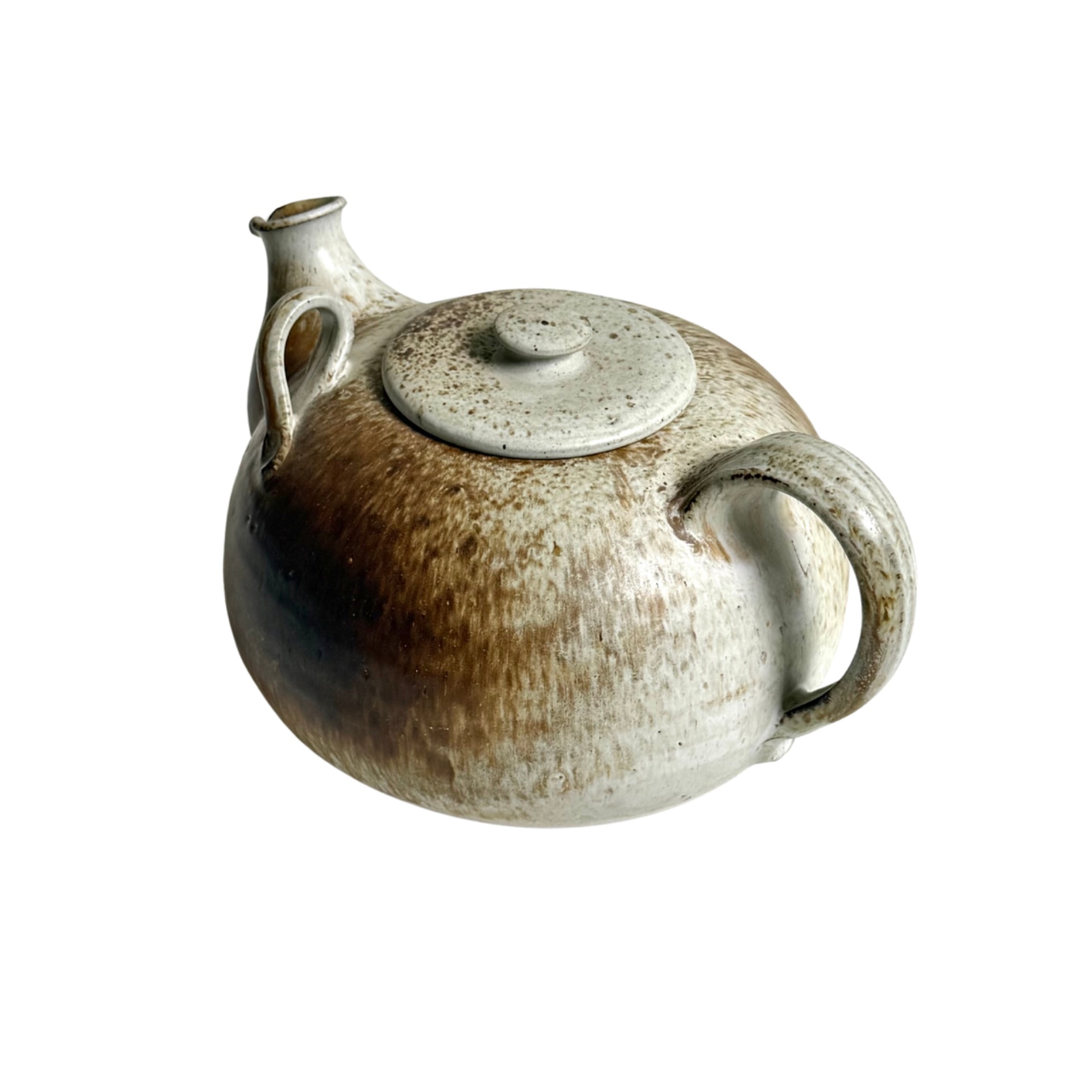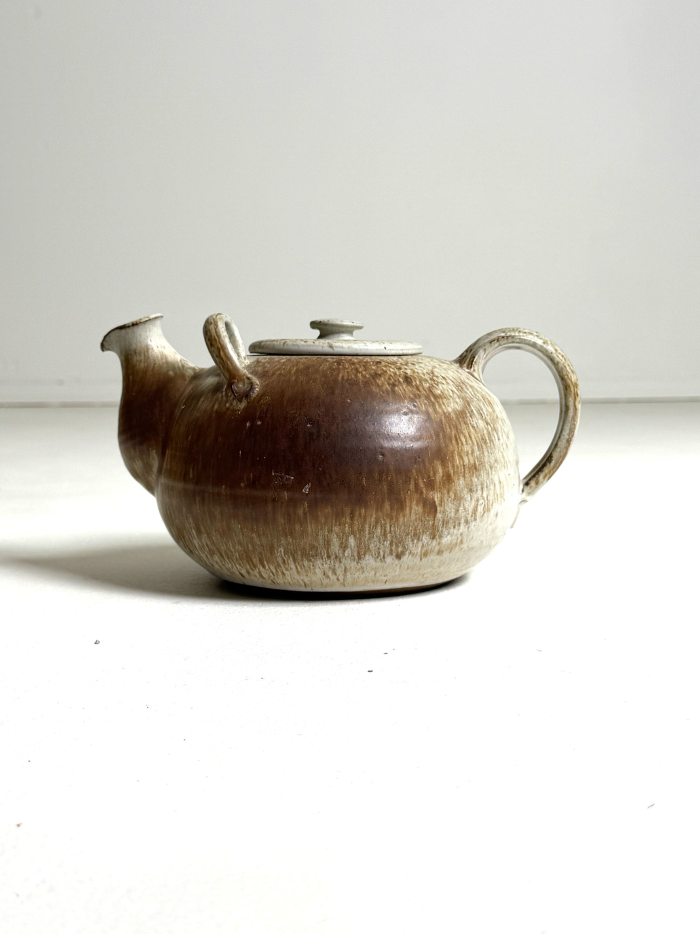 A stunning handcrafted ceramic teapot from Denmark, dating to the 1960s–70s. Featuring a soft rounded shape and a beautiful glaze in earthy tones of brown and beige. Its generous size makes it both functional and a striking piece for the table. A fine example of Scandinavian ceramic craftsmanship.