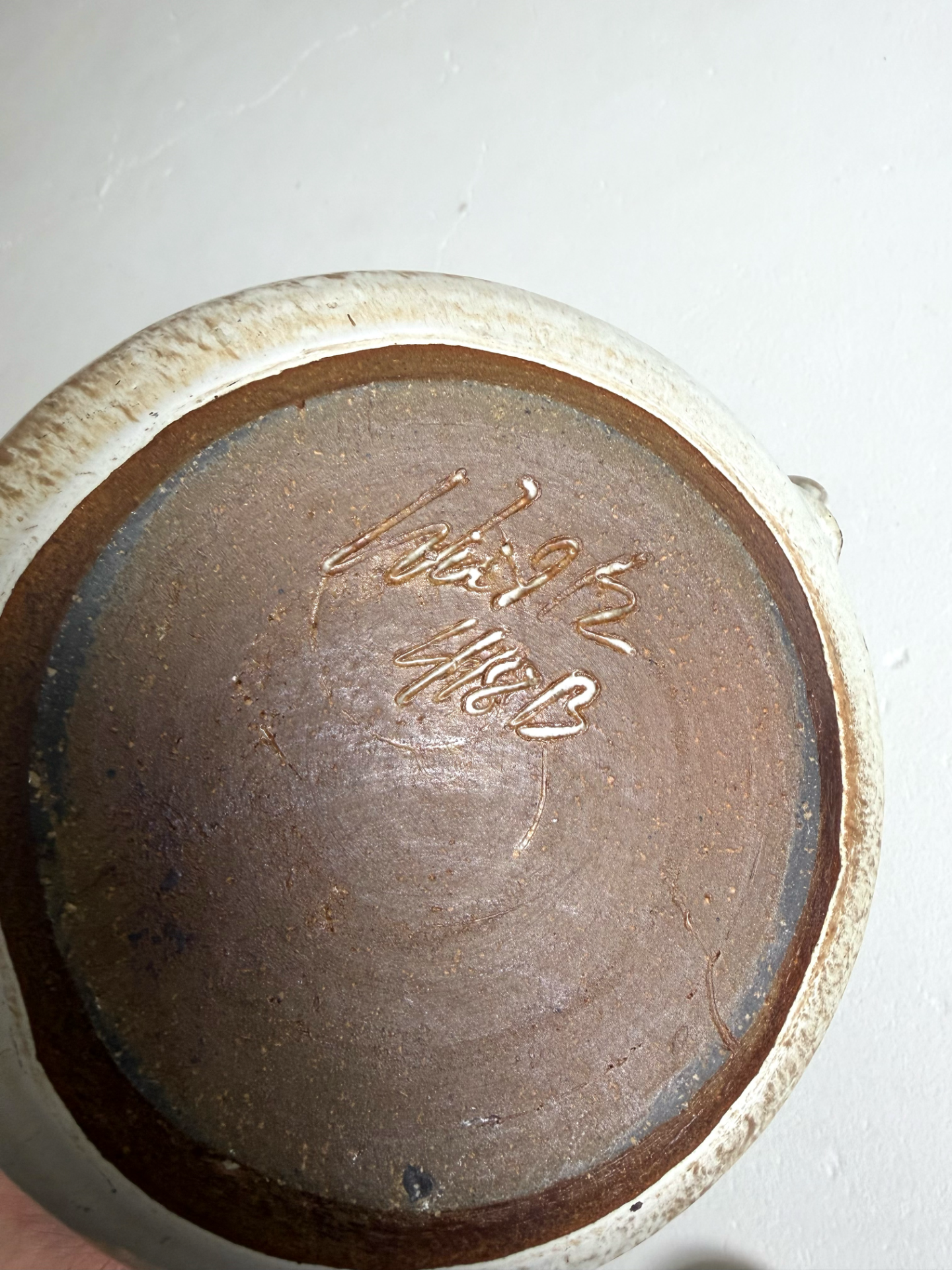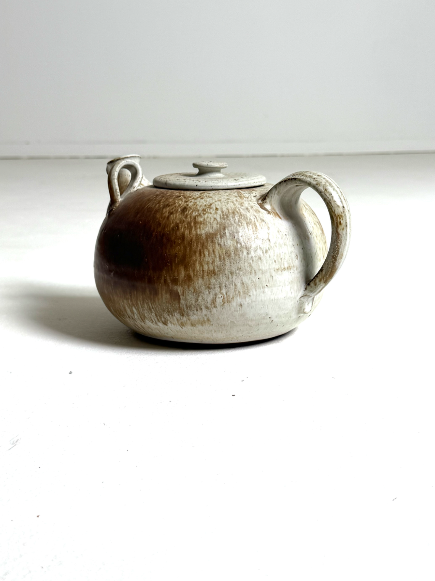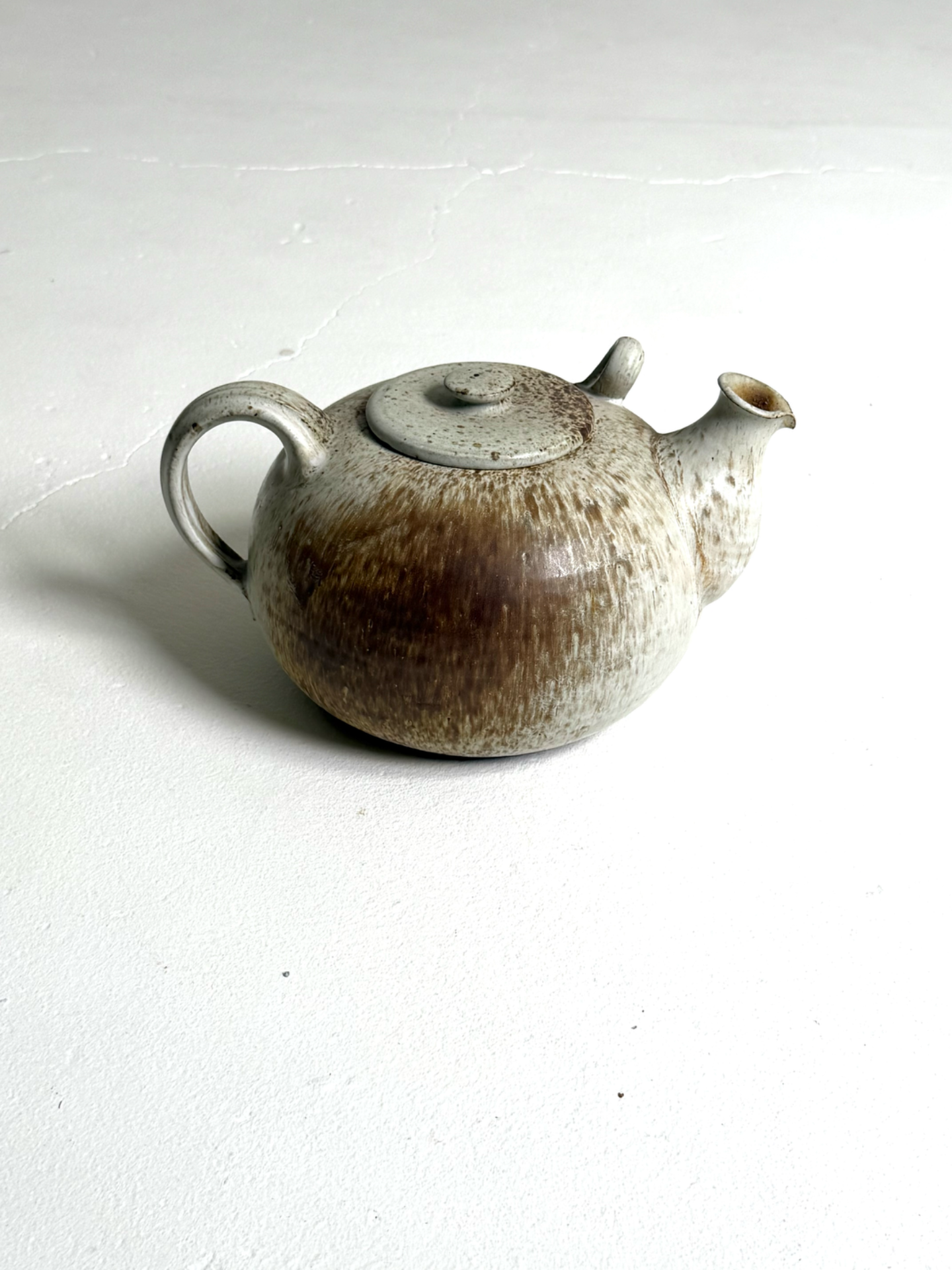 A stunning handcrafted ceramic teapot from Denmark, dating to the 1960s–70s. Featuring a soft rounded shape and a beautiful glaze in earthy tones of brown and beige. Its generous size makes it both functional and a striking piece for the table. A fine example of Scandinavian ceramic craftsmanship.