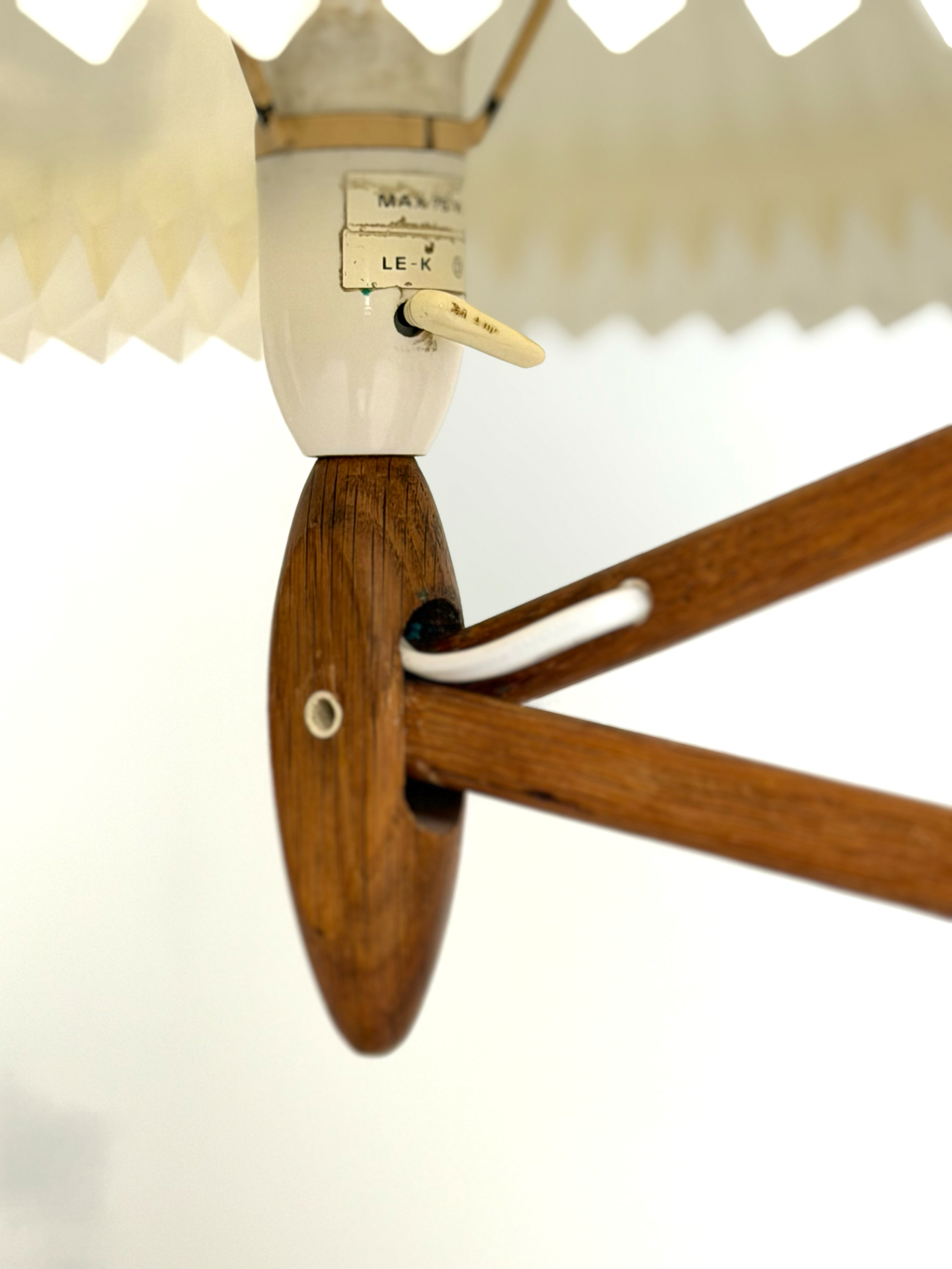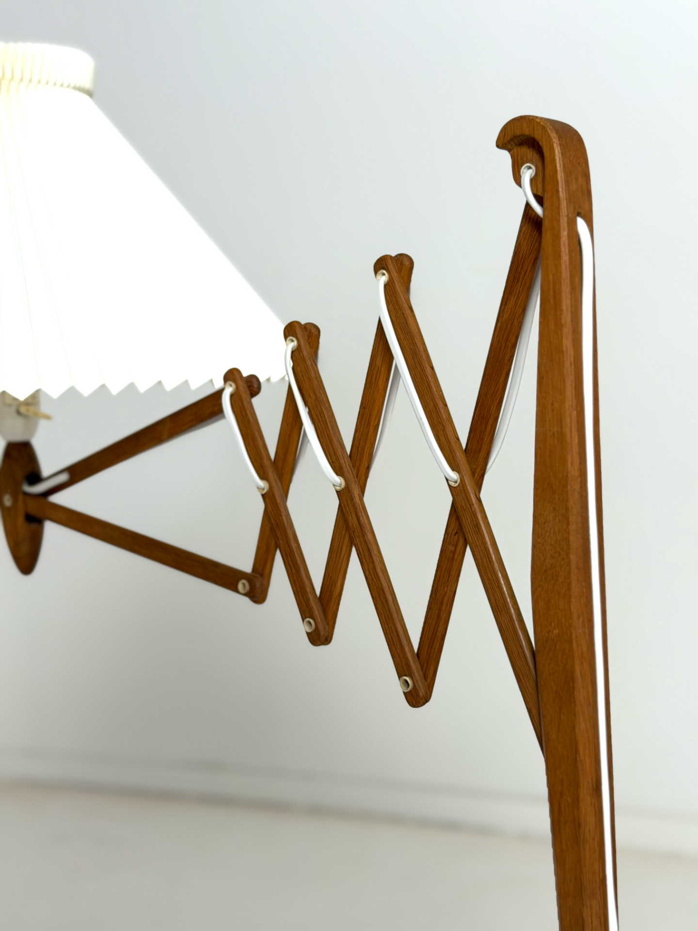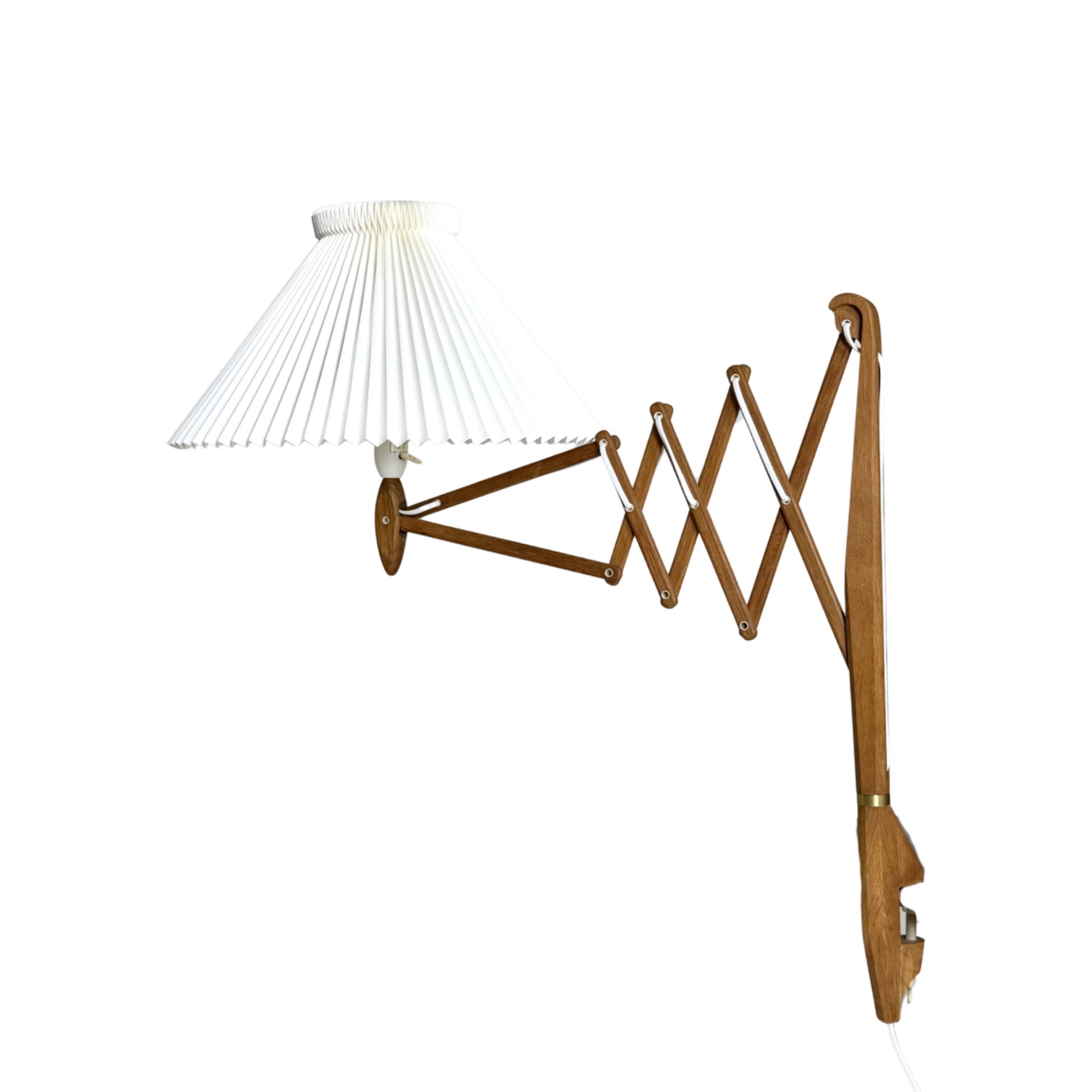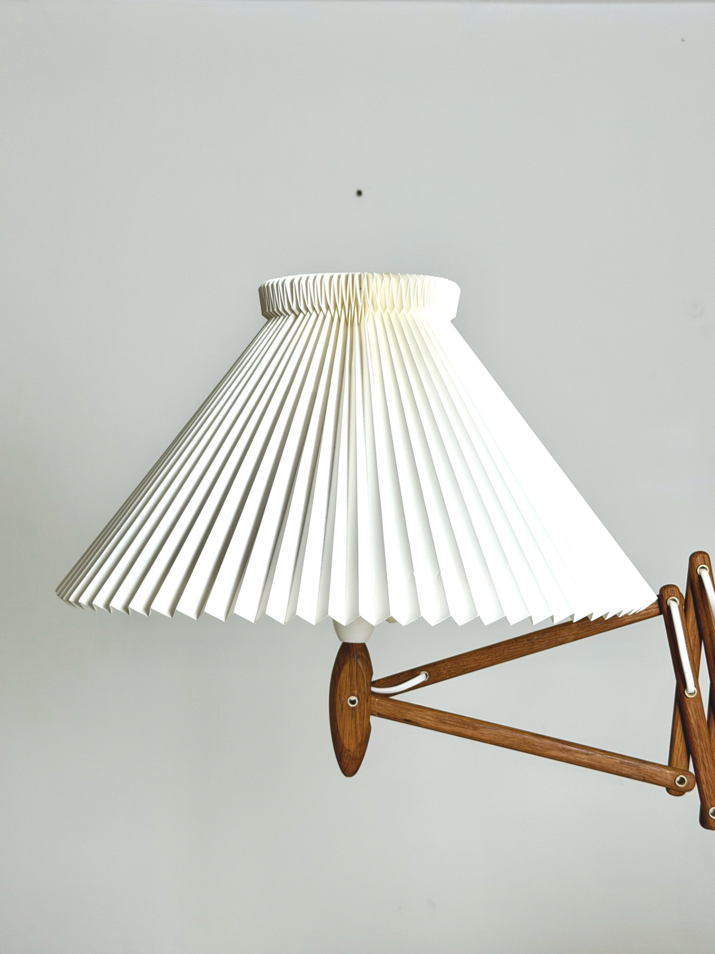 Valaisimen ikoninen, säädettävä haitarirakenne mahdollistaa valon suuntaamisen juuri haluttuun kohtaan. Yhdistelmä kauniisti patinoitunutta puuta ja klassista Le Klint -laskostettua varjostinta edustaa tanskalaisen muotoilun parhaimmistoa.