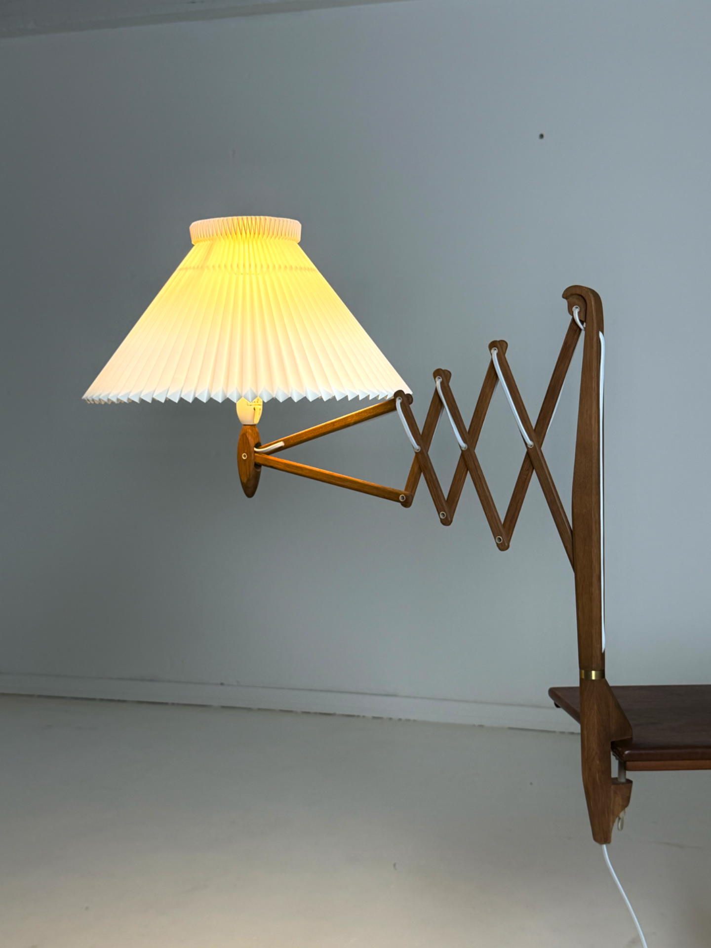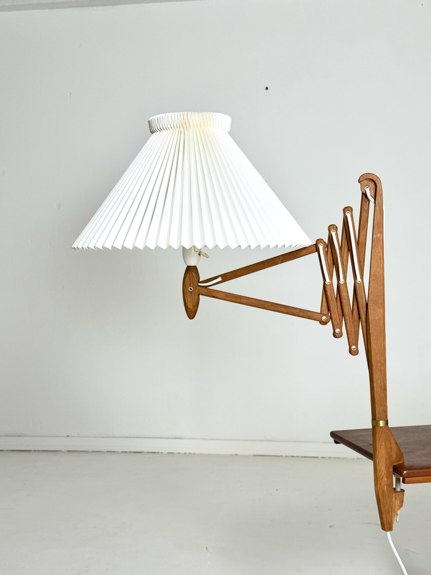 Erittäin harvinainen tanskalainen Le Klint -valaisin 1960-luvulta. Tämä ns. saxelampe eli haitarivalaisin on suunniteltu kiinnitettäväksi pöydän reunaan, tarjoten käytännöllisen ja näyttävän valaistusratkaisun.