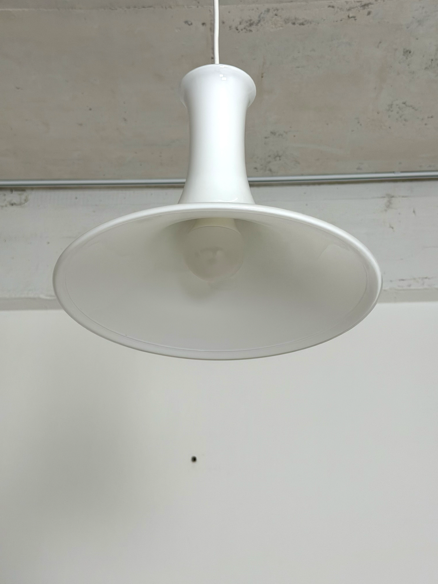 A timeless classic of Danish design – the Mandarin pendant lamp designed by Michael Bang in 1983 for Holmegaard. Made of mouth-blown opal glass, this lamp casts a soft, pleasant light that diffuses evenly across the space. The elegant, sculptural shape makes it a true statement piece, perfect above a dining table or as a focal point in the living room. A vintage gem from the golden era of Scandinavian lighting.