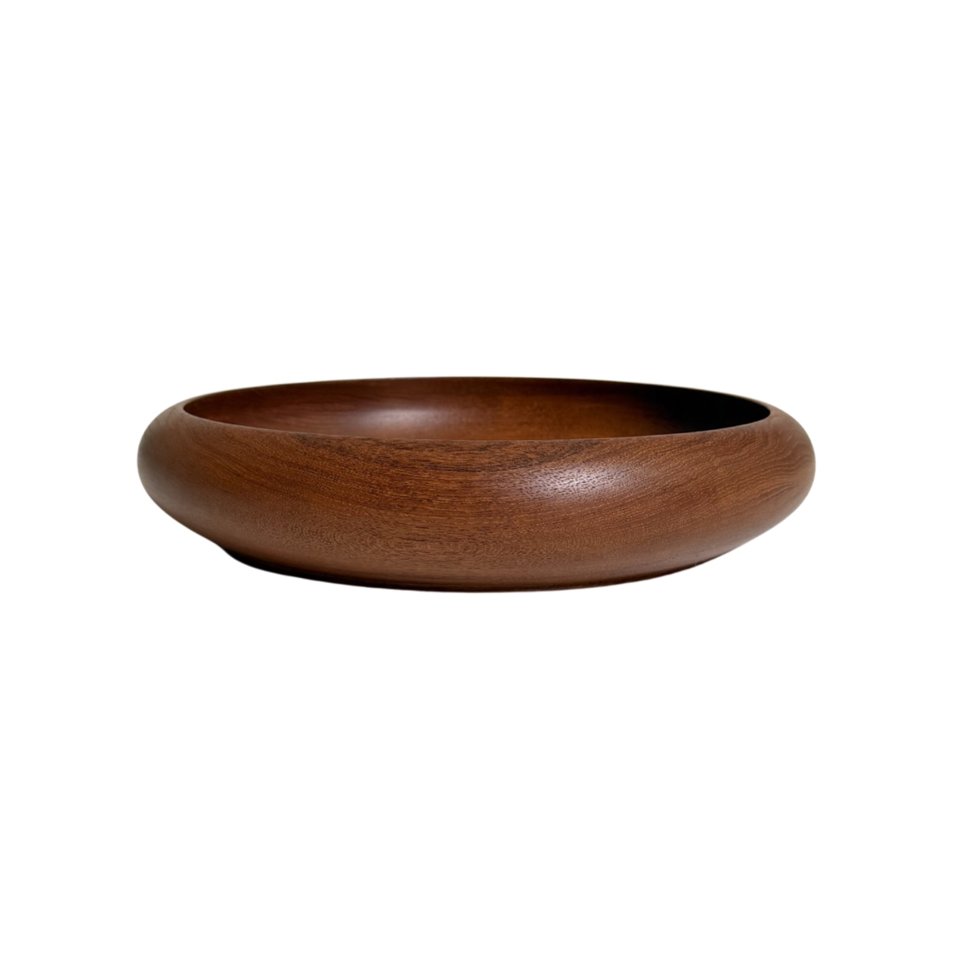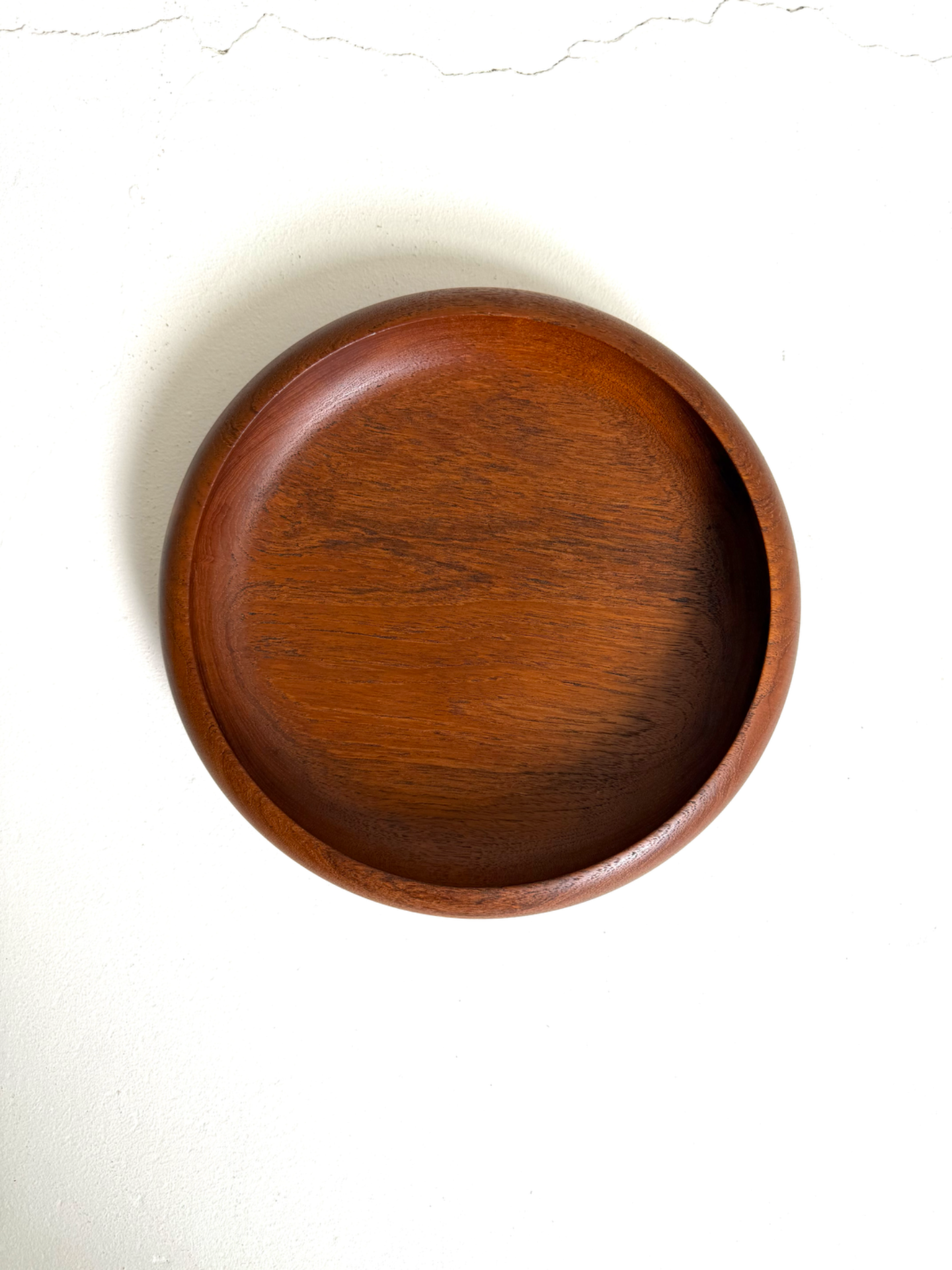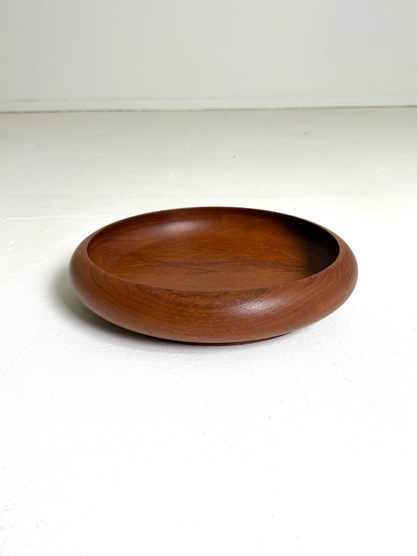 Erittäin kaunis ja veistoksellinen tanskalainen tiikkikulho 1960–70-luvulta. Kulhon siro, matala ja leveä muoto antaa sille elegantin ja lähes orgaanisen ilmeen, jossa puun luonnollinen syykuvio pääsee upeasti esiin.