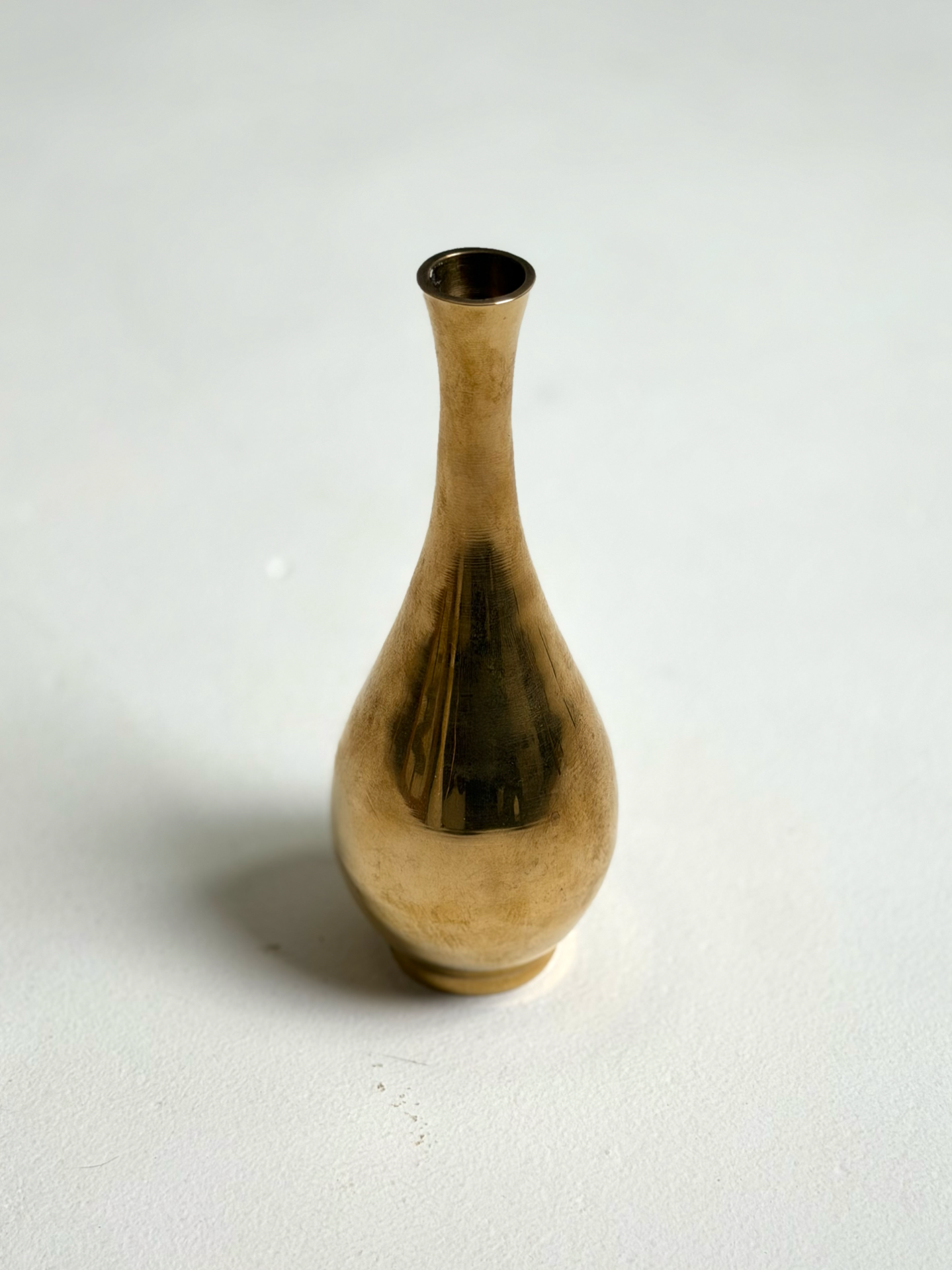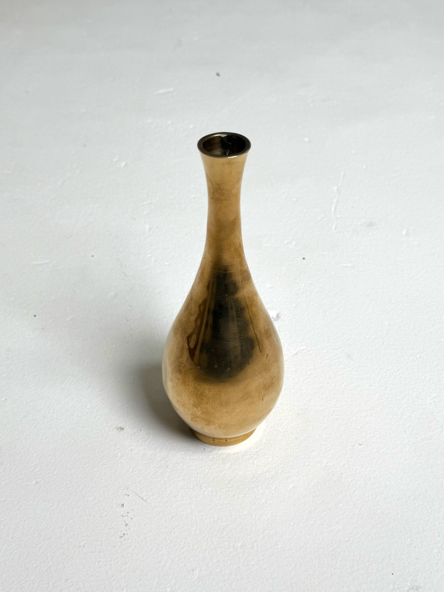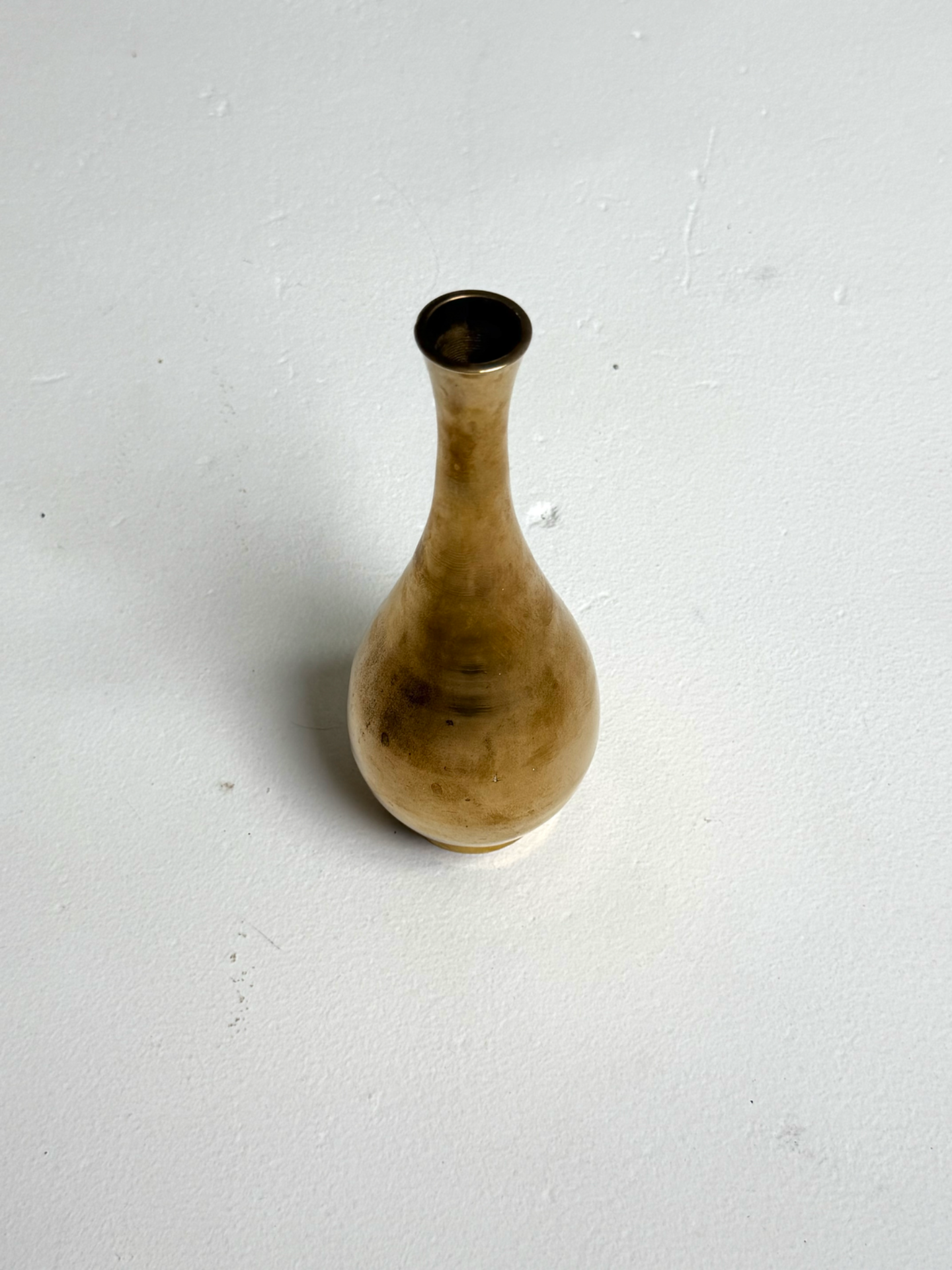 Kapea ja elegantti messinkinen maljakko 1960–70-luvulta. Pitkä kaula ja pyöristetty muoto tekevät tästä maljakosta hienostuneen sisustuselementin. Patinoitunut pinta kertoo ajan kulusta ja tuo esineelle lisää luonnetta. Sopii erinomaisesti esille sellaisenaan tai kuivakukkien kanssa.
