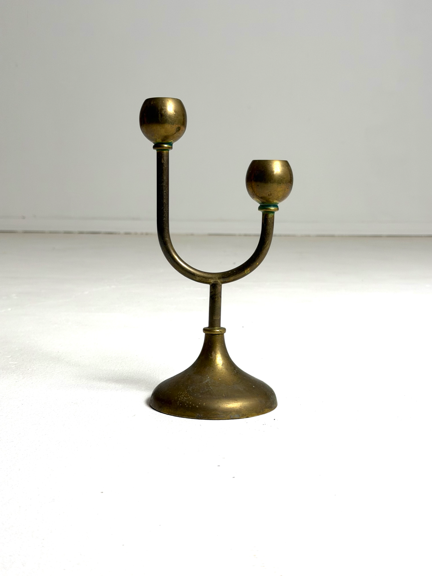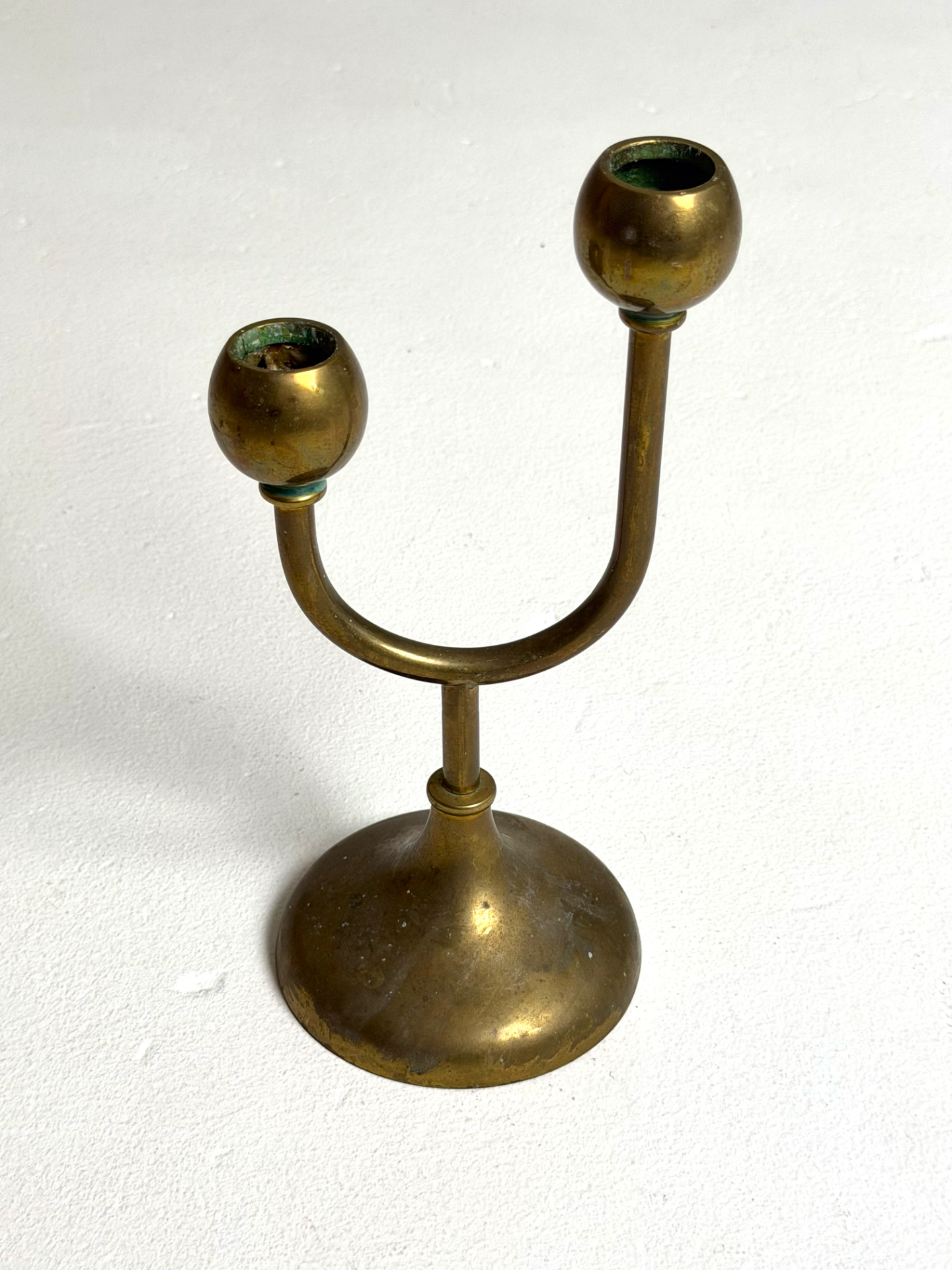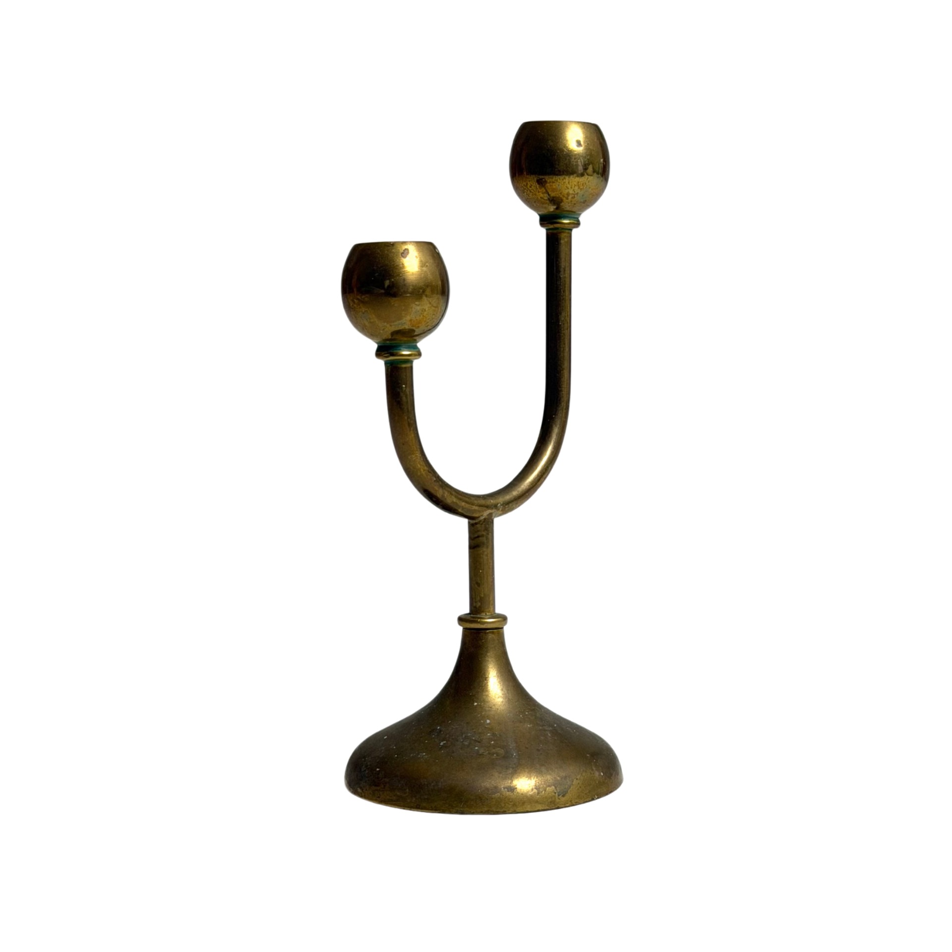 Tanskalainen kahden kynttilän messinkinen kynttelikkö 1960–70-luvulta. Skandinaavisen pelkistetty muoto yhdistyy pehmeisiin linjoihin ja ajattomaan eleganssiin. Patinoitunut pinta tuo esineeseen kaunista luonnetta ja historiaa. Tyylikäs yksityiskohta sisustukseen, erityisesti kattaukseen tai ikkunalaudalle.