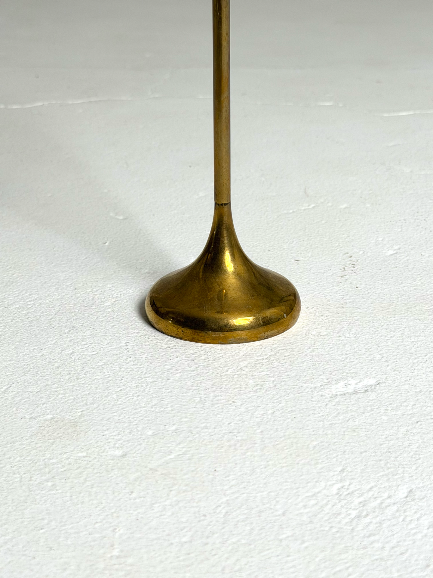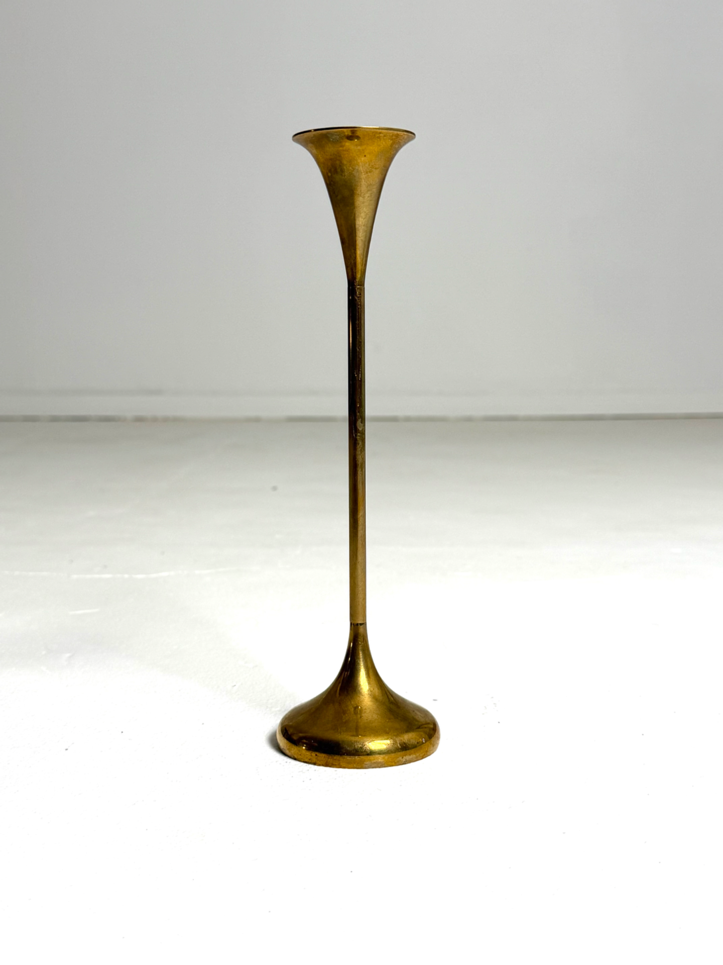 Pitkä ja siro messinkinen kynttilänjalka, jossa on kauniin kellomainen jalusta ja torvimainen yläosa. Minimalistinen mutta näyttävä esine, joka sopii niin yksin kuin osaksi kynttiläasetelmaa. Tanskalaista vintage-estetiikkaa parhaimmillaan.