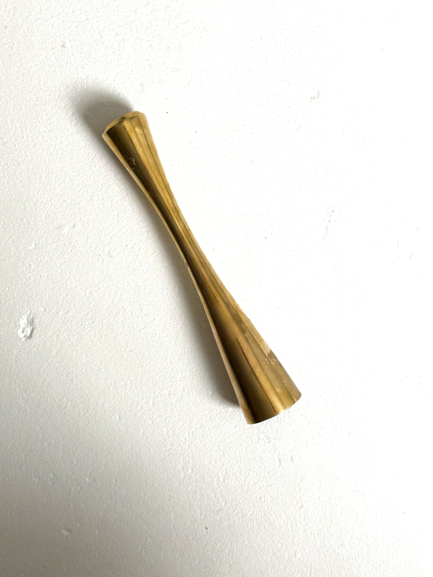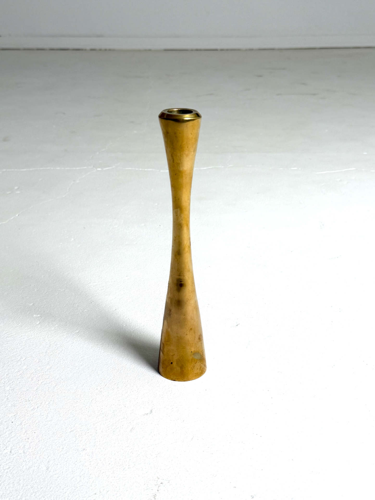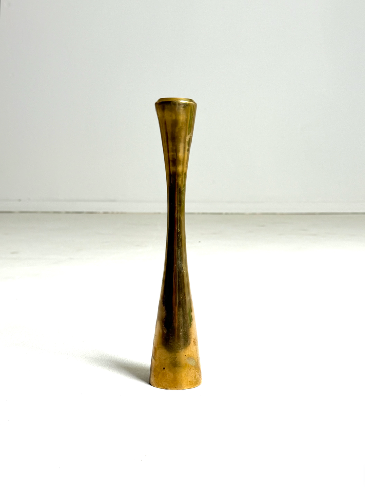 Tyylikäs ja sirolinjainen messinkinen kynttilänjalka 1960–70-luvun Tanskasta. Ajan patina antaa pinnalle kauniin elävyyden ja autenttisen vintage-ilmeen. Elegantti ja ajaton esine tuo tunnelmaa kattauksiin ja sisustukseen.