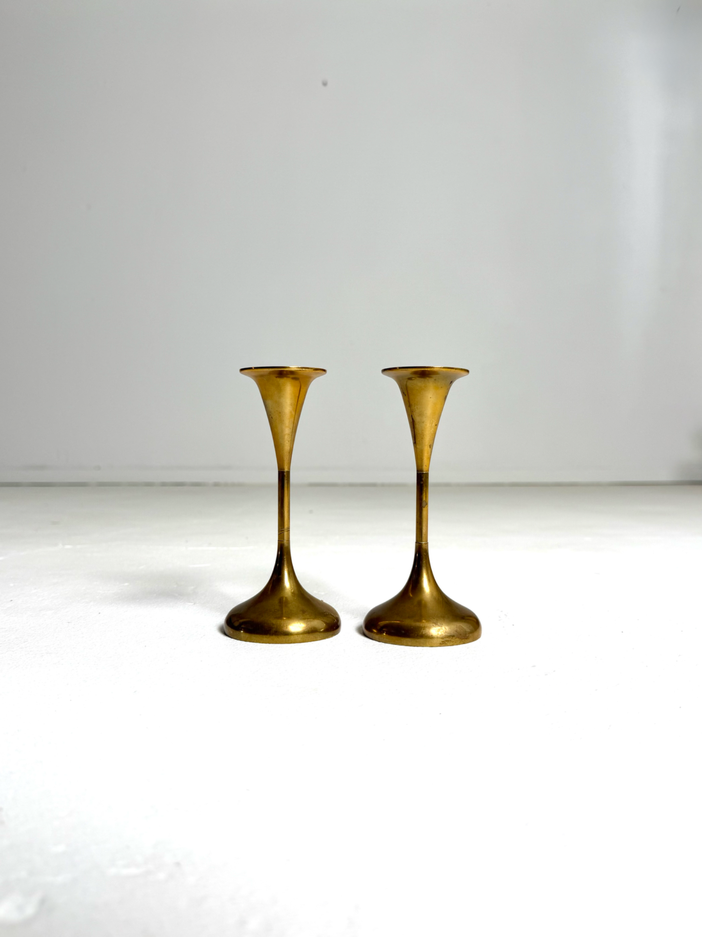 Skulpturaalinen ja elegantti kynttilänjalkapari 1960-luvun Tanskasta. Messingistä valmistetut jalat muistuttavat muotokieleltään trumpettia tai torvea ja tuovat tilaan veistoksellista ilmettä. Sopivat mainiosti esimerkiksi juhlakattaukseen tai tunnelmalliseksi yksityiskohdaksi hyllylle tai sivupöydälle. Kaunis patina kertoo esineiden iästä ja historiasta.